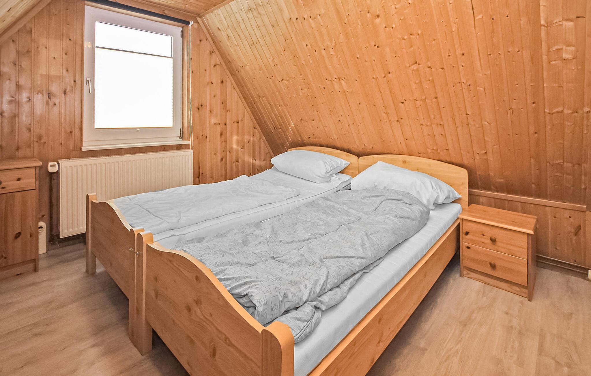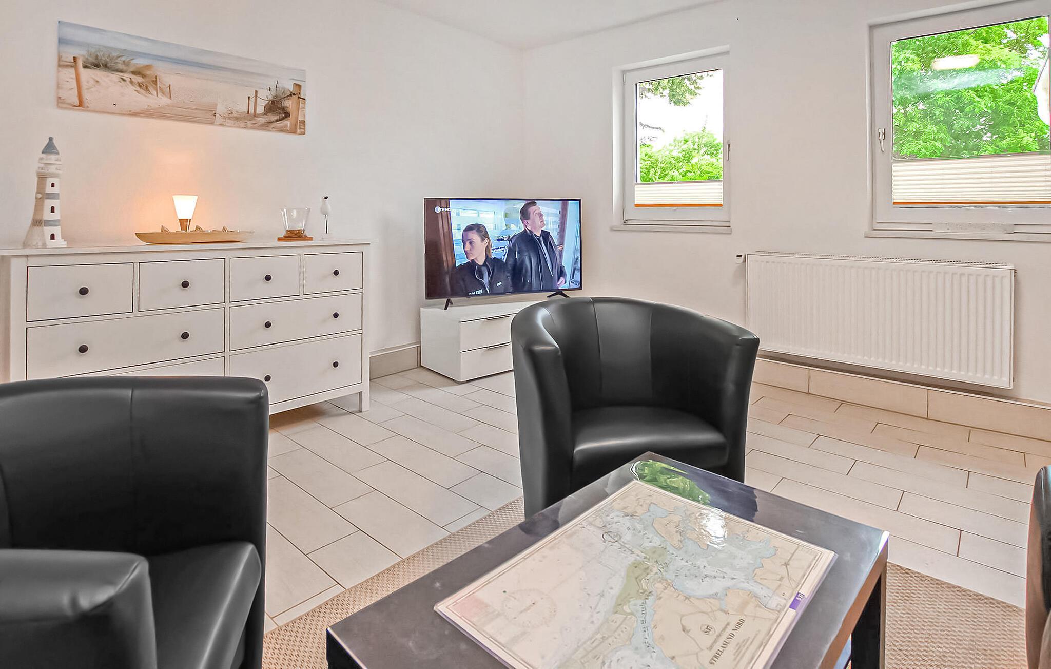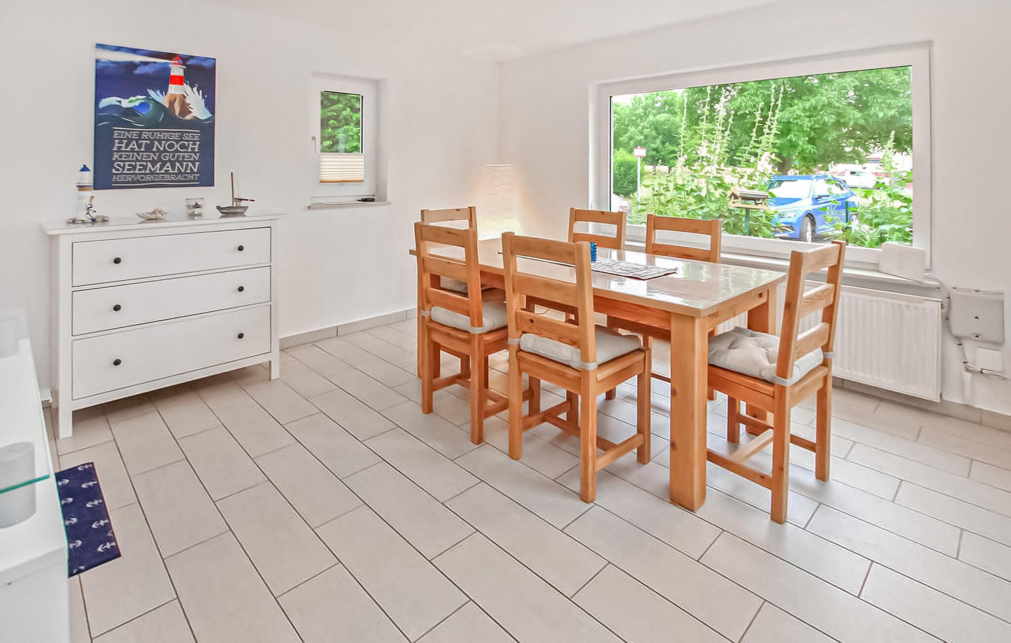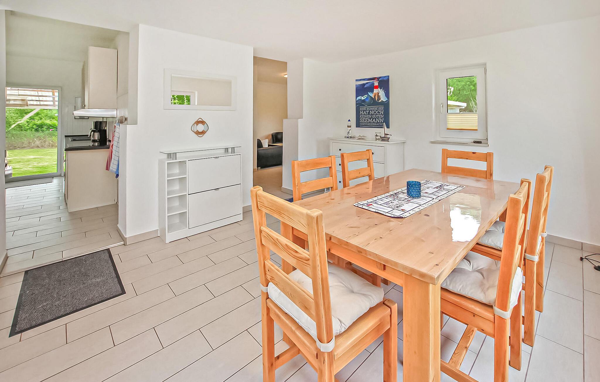 Das ca. 90 qm große, helle, zentral beheizte und mit Insektenschutz ausgestattete Nichtraucher-Ferienhaus erstreckt sich über zwei Etagen. Im Erdgeschoss befinden sich offen gestaltet der Wohnraum (Ledergarnitur, Flachbild-Smart-TV mit Streaming), ein Esszimmer (von hier schöner Blick zum Bodden) und die Küche (E-Herd mit Backofen, Kühlschrank mit Gefriermöglichkeit, Geschirrspüler, Waschmaschine, div. Küchenkleingeräte) sowie das Bad (Dusche, WC, Fön). Im Obergeschoss (über Treppe erreichbar) gibt es zwei Schlafzimmer (1 x Doppelbett, Flachbild-TV, 1 x zwei Einzelbetten).