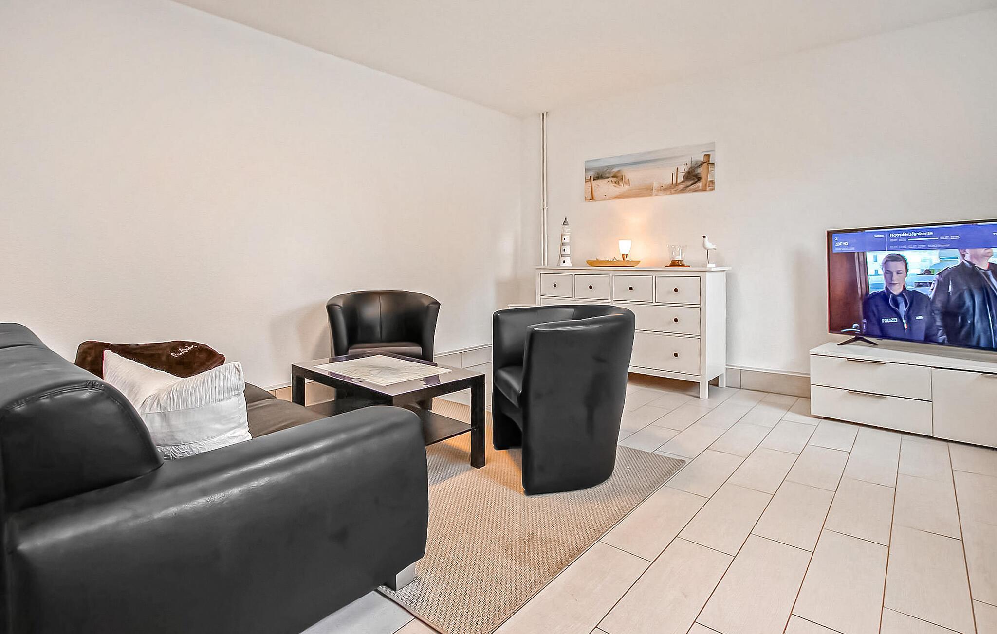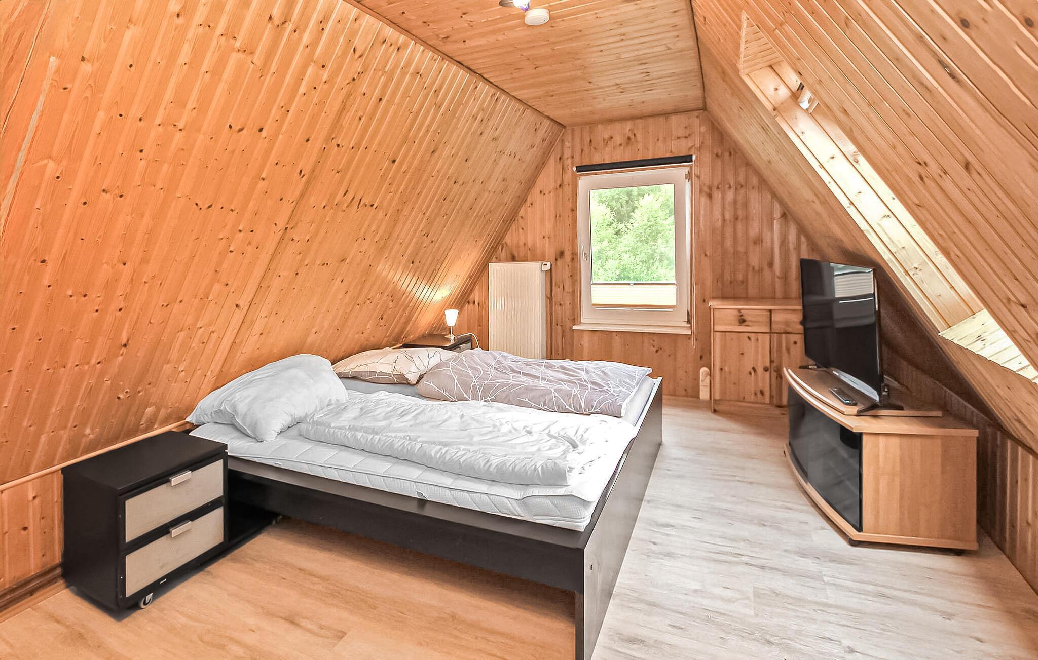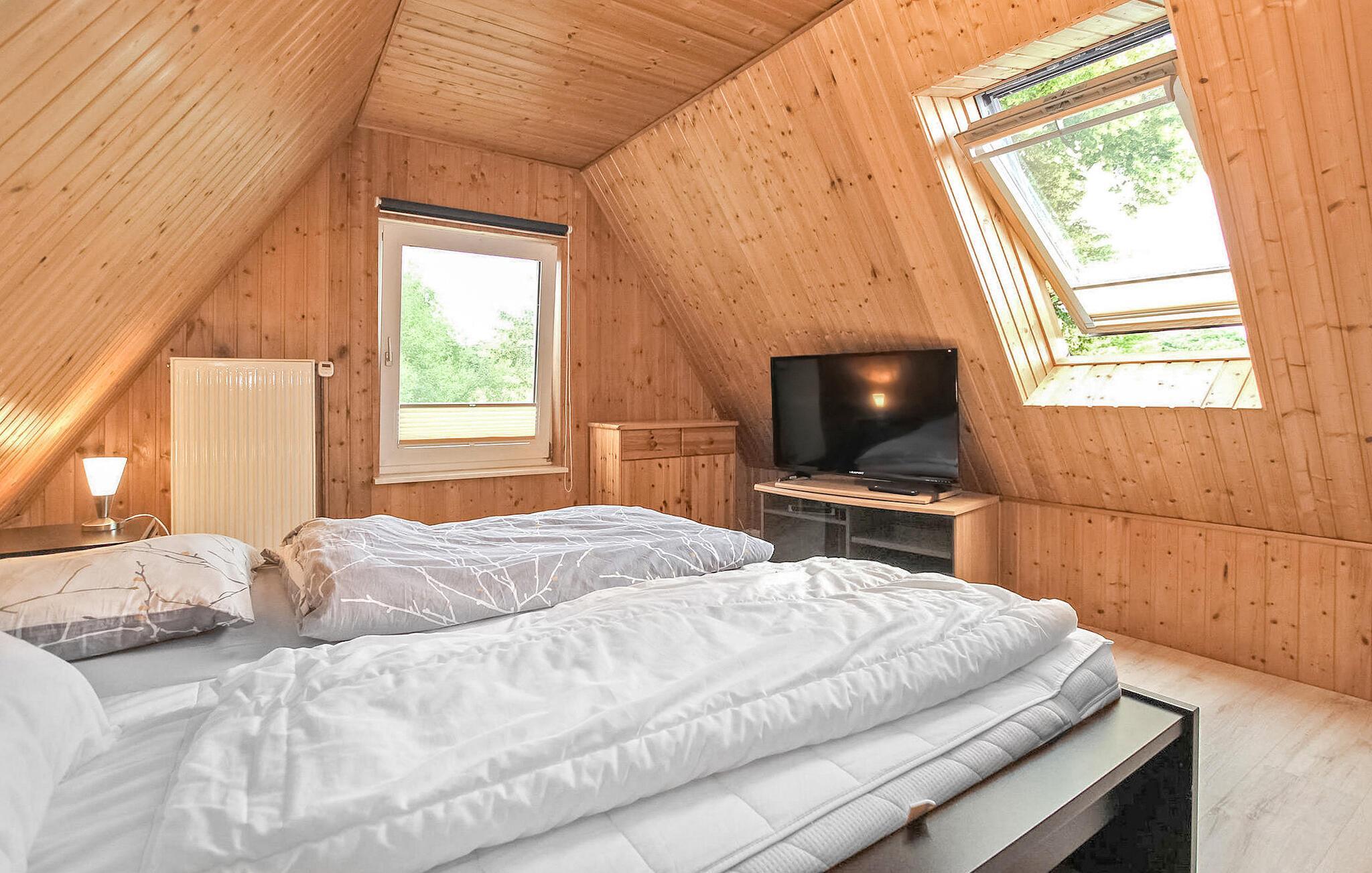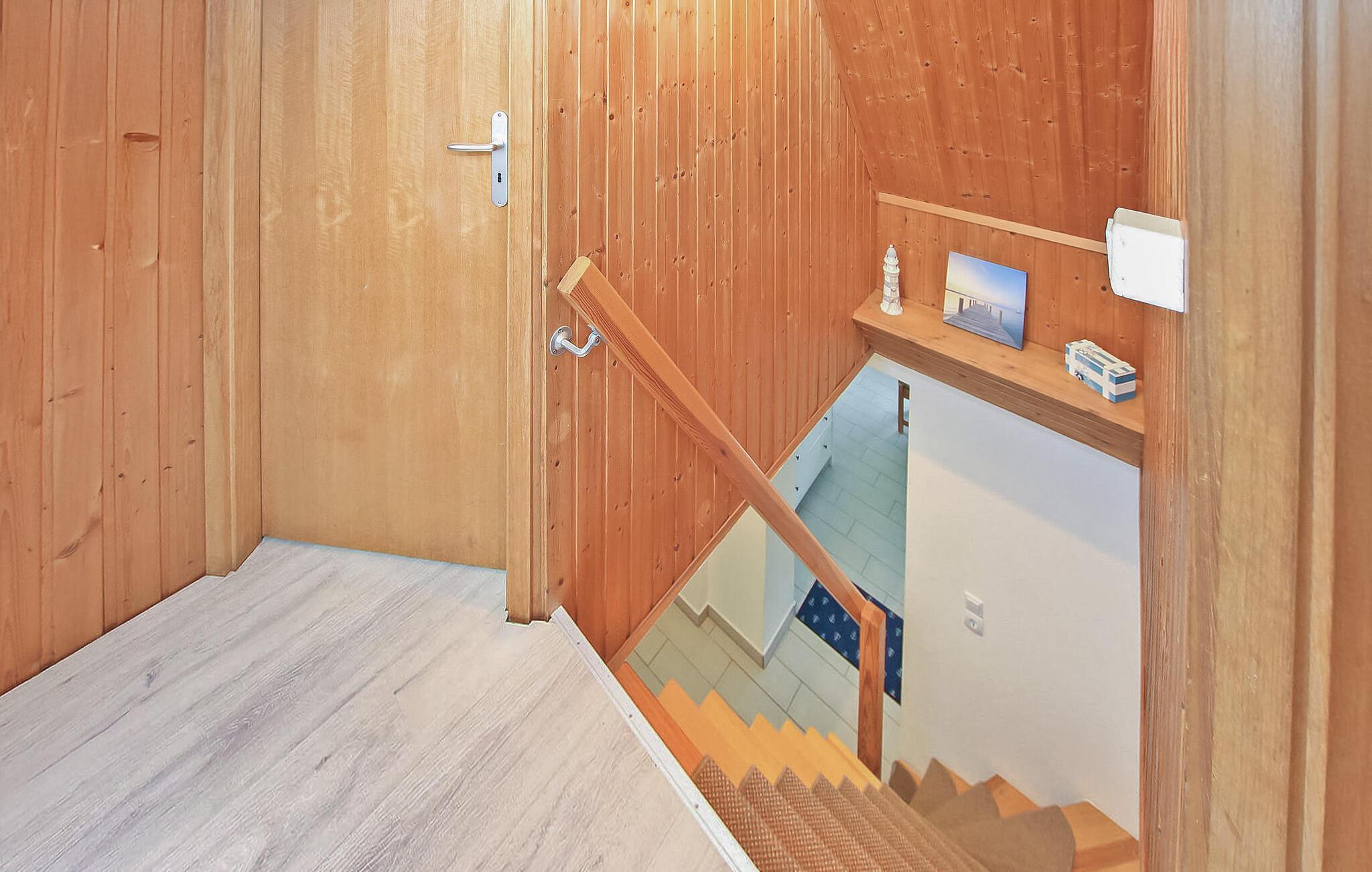 Das ca. 90 qm große, helle, zentral beheizte und mit Insektenschutz ausgestattete Nichtraucher-Ferienhaus erstreckt sich über zwei Etagen. Im Erdgeschoss befinden sich offen gestaltet der Wohnraum (Ledergarnitur, Flachbild-Smart-TV mit Streaming), ein Esszimmer (von hier schöner Blick zum Bodden) und die Küche (E-Herd mit Backofen, Kühlschrank mit Gefriermöglichkeit, Geschirrspüler, Waschmaschine, div. Küchenkleingeräte) sowie das Bad (Dusche, WC, Fön). Im Obergeschoss (über Treppe erreichbar) gibt es zwei Schlafzimmer (1 x Doppelbett, Flachbild-TV, 1 x zwei Einzelbetten).