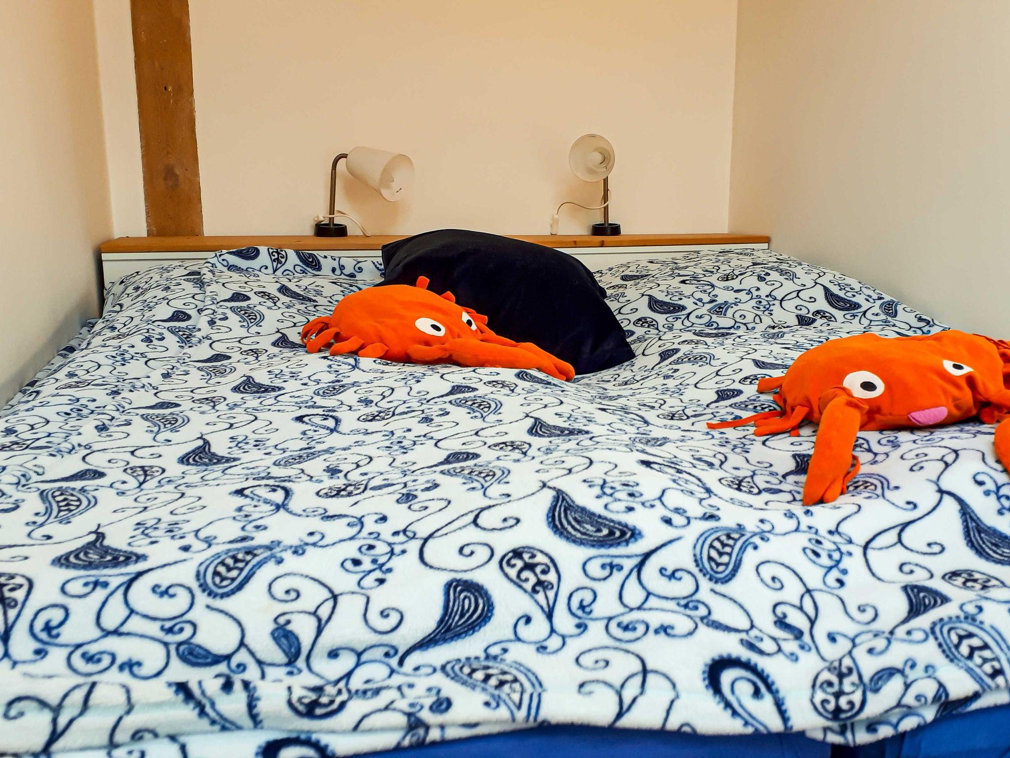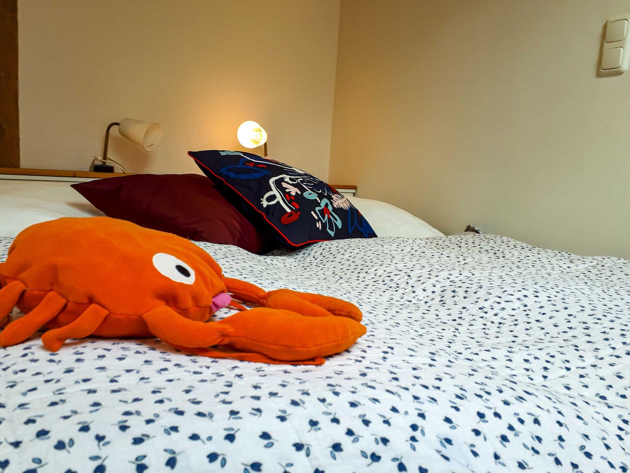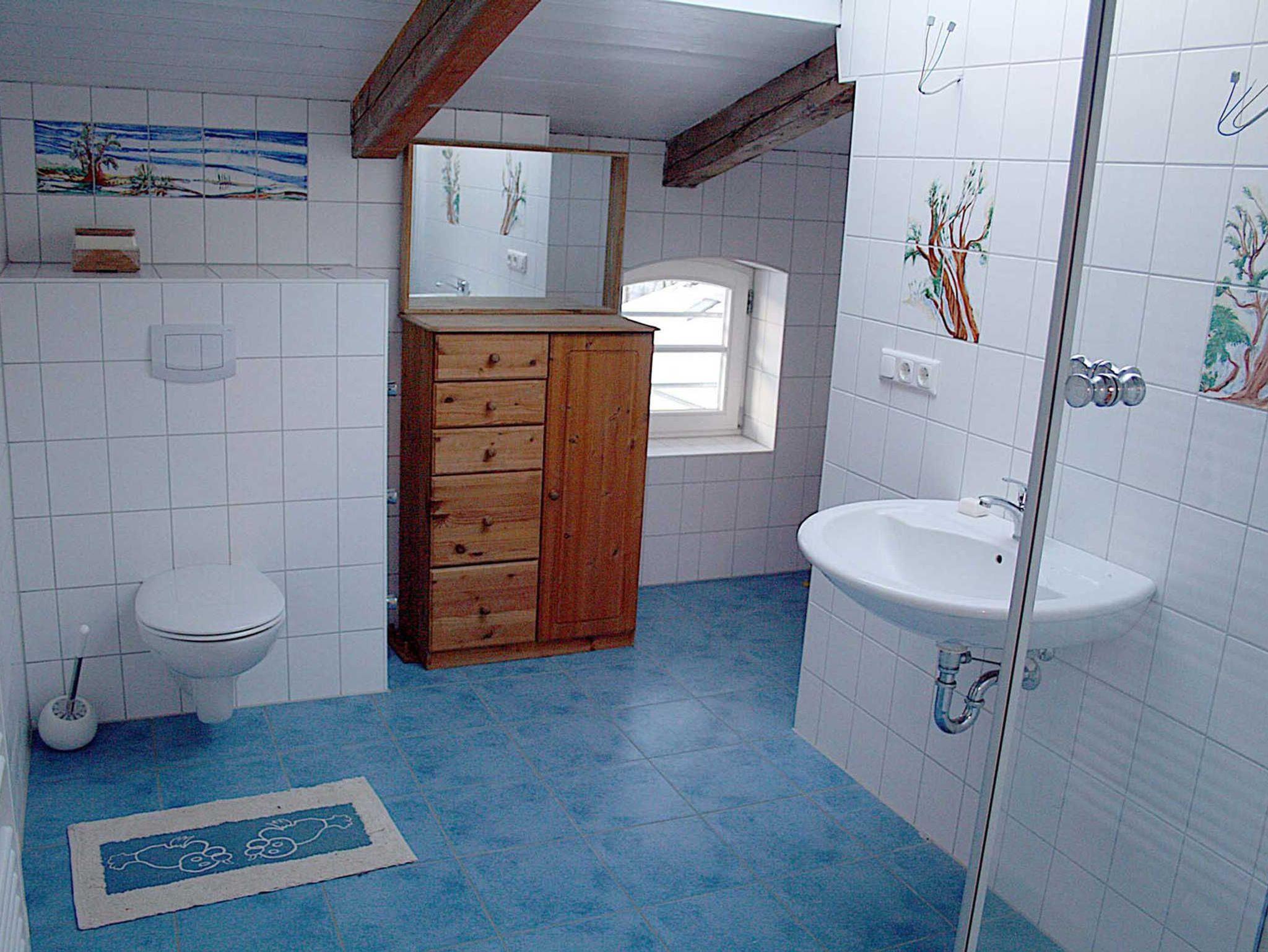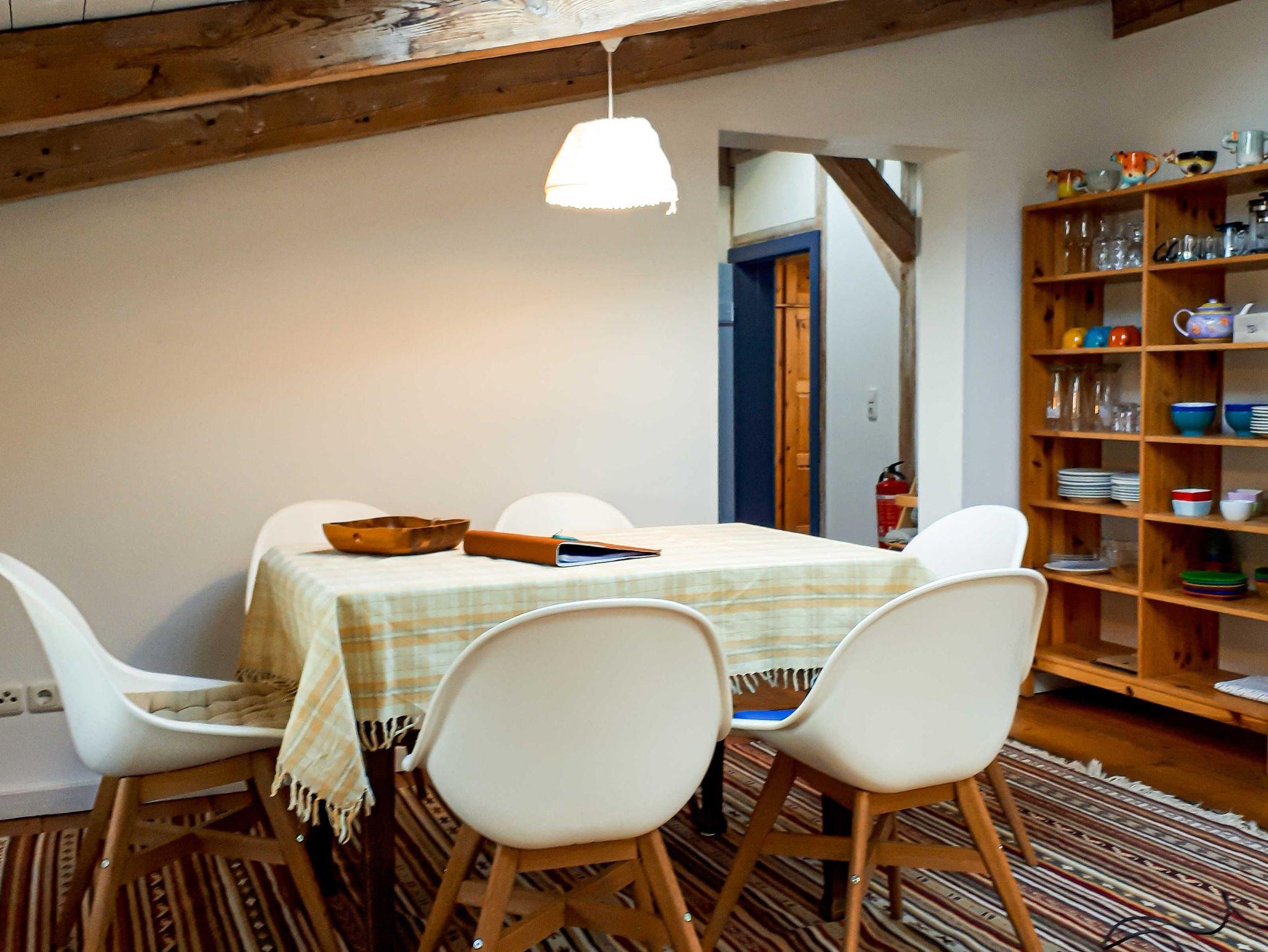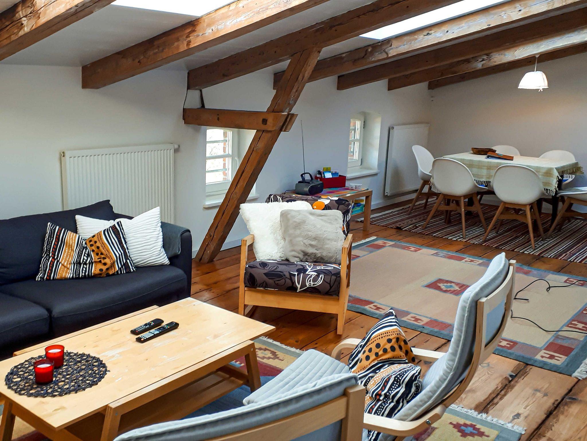 Diese charmante Ferienwohnung im Dachgeschoss verbindet rustikalen Charme mit viel Platz für bis zu 6 Personen. Auf 96 m² erwartet dich eine heimelige Atmosphäre mit Dachschrägen und sichtbaren Holzbalken, die der Wohnung eine ganz besondere Gemütlichkeit verleihen. Das Wohnzimmer mit Sofa, Sesseln und TV lädt zum Entspannen ein. In der separaten Küche kannst du mit Backofen, Herd, Kühlschrank und Spülmaschine problemlos deine Lieblingsgerichte zubereiten. In den drei separaten Schlafzimmern findet jeder seinen perfekten Schlafplatz: Während das Hauptschlafzimmer mit einem Doppelbett (160x200) ausgestattet ist, stehen in den beiden anderen Zimmern jeweils zwei Einzelbetten (90x200) zur Verfügung. Das Badezimmer mit Dusche sorgt für Erfrischung am Morgen und Entspannung am Abend. Die Wohnung ist über eine steile Treppe erreichbar ? doch wer einmal oben angekommen ist, wird mit einer besonders gemütlichen Atmosphäre belohnt!