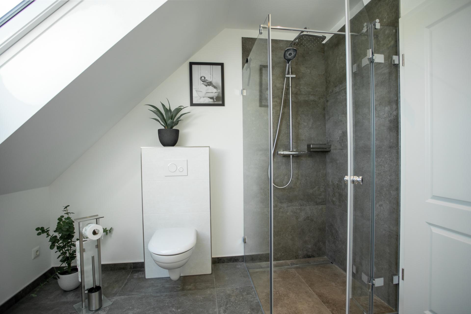 Das Haus bietet zwei moderne Badezimmer: im Obergeschoss ein Vollbad mit Badewanne und Schauerdusche, im Erdgeschoss ein weiteres Badezimmer mit Walk-in Schauerdusche.
