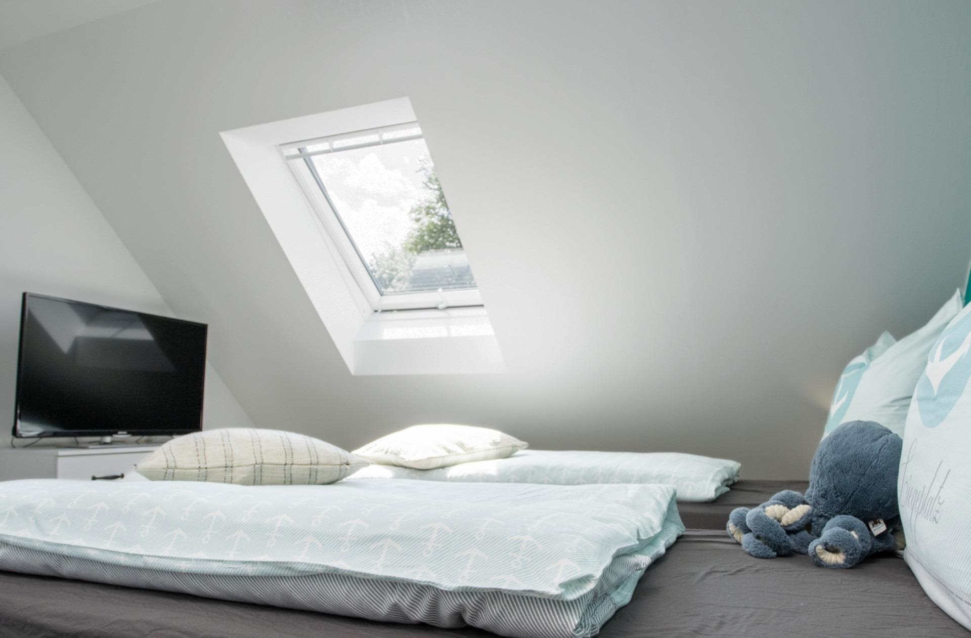 Die drei liebevoll gestalteten Schlafzimmer im Obergeschoss sind mit komfortablen Boxspringbetten ausgestattet – zwei Schlafzimmer jeweils mit einem 1,80 x 2,00 m Boxspringbett und großem Kleiderschrank. Das dritte Schlafzimmer mit zwei zusammen schiebbaren Einzelbetten je 1,00 x 2,00 m. Das Schlafzimmer verfügt über einen kleinen Kleiderschrank, Kommode, Nachttische und einen 40 Zoll Flatscreen-TV.