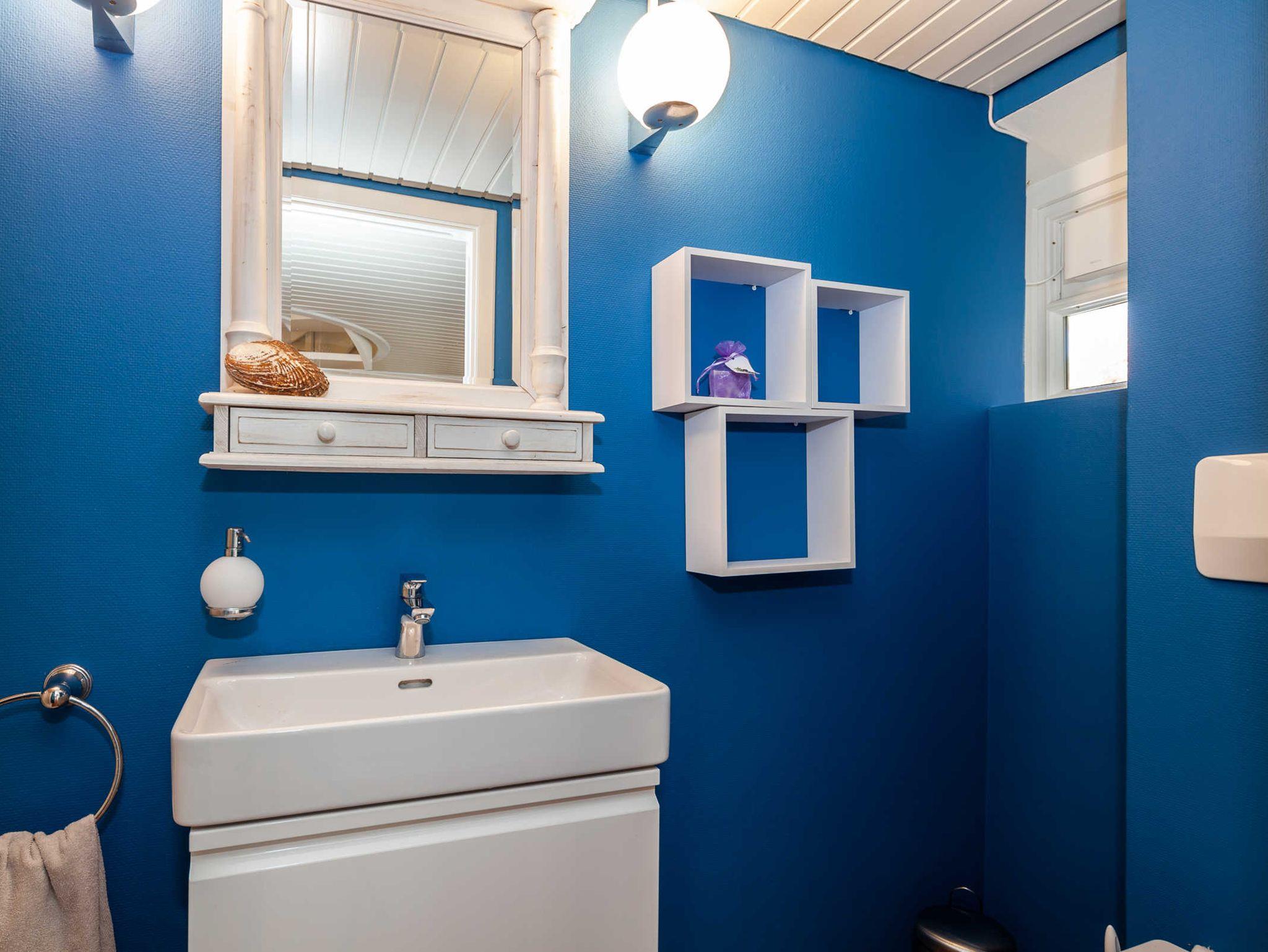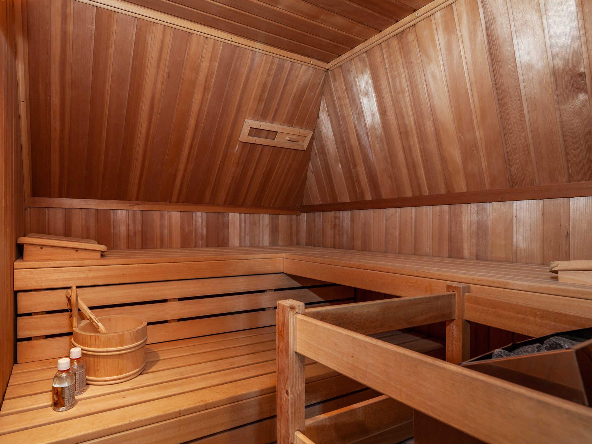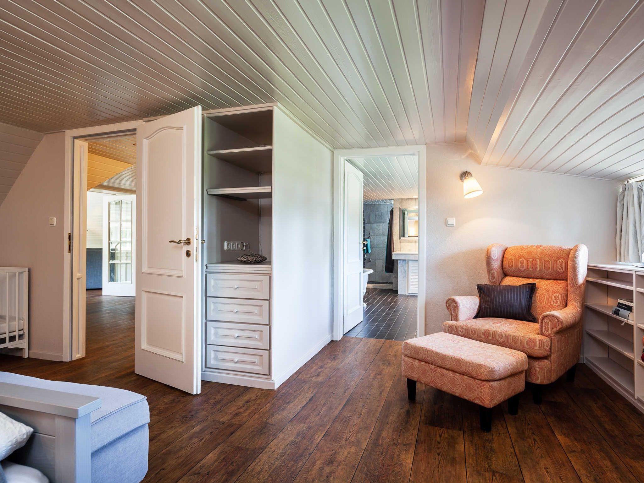 Über die urige Wendetreppe gelangen die Gäste in den oberen Bereich des Ferienhauses. Hier befindet sich ein weiteres Schlafzimmer mit einem Doppelbett und Kleiderschrank. Es schließt sich das zweite Bad an, das sich mit echten Marmorfliesen und einer freistehenden Badewanne schmückt. Die geschlossene Sauna ist ein besonderes Highlight für kühlere Tage. Nach dem Saunagang lässt es sich herrlich von der Mamorbank mit Blick auf den See entspannen. Desweiteren gibt es einen Duschbereich mit Duschbrause und Abspülschlauch nach dem Saunagang.