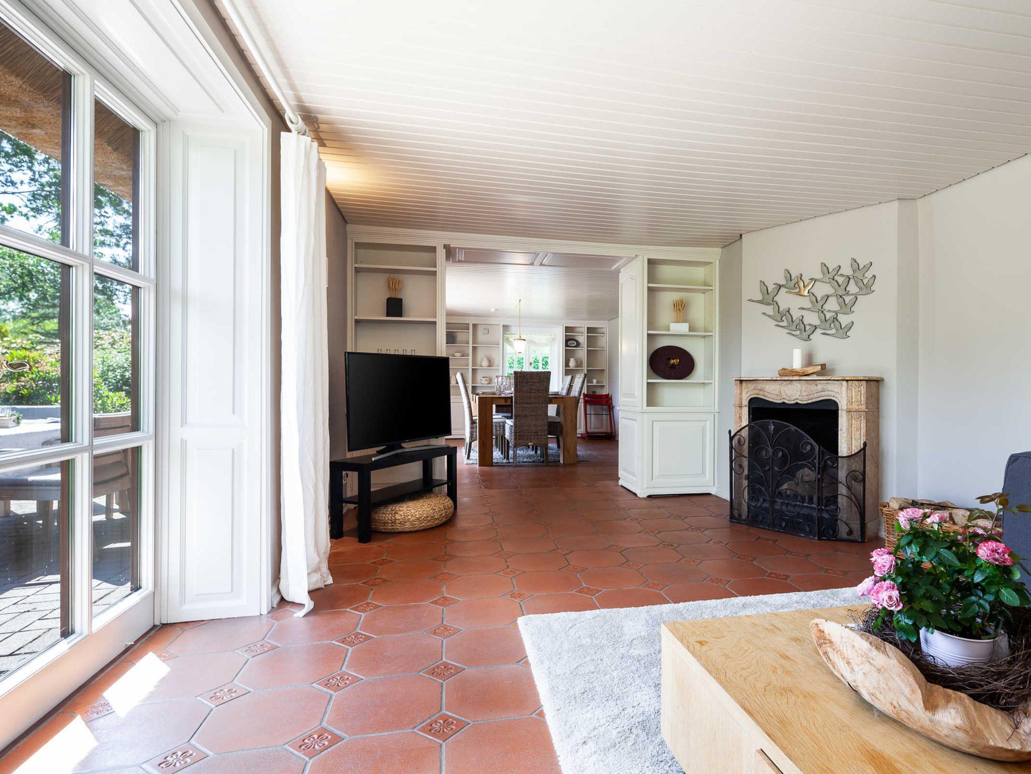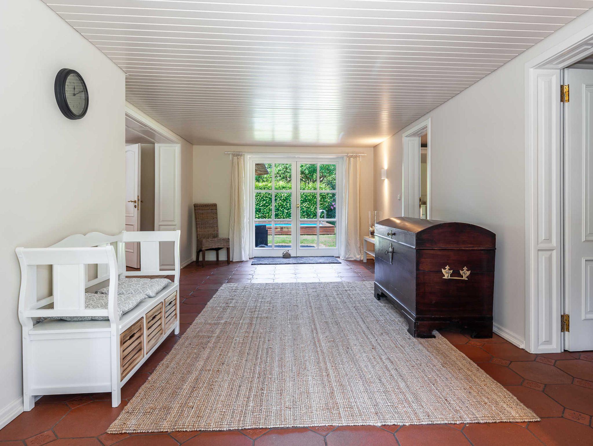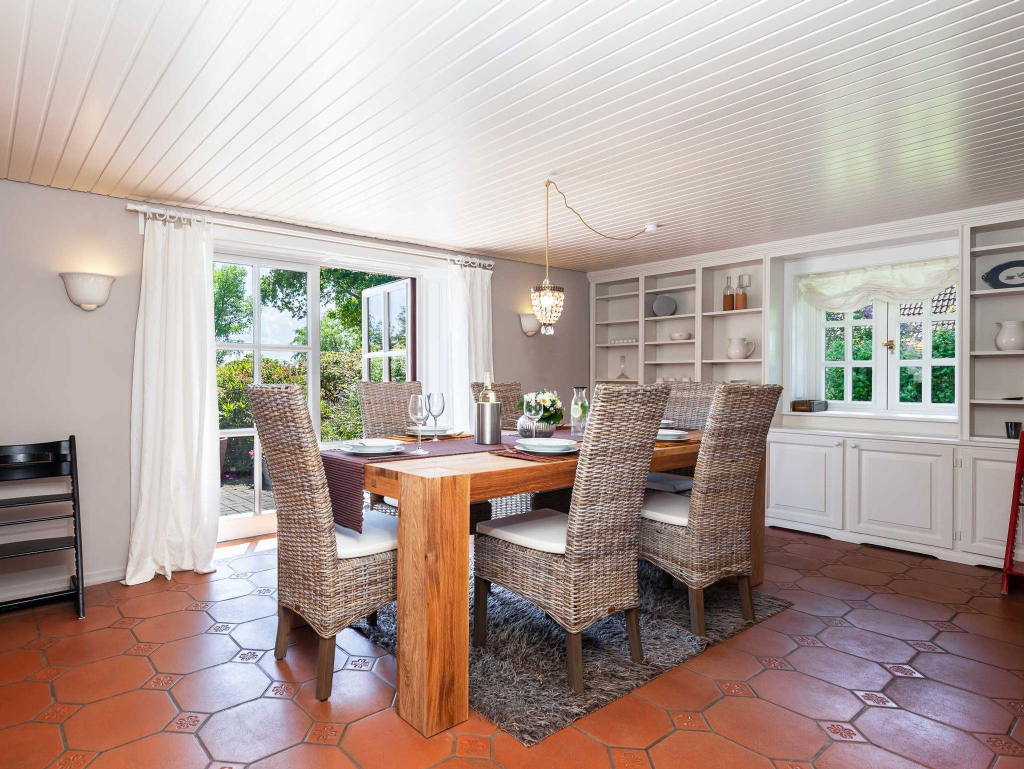 Das Ferienhaus heißt seine Gäste in einem großen weiten Flur mit angrenzendem Garderobenbereich willkommen. Der Wohnbereich mit Kamin und gemütlicher Sofaecke ermöglicht auch den direkten Zugang auf die möblierte Sonnenterrasse mit Blick auf den See. Das separate Esszimmer bietet am großen Esstisch ausreichend Platz für alle Gäste und lädt zu gemütlichen gemeinsamen Urlaubsessen ein.