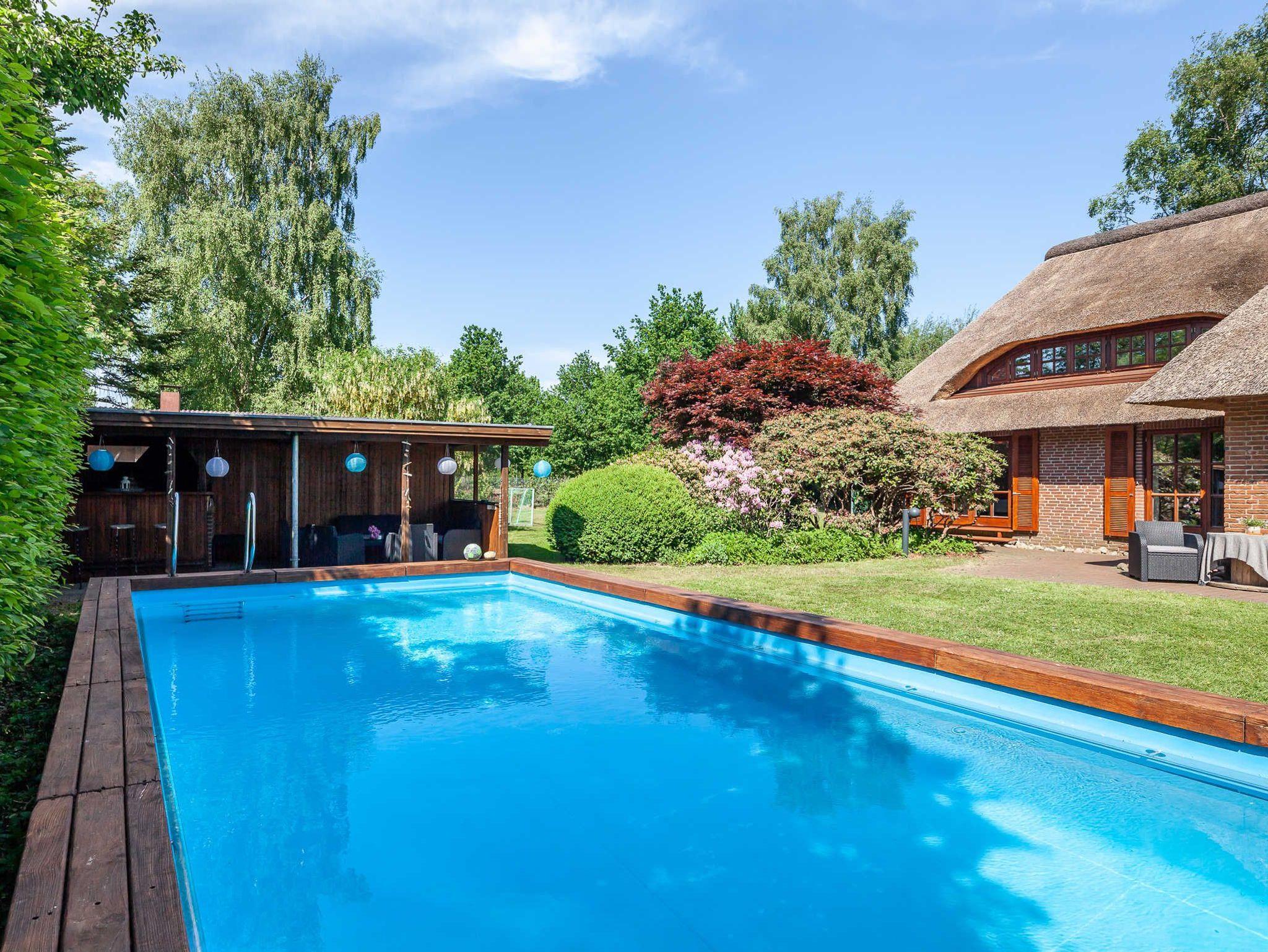 Der Garten rund um das Ferienhaus ist 2500 qm groß, komplett eingezäunt und bietet mit dem leuchtend blauen großen Pool, der überdachten Poolbar und der gemütlichen Grillecke einen einmalig schönen Teil des Außenbereiches. Der weitläufige Garten hat aber noch viele weitere Ecken zum Verstecken, zum Spielen, Toben und Freude haben. Auf der Spielwiese gibt es Fußballtore und Balancierbalken für die kleinen und die großen Gäste, dazu noch jede Menge weiteres tolles Outdoor Spielzeug. Bis zu 2 tierische Freunde (Hunde) sind im Urlaub im Ferienhaus REETselig herzlich willkommen.