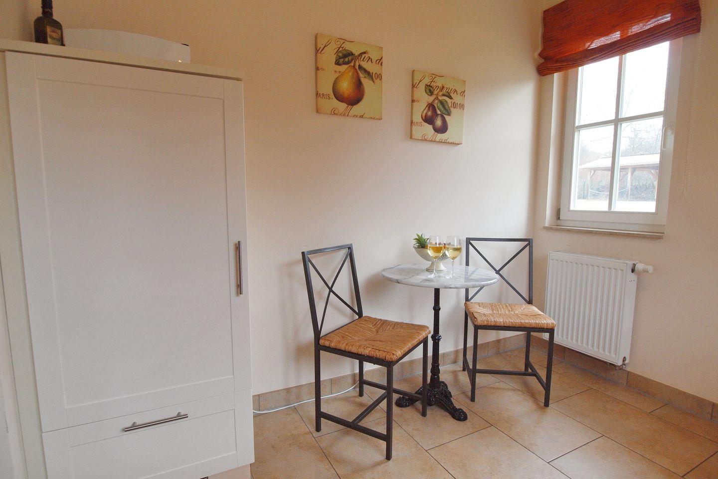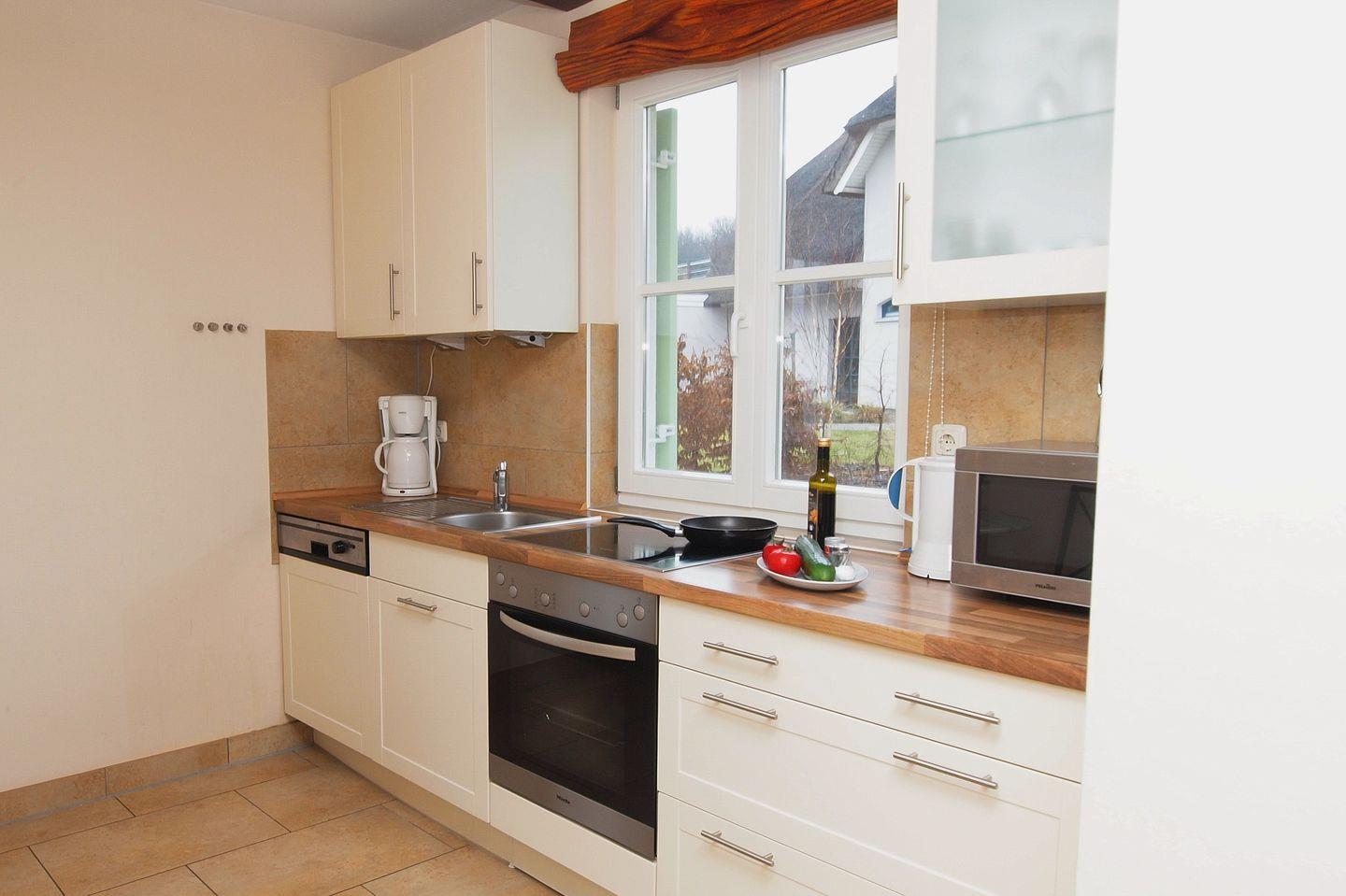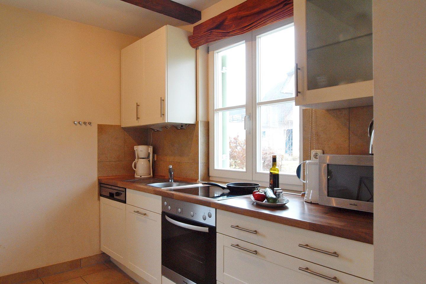 Die Einbauküche ist mit einem Cerankochfeld (4 Kochzonen), einem Backofen, einem Geschirrspüler sowie einem Kühlschrank mit Gefrierfach und einer Mikrowelle voll ausgestattet. Ein Toaster, ein Wasserkocher und eine Kaffeemaschine vervollständigen die Küchenausstattung.