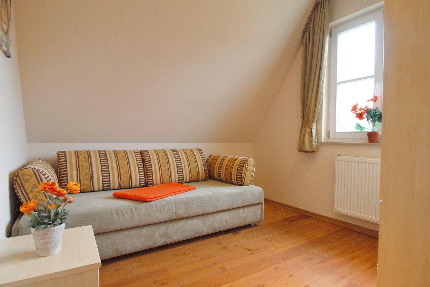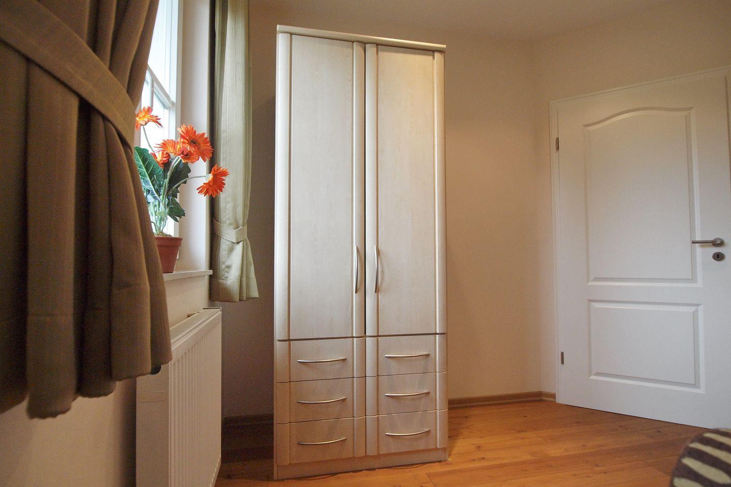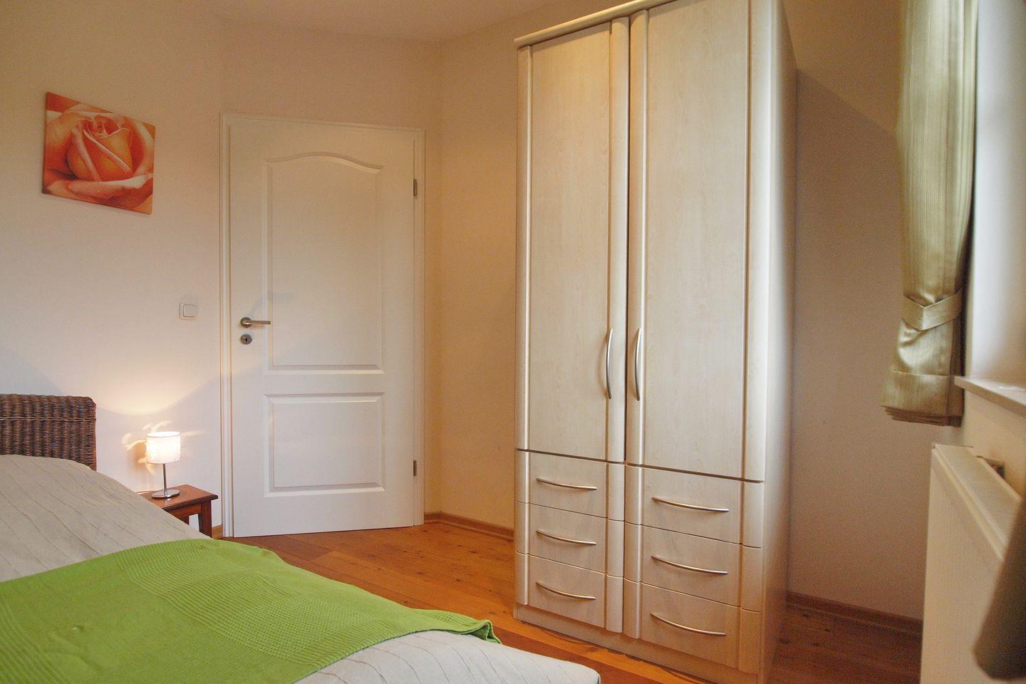In der oberen Etage befinden sich 3 Schlafzimmer. Das erste Schlafzimmer ist mit einem komfortablen Boxspringbett (180 x 200 cm) und einem großen Kleiderschrank eingerichtet. Im zweiten Schlafzimmer erwartet dich ein Doppelbett (140 x 200 cm) zur Nachtruhe. Für dein Urlaubsgepäck ist auch hier ein Kleiderschrank vorhanden. Die ausziehbare Schlafcouch (170 x 200 cm) im dritten Schlafzimmer bietet 2 weiteren Personen einen gemütlichen Schlafplatz. Ein Kleiderschrank dient als Stauraum für deine Kleidung. Zum Verdunkeln kannst du in allen Schlafzimmern Vorhänge nutzen.
