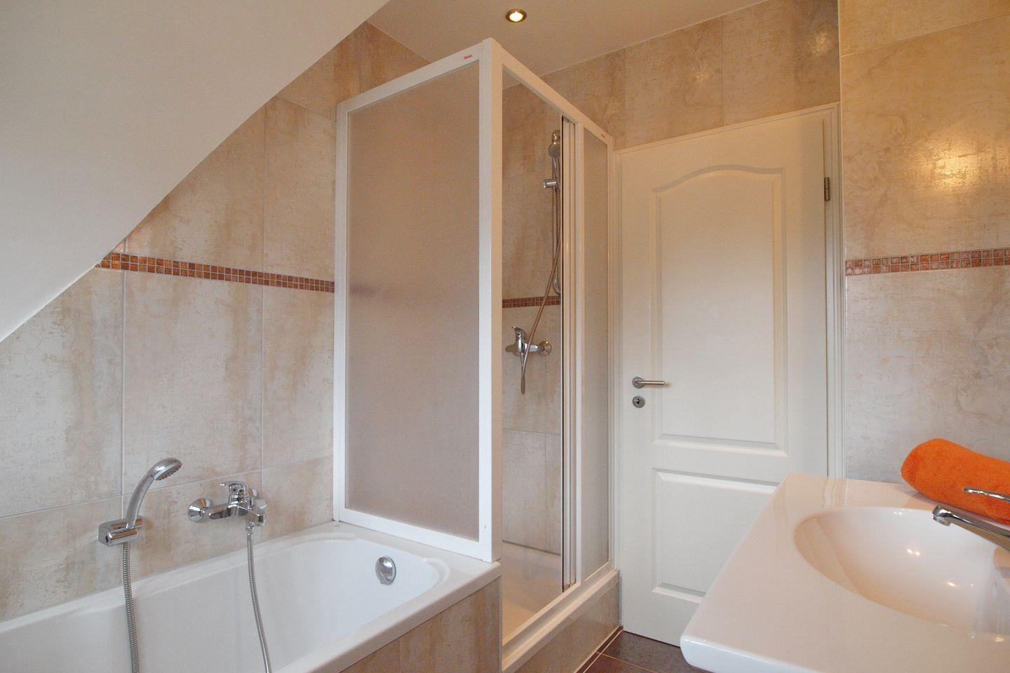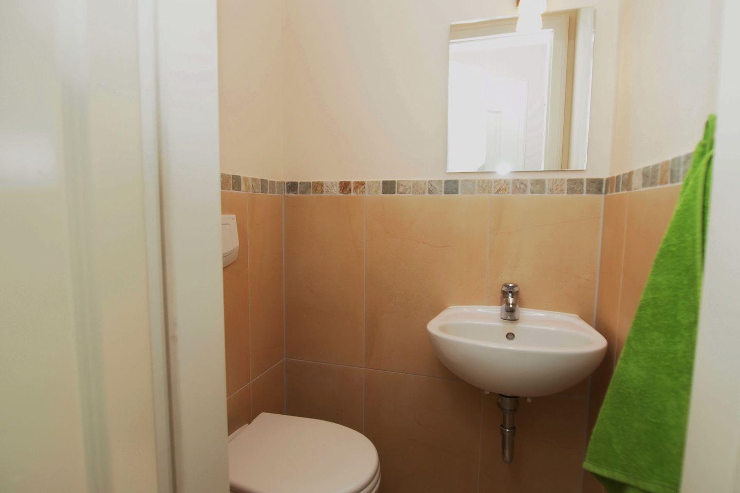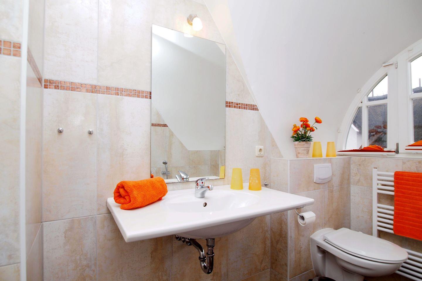 Zum Tageslichtbad im Obergeschoss mit Wanne, Dusche und WC gehören ein Waschtisch mit beleuchtetem Spiegel sowie ein Handtuchtrockner und ein Föhn. Plissees dienen hier als Sichtschutz. Im gesamten Erdgeschoss sowie im Bad des Obergeschosses sind Bodenfliesen verlegt. Die Schlafräume sind mit einem Holzboden ausgestattet. Das Rauchen ist im Haus „Hanni" nicht gestattet. Haustiere sind willkommen.