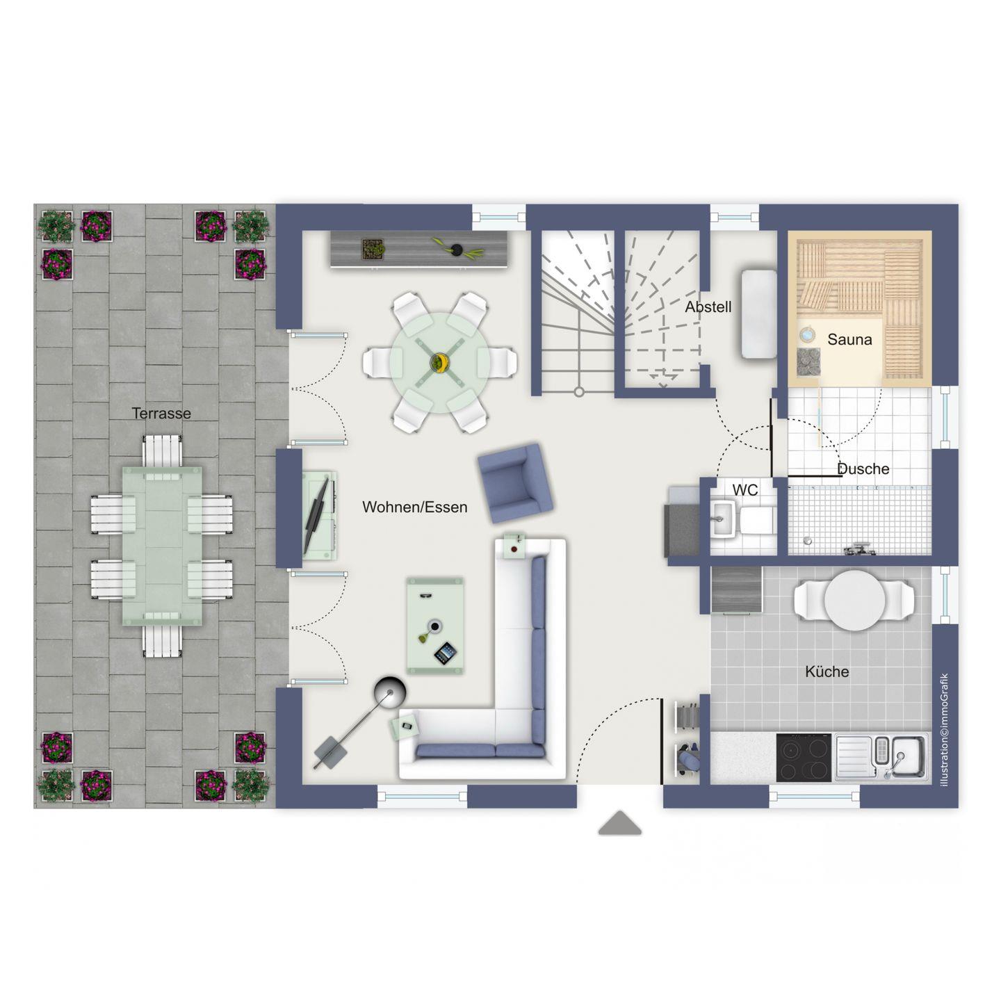 Im Erdgeschoss des Ferienhauses befindet sich der Wohnbereich. Hier laden eine Eckcouch und ein Sessel zu gemütlichen Abendstunden ein. Zur Unterhaltung stehen ein Flatscreen-TV, ein DVD-Player sowie eine Stereoanlage bereit. Der Essbereich ist im großzügigen Wohnbereich integriert und bietet viel Platz für gemeinsame Mahlzeiten. Der Kamin sorgt besonders in den kälteren Monaten für wohlige Wärme und Gemütlichkeit. Vom Wohnbereich aus hast du Zugang zur sonnenverwöhnten Terrasse.