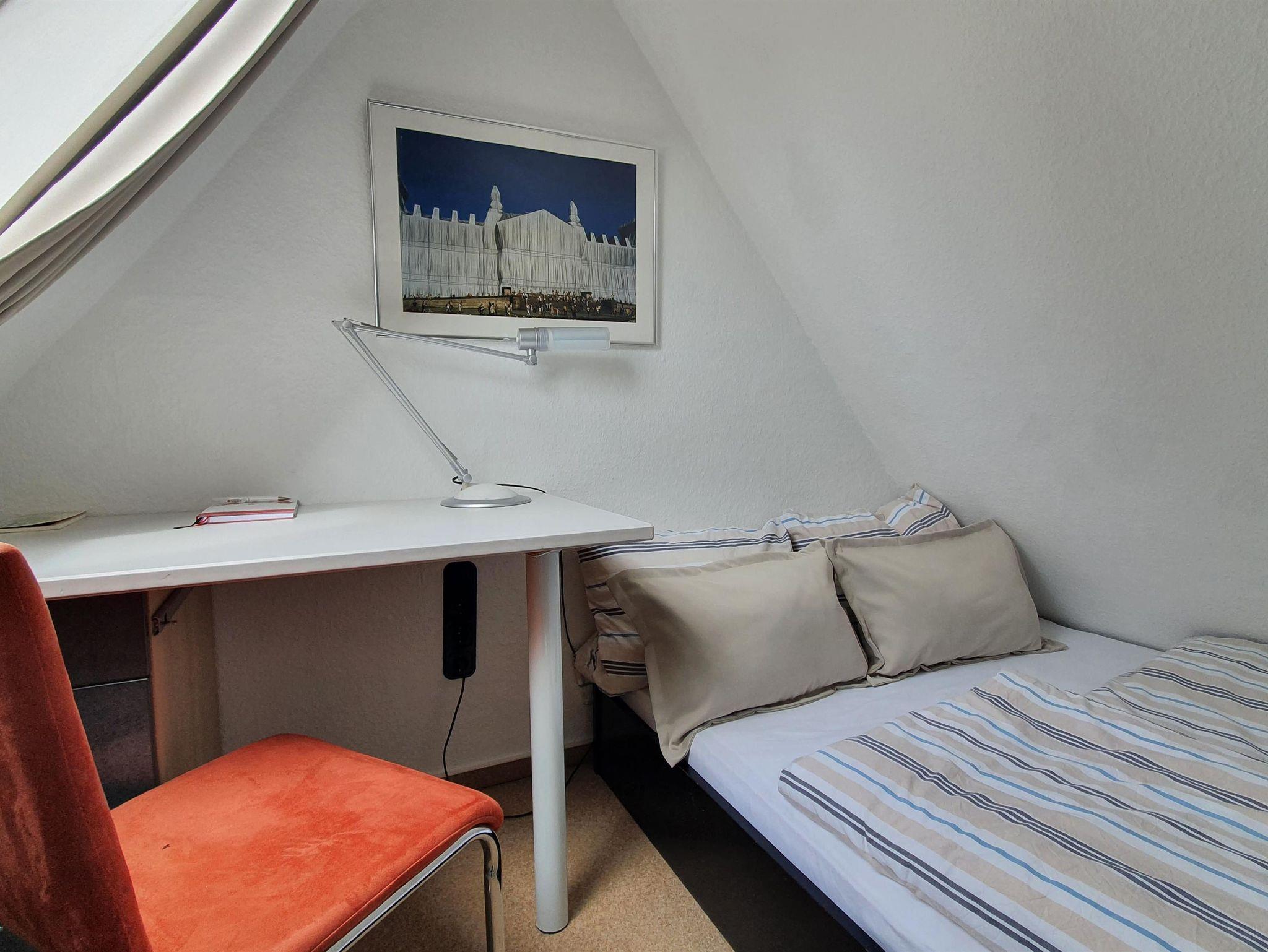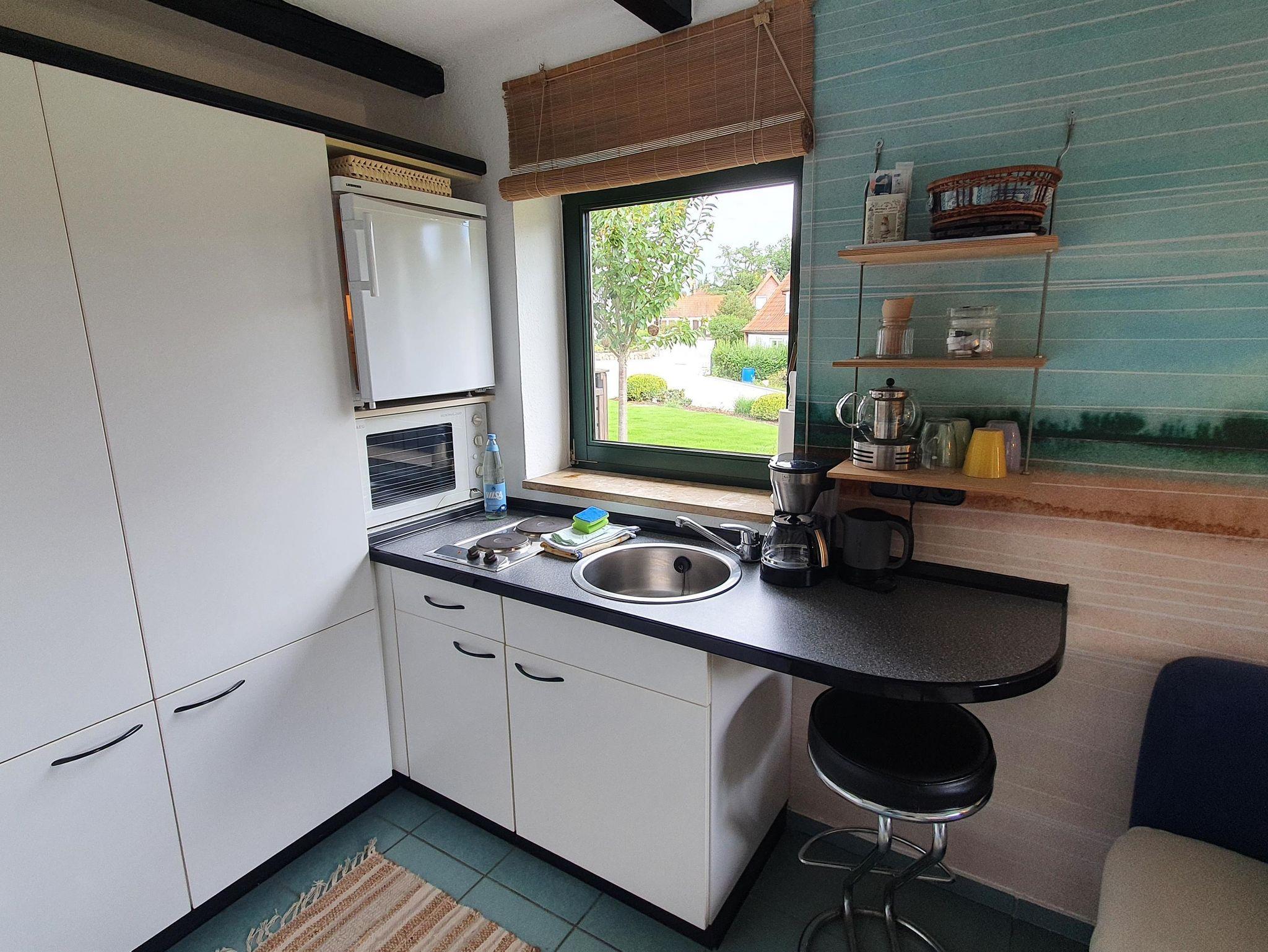 Kochnische im Wohnbereich, sehr steile Treppe zum Schlafboden (Bett 140 x 200cm) auf der Galerie unter der Schräge. Duschbad.