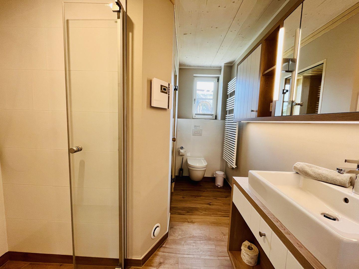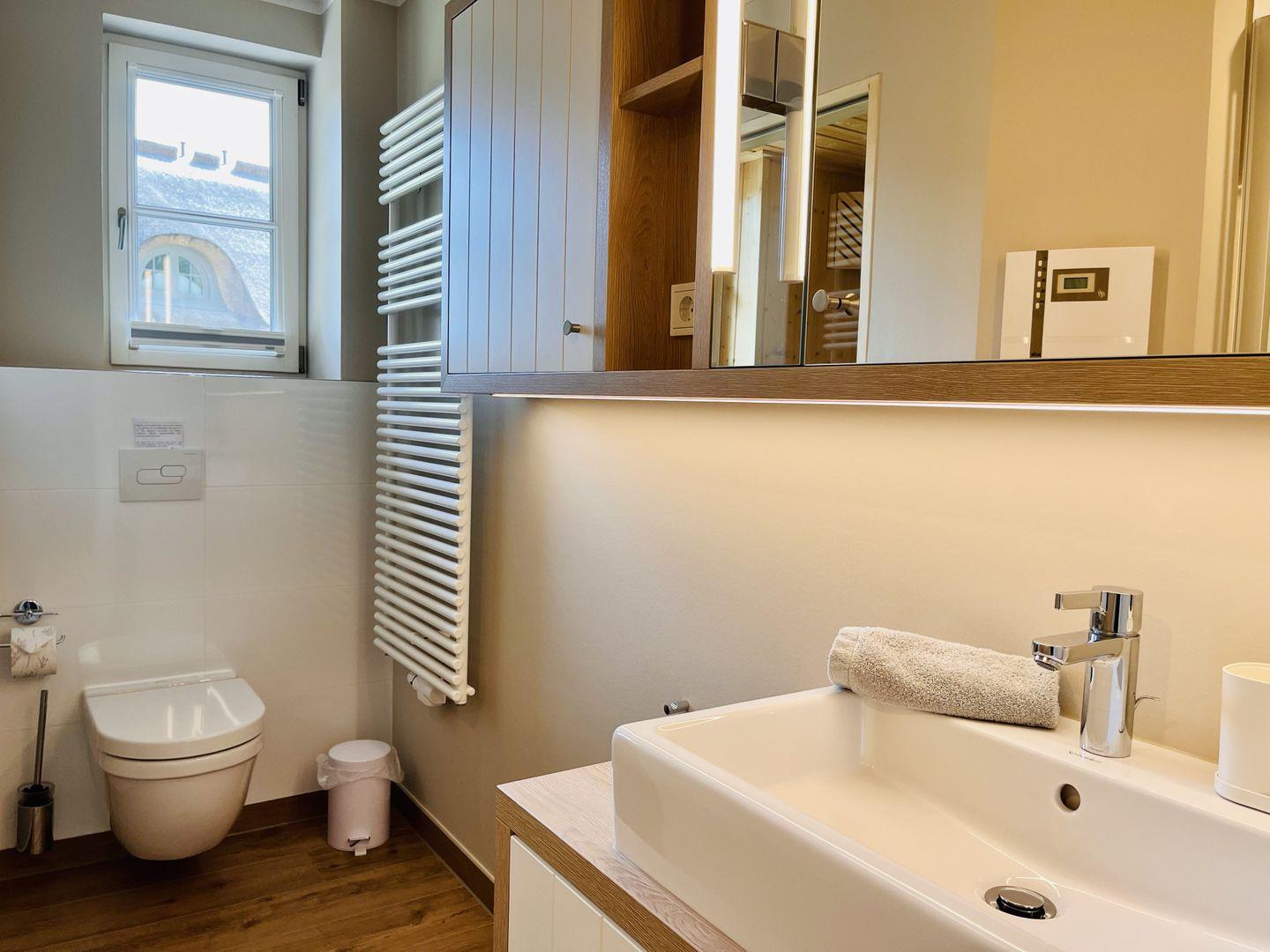 Zwei Bäder mit Dusche und WC sorgen für genügend Raum zum Frischmachen. Das Bad im EG ist zudem mit einer Finnischen Sauna ausgestattet. Bei Anreise liegen Handtücher für Sie bereit und die Betten sind bezogen.