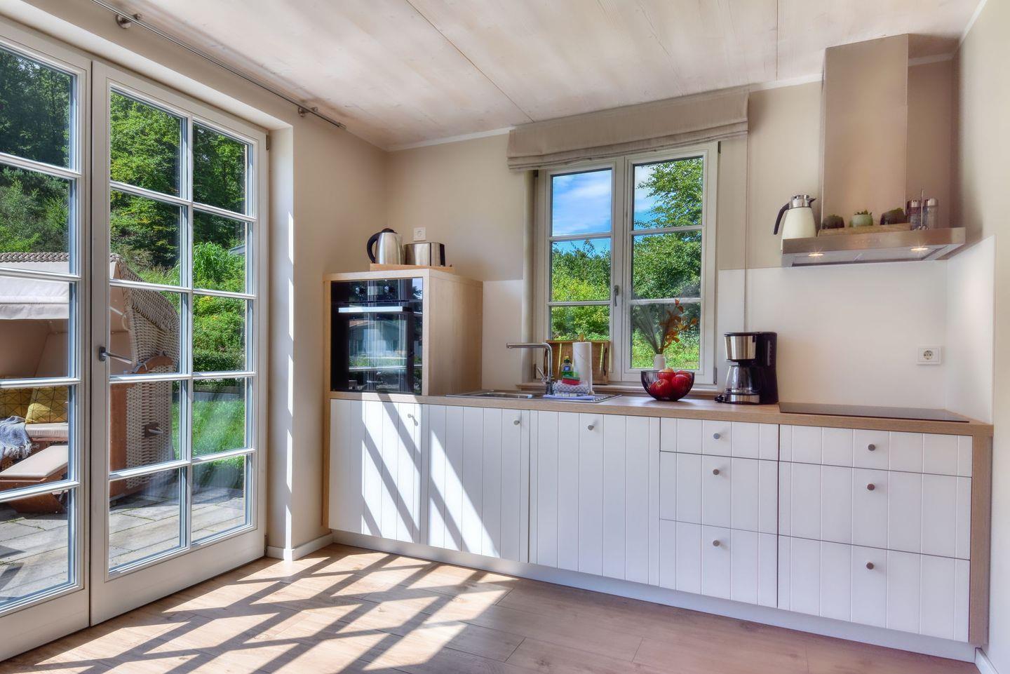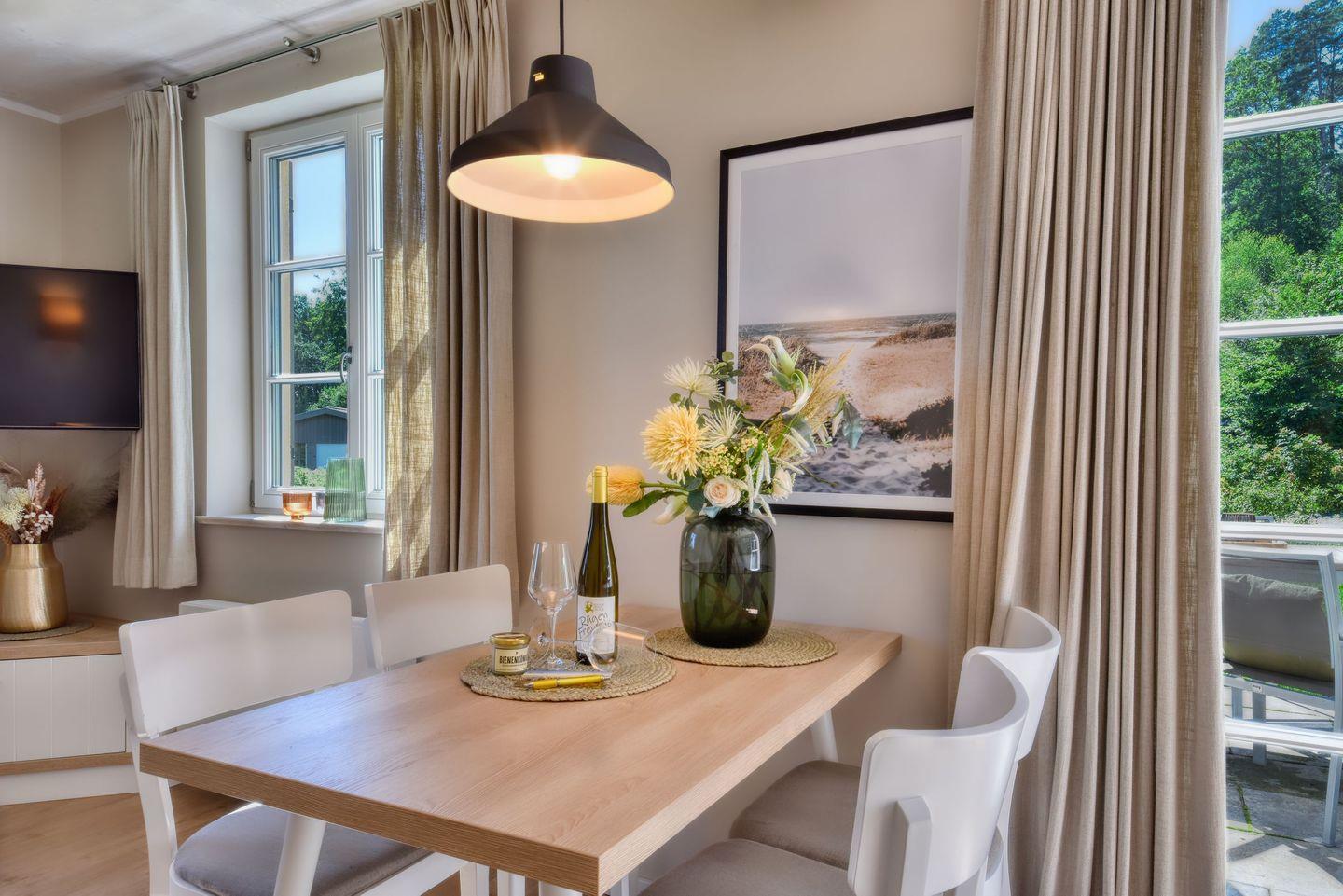 Öffnen Sie die bodentiefen Fenster mit integrierter Fliegengittertür zu Ihrer Westterrasse und genießen Sie die frische Ostseebrise. Hier lässt es sich ausgezeichnet frühstücken.