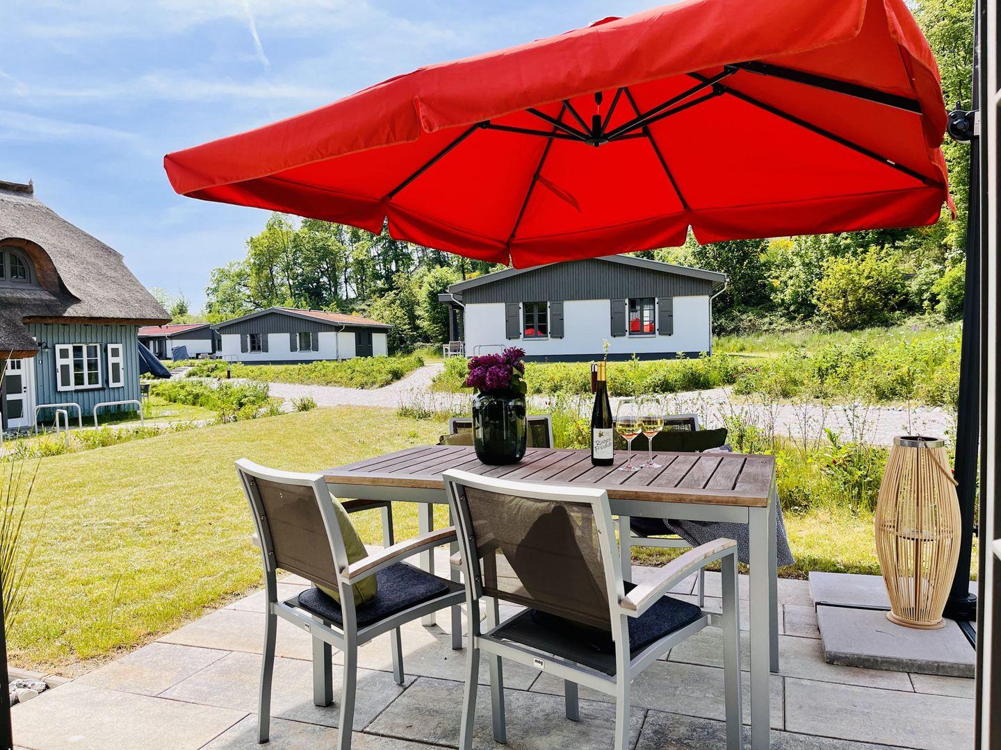 Moderne Ferienhaushälfte mit Garten, Sauna und Ostseeblick im Feriendorf Klein Stresow, ideal für erholsame Natururlaubstage.
