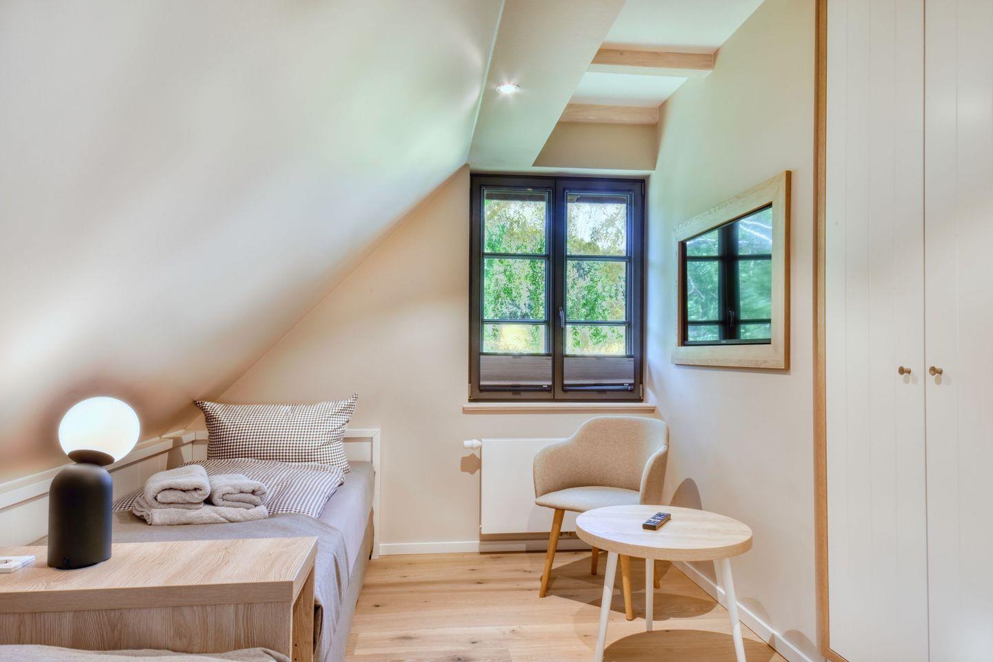 Kaffeezubereiter genossen werden. Abwaschen muss hier zum Glück niemand. Es gibt einen Geschirrspüler. Weiter geht’s mit den beiden komfortablen Schlafzimmern. Ein bequemes Boxspringdoppelbett (1,80 x 2,10) und zwei Boxspringeinzelbetten (90 x 200) versprechen erholsame Träume. Die Zimmer verfügen über je einen Kleiderschrank und ebenfalls einen Flat-TV. Zwei Bäder mit Dusche und WC sorgen für genügend Raum zum Frischmachen. Das Bad im EG ist zudem mit einer Finnischen Sauna ausgestattet. Bei Anreise liegen Handtücher und Abtrockentücher für die Küche für Sie bereit und die Betten sind bezogen.