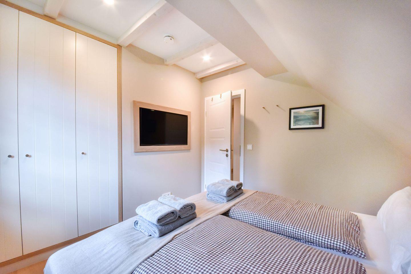 Zubereiten können Sie sie in der offenen und modernen Küche. Alle Geräte sind hochwertig. Ein komplettes Geschirr-Service befindet sich in den Schränken. Abwaschen muss hier zum Glück niemand. Es gibt einen Geschirrspüler. Weiter geht’s mit den beiden komfortablen Schlafzimmern. Zwei bequeme Boxspringdoppelbetten (180 x 200) versprechen erholsame Träume. Die Zimmer verfügen über je einen Kleiderschrank und ebenfalls einen Flat-TV. Zwei Bäder mit Dusche und WC sorgen für genügend Raum zum Frischmachen. Das Bad im EG ist zudem mit einer Finnischen Sauna ausgestattet. Bei Anreise liegen Handtücher für Sie bereit und die Betten sind bezogen.