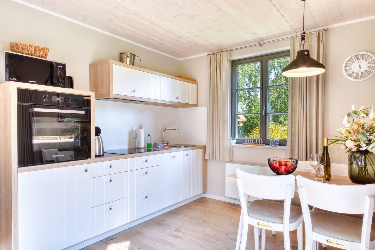 Im Feriendorf Klein Stresow werden Sie auf 61 Quadratmeter in Ihrer eigenen, stylischen Ferienhaushälfte mit Garten und Weitblick begrüßt . Hier beginnt der Urlaub für bis zu 4 Personen schon beim Eintreten. Wenn Sie es genau nehmen, schon beim Ankommen. Das Auto auf dem für Sie reservierten Stellplatz abgestellt, können Sie bei so viel sonniger Leichtigkeit erst einmal richtig durchatmen. Öffnen Sie die bodentiefen Fenster zu Ihrer Westterrasse und genießen Sie die frische Ostseebrise. Hier lässt es sich ausgezeichnet frühstücken. Das Innere Ihrer Ferienhaushälfte ist bis ins Detail aufs Feinste eingerichtet. Lampen, Möbel und Bilder sind nordisch nobel. Ein Sofa lädt zum Relaxen ein. Zur Ausstattung des Wohn-Esszimmers gehören ein Kamin und ein Flat-TV. Das WLAN können Sie kostenfrei nutzen. Ein schöner Esstisch mit vier Stühlen eignet sich bestens für die Mahlzeiten.