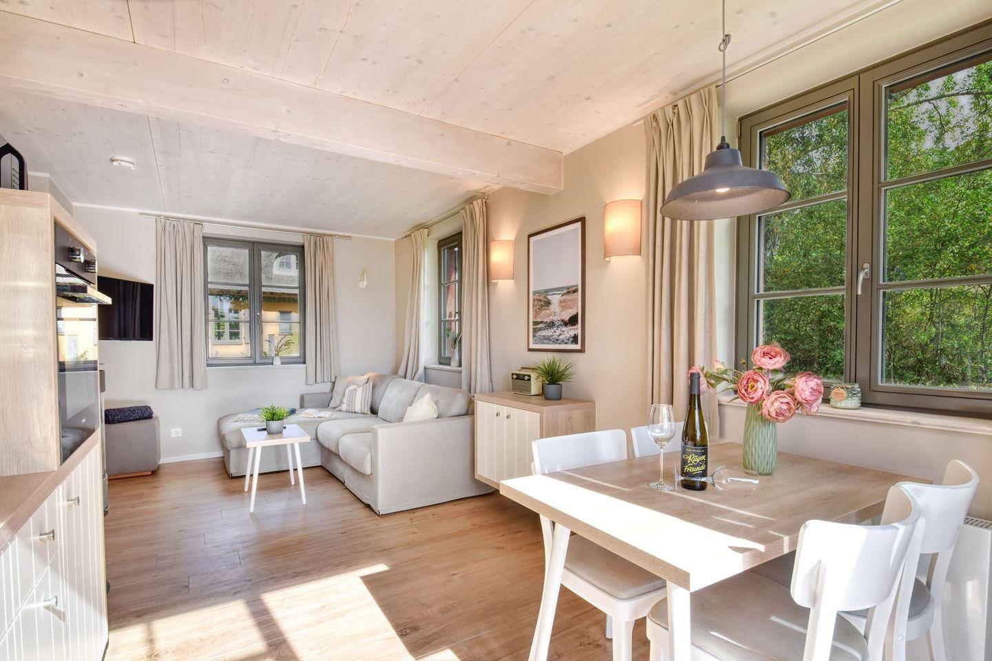 Im Feriendorf Klein Stresow werden Sie auf 61 Quadratmeter in Ihrer eigenen, stylischen Ferienhaushälfte mit Garten und Weitblick begrüßt . Hier beginnt der Urlaub für bis zu 4 Personen schon beim Eintreten. Wenn Sie es genau nehmen, schon beim Ankommen. Das Auto auf dem für Sie reservierten Stellplatz abgestellt, können Sie bei so viel sonniger Leichtigkeit erst einmal richtig durchatmen. Öffnen Sie die bodentiefen Fenster zu Ihrer Westterrasse und genießen Sie die frische Ostseebrise. Hier lässt es sich ausgezeichnet frühstücken. Das Innere Ihrer Ferienhaushälfte ist bis ins Detail aufs Feinste eingerichtet. Lampen, Möbel und Bilder sind nordisch nobel. Ein Sofa mit Ottomane lädt zum Relaxen ein. Zur Ausstattung des Wohn-Esszimmers gehören ein Kamin und ein Flat-TV. Das WLAN können Sie kostenfrei nutzen. Ein schöner Esstisch mit vier Stühlen eignet sich bestens für die Mahlzeiten.