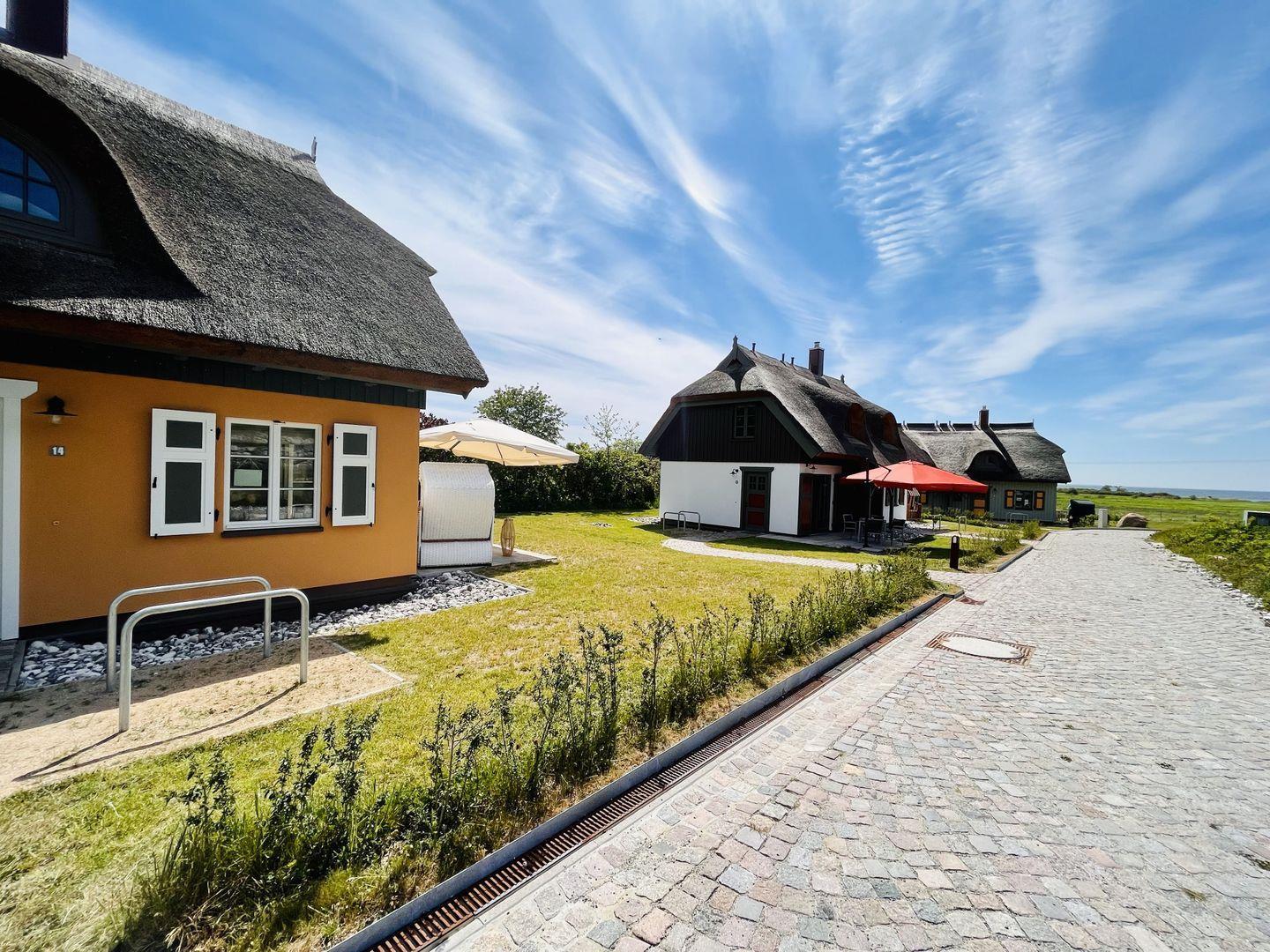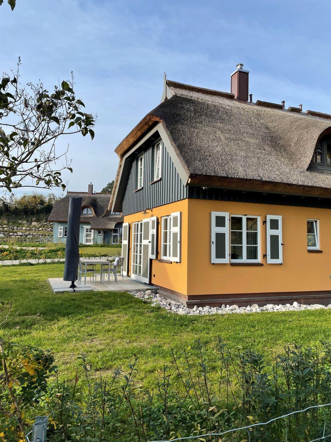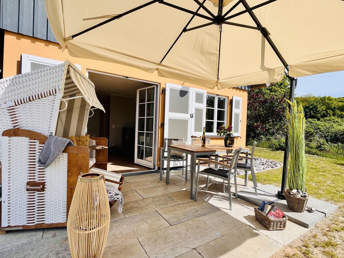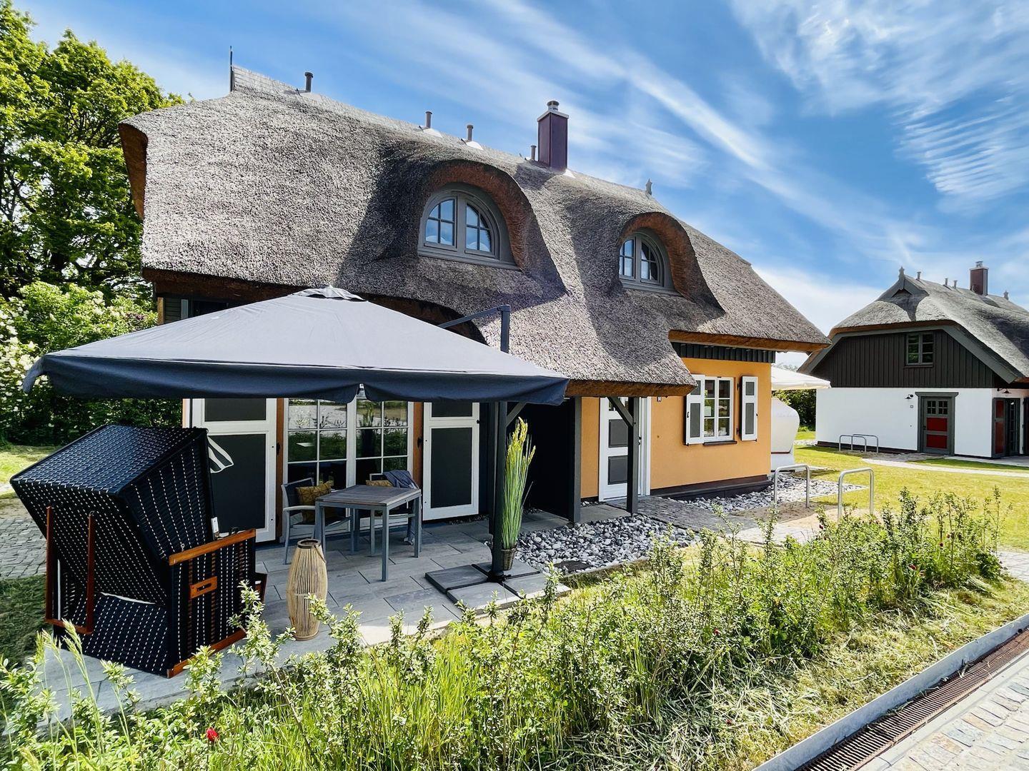 Im Feriendorf Klein Stresow werden Sie in Ihrer eigenen, stylischen Reethaushälfte mit Garten und Weitblick begrüßt . Hier beginnt der Urlaub für bis zu 4 Personen schon beim Eintreten. Wenn Sie es genau nehmen, schon beim Ankommen. Das Auto auf dem für Sie reservierten Stellplatz abgestellt, können Sie bei so viel sonniger Leichtigkeit erst einmal richtig durchatmen. Öffnen Sie die bodentiefen Fenster zu Ihrer Südterrasse weit und genießen Sie die frische Ostseebrise. Hier lässt es sich ausgezeichnet frühstücken. Das Innere Ihrer Ferienhaushälfte ist bis ins Detail aufs Feinste eingerichtet. Lampen, Möbel und Bilder sind nordisch nobel. Ein Sofa lädt zum Relaxen ein. Zur Ausstattung des Wohn-Esszimmers gehören ein Kamin und ein Flat-TV. Das WLAN können Sie kostenfrei nutzen. Ein schöner Esstisch mit vier Stühlen eignet sich bestens für die Mahlzeiten.