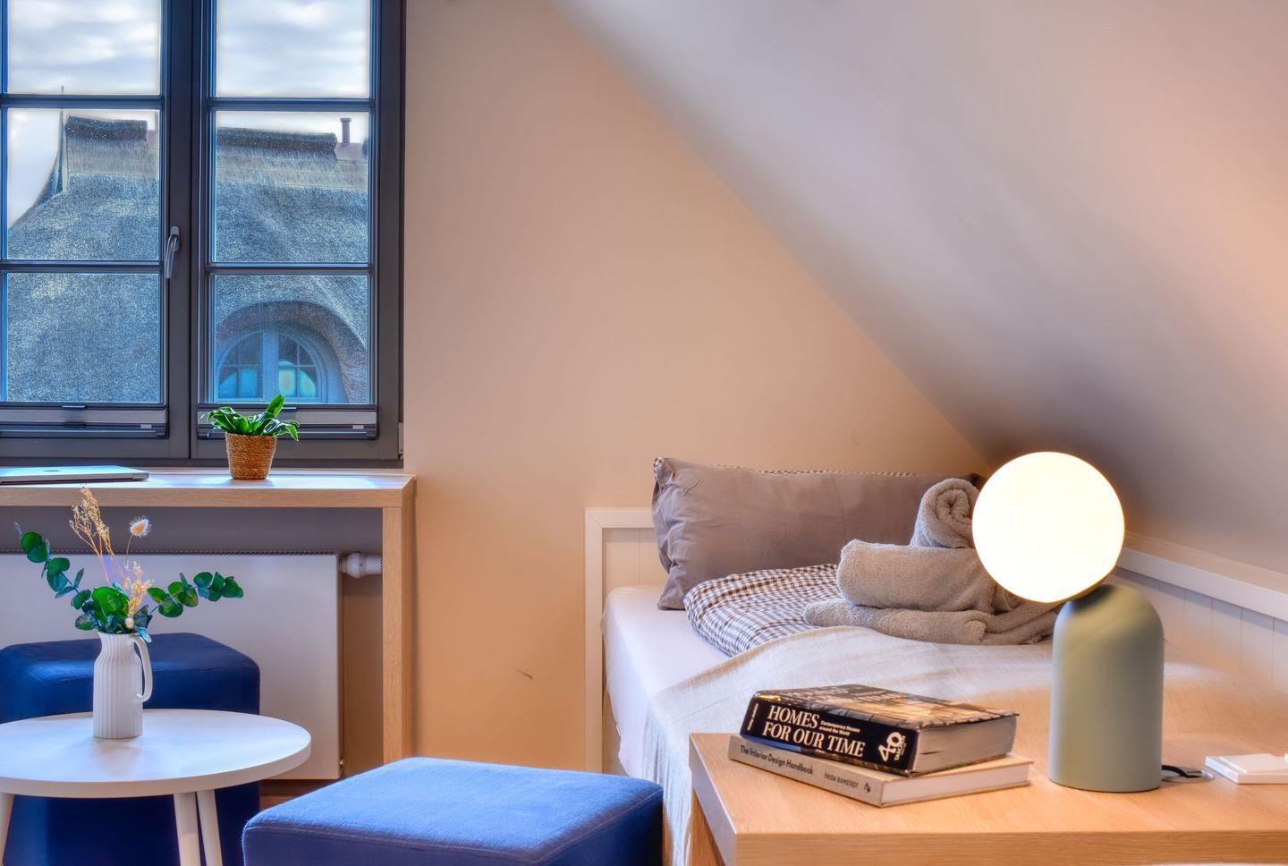 Im Feriendorf Klein Stresow werden Sie auf 60 bestens geplanten Quadratmetern in Ihrer eigenen, stylischen mit Reet gedeckten Ferienhaushälfte "Große Lage" mit Garten, Meer- und Weitblick begrüßt. Hier beginnt der Urlaub für bis zu 4 Personen schon beim Eintreten. Wenn Sie es genau nehmen, bereits bei der Ankunft. Ihren Wagen stellen Sie einfach auf dem für Sie reservierten Stellplatz ab. Machen Sie die bodentiefen Fenster zu Ihrer Südterrasse weit auf und nehmen Sie Platz im komfortablen Strandkorb oder auf den hochwertigen Terrassenmöbeln. Umweht von einer frischen Brise, dem schönen Blick aufs Meer, grünen Wiesen und Fliederhecken wird dieser Ort für Sie ganz sicher zur „Großen Lage“. Das Innere Ihrer Ferienhaushälfte ist bis ins Detail aufs Feinste eingerichtet. Lampen, Möbel und Bilder sind nordisch schlicht, aber nobel und individuell angefertigt. Ein Sofa mit Ottomane lädt zum Relaxen ein. Zur Ausstattung des Wohn-Esszimmers gehören ein Kaminofen mit Sichtfenstern und ein Flat-TV. Das WLAN können Sie kostenfrei nutzen. Ein schöner Esstisch mit vier Stühlen eignet sich bestens für die Mahlzeiten und gesellige Spielerunden.