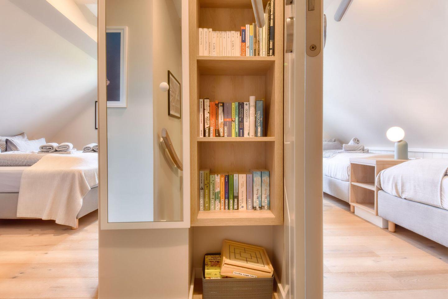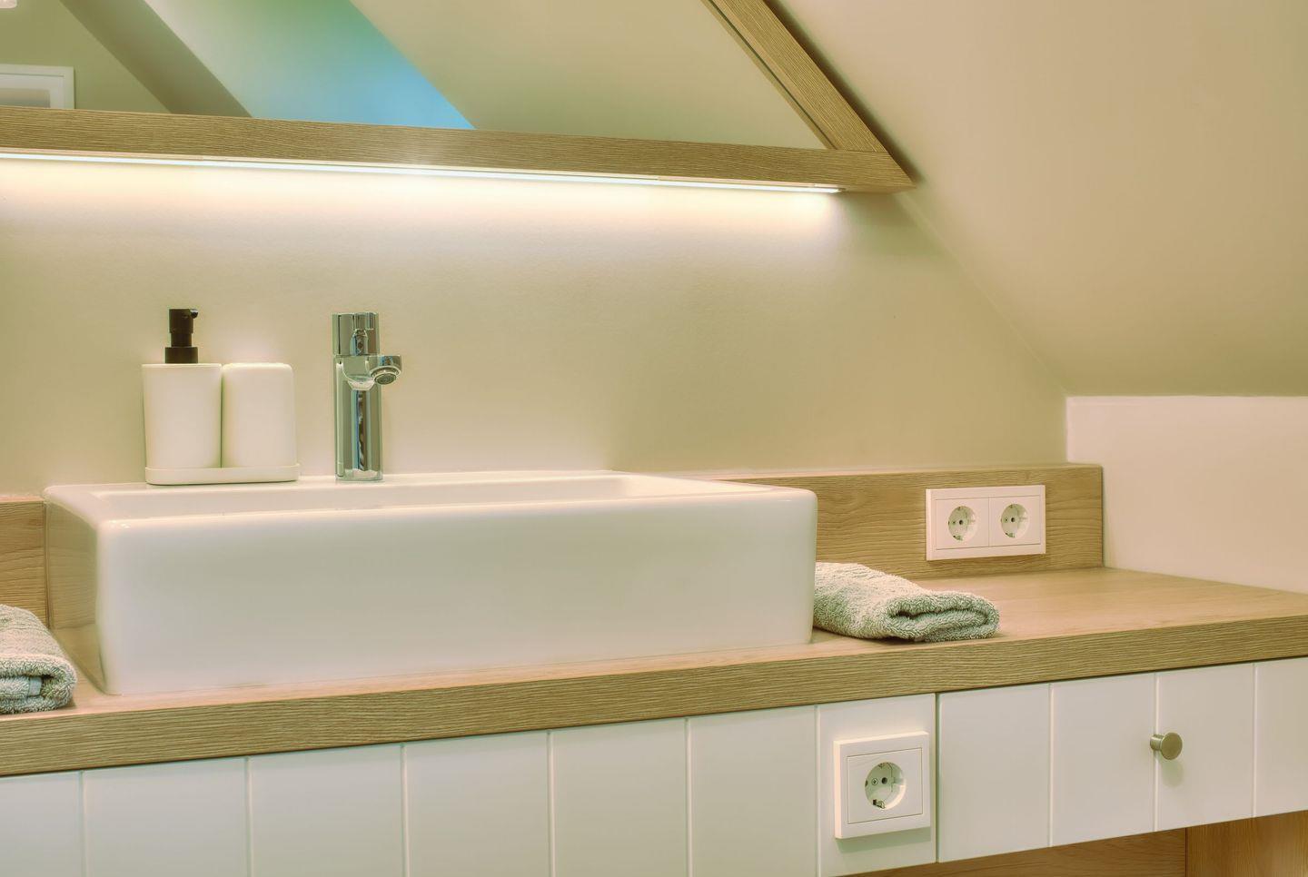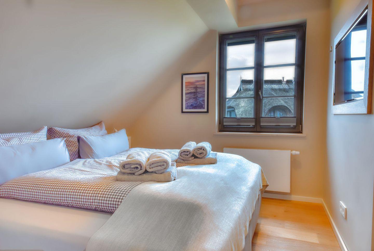 Die offene Küche ist modern und durchdacht ausgestattet, alle Geräte sind hochwertig. Ein komplettes Geschirr-Service, Gläser, WMF-Töpfe und viele nützliche Kleinigkeiten befinden sich in den Schränken. Abwaschen muss hier zum Glück keiner, denn es gibt einen Geschirrspüler. Weiter geht es zu den beiden komfortablen Schlafzimmern mit Eichenfußboden in der ersten Etage. Ein bequemes Boxspringdoppelbett (180 x 200 cm) und zwei Boxspringeinzelbetten (je 90 x 200 cm) und kuscheliges Bettzeug versprechen erholsame Träume. Die Zimmer verfügen jeweils über einen Kleiderschrank, Flat-TV und Ablagemöglichkeiten und lassen sich mittels Innenrollos gut verdunkeln. Bei Ihrer Anreise liegen Handtücher bereit und die Betten sind für Sie bezogen. Zwei vollausgestattete Badezimmer mit Regendusche und WC bieten genügend Raum zum Frischmachen. In der finnischen Sauna im Erdgeschoß können Sie nach den Aktivitäten des Tages bei einem Blick aus dem Fenster ins Grüne entspannen. Gerne können Sie hierfür ein Wellnesspaket mit Bademantel und Saunatuch hinzubuchen.