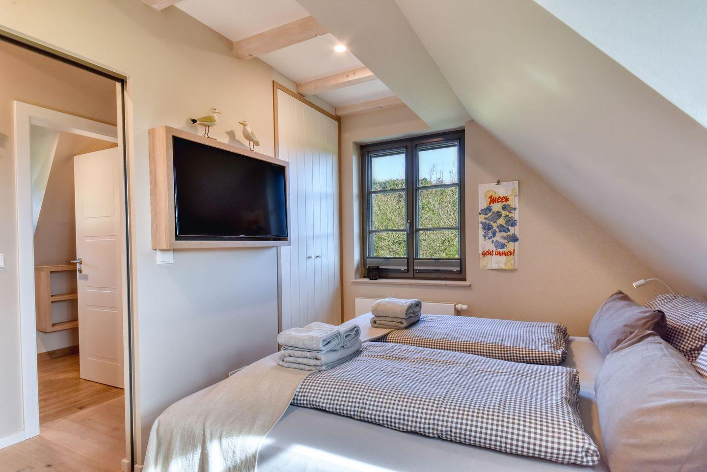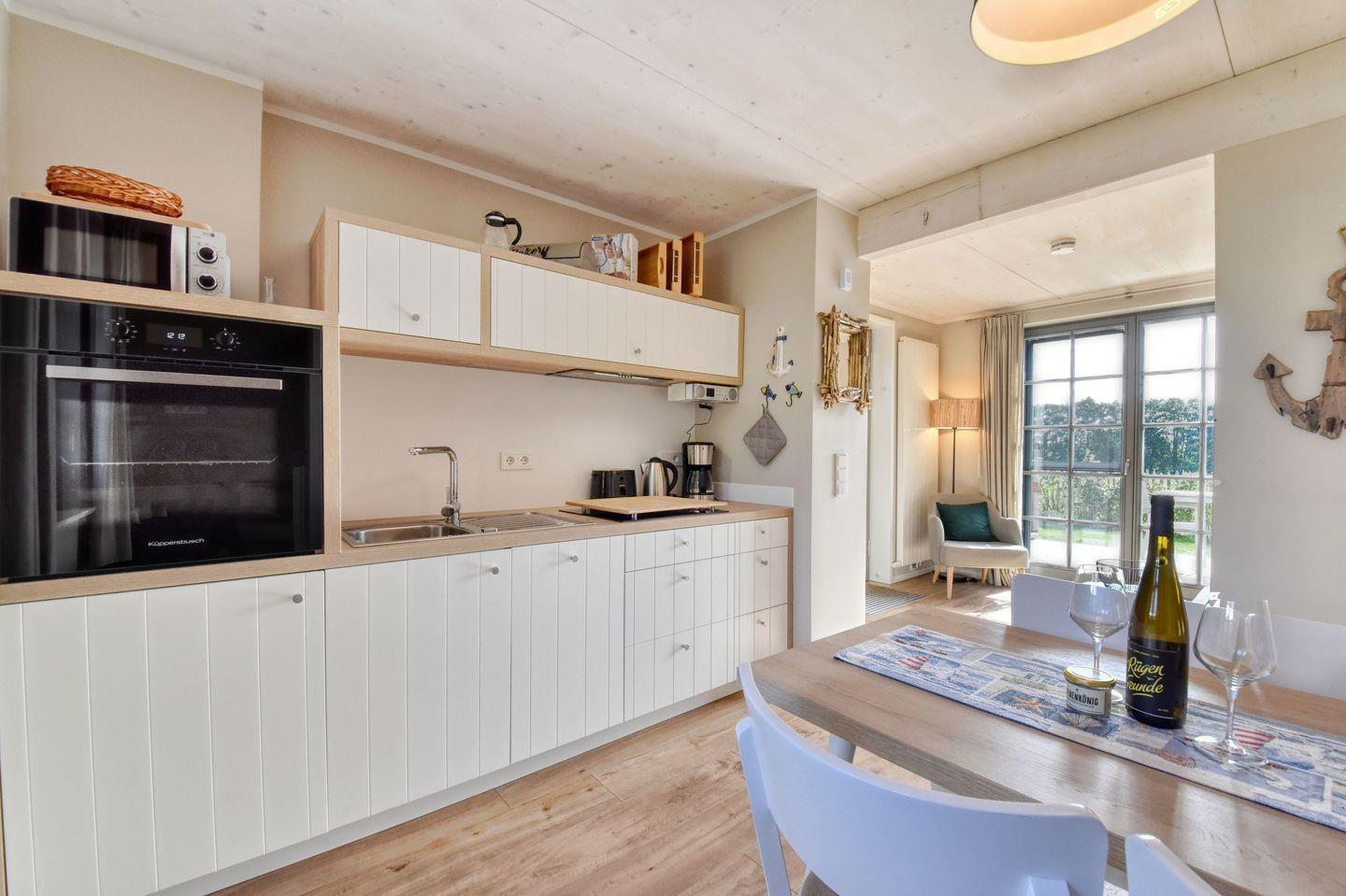 Zubereiten können Sie sie in der offenen und modernen Küche. Alle Geräte sind hochwertig. Ein komplettes Geschirr-Service befindet sich in den Schränken. Abwaschen muss hier zum Glück niemand. Es gibt einen Geschirrspüler. Ein bequemes Boxspringdoppelbett (180 x 200) verspricht erholsame Träume. Das Schlafzimmer verfügt über einen Kleiderschrank und ebenfalls einen Flat-TV. Ein Bad mit Dusche und WC sorgen für genügend Raum zum Frischmachen. Bei Anreise liegen Handtücher für Sie bereit und die Betten sind bezogen.