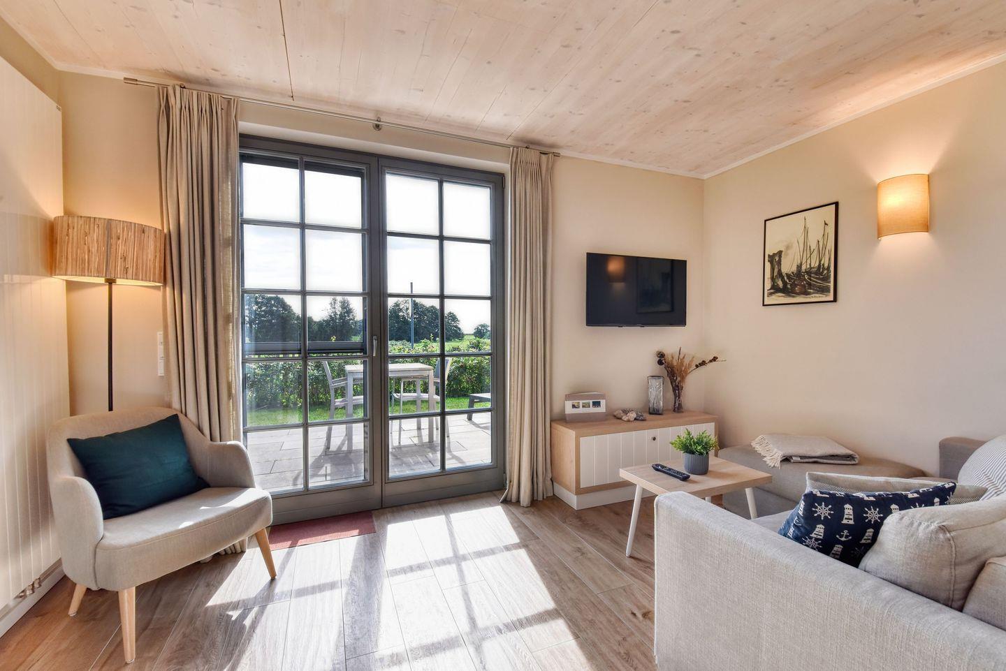 Im Feriendorf Klein Stresow werden Sie im „Seeblick-Ferienhaus Mein Ankerplatz“ auf 43 Quadratmetern in Ihrer eigenen, stylischen Ferienhaushälfte mit Garten begrüßt. „Mein Ankerplatz“ hat einen direkten, unverbauten Meerblick beim Relaxen auf der Terrasse und von jedem Zimmer aus. Hier beginnt der Urlaub für bis zu 2 Personen schon beim Eintreten. Wenn Sie es genau nehmen, schon beim Ankommen. Das Auto auf dem für Sie reservierten Stellplatz abgestellt, können Sie bei so viel sonniger Leichtigkeit erst einmal richtig durchatmen. Öffnen Sie die bodentiefen Fenster zu Ihrer Südterrasse weit und genießen Sie die frische Ostseebrise. Hier lässt es sich ausgezeichnet frühstücken. Das Innere Ihrer Ferienhaushälfte ist bis ins Detail aufs Feinste eingerichtet. Lampen, Möbel und Bilder sind nordisch nobel. Ein Sofa mit Ottomane lädt zum Relaxen ein. Zur Ausstattung des Wohn-Esszimmers gehört ein Flat-TV. Das WLAN können Sie kostenfrei nutzen. Ein schöner Esstisch mit vier Stühlen eignet sich bestens für die Mahlzeiten.