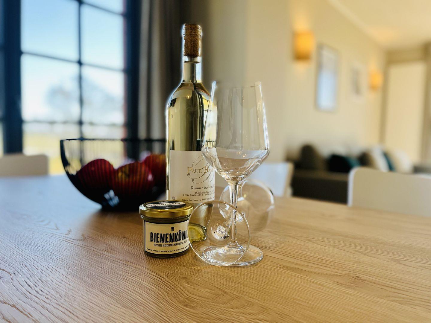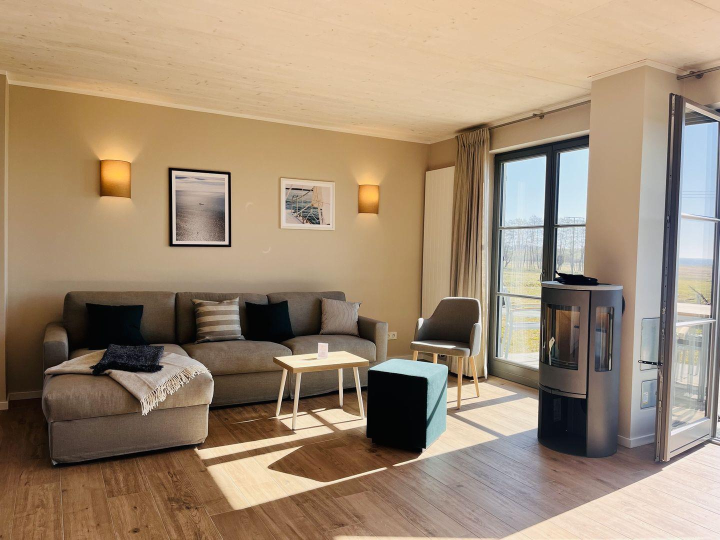Im Feriendorf Klein Stresow werden Sie im „Seeblick-Ferienhaus Seeblick“ auf 115 Quadratmetern in Ihrer eigenen, stylischen Ferienhaushälfte mit Garten und direktem, unverbautem Meerblick von jedem Zimmer aus begrüßt. Hier beginnt der Urlaub für bis zu 6 Personen schon beim Eintreten. Wenn Sie es genau nehmen, schon beim Ankommen. Das Auto auf dem für Sie reservierten Stellplatz abgestellt, können Sie bei so viel sonniger Leichtigkeit erst einmal richtig durchatmen. Öffnen Sie die bodentiefen Fenster zu Ihrer Südterrasse weit und genießen Sie die frische Ostseebrise. Hier lässt es sich ausgezeichnet frühstücken. Das Innere Ihrer Ferienhaushälfte ist bis ins Detail aufs Feinste eingerichtet. Lampen, Möbel und Bilder sind nordisch nobel. Ein Sofa lädt zum Relaxen ein. Zur Ausstattung des Wohn-Esszimmers gehören ein Kamin und ein Flat-TV. Das WLAN können Sie kostenfrei nutzen. Ein schöner Esstisch mit sechs Stühlen eignet sich bestens für die Mahlzeiten.