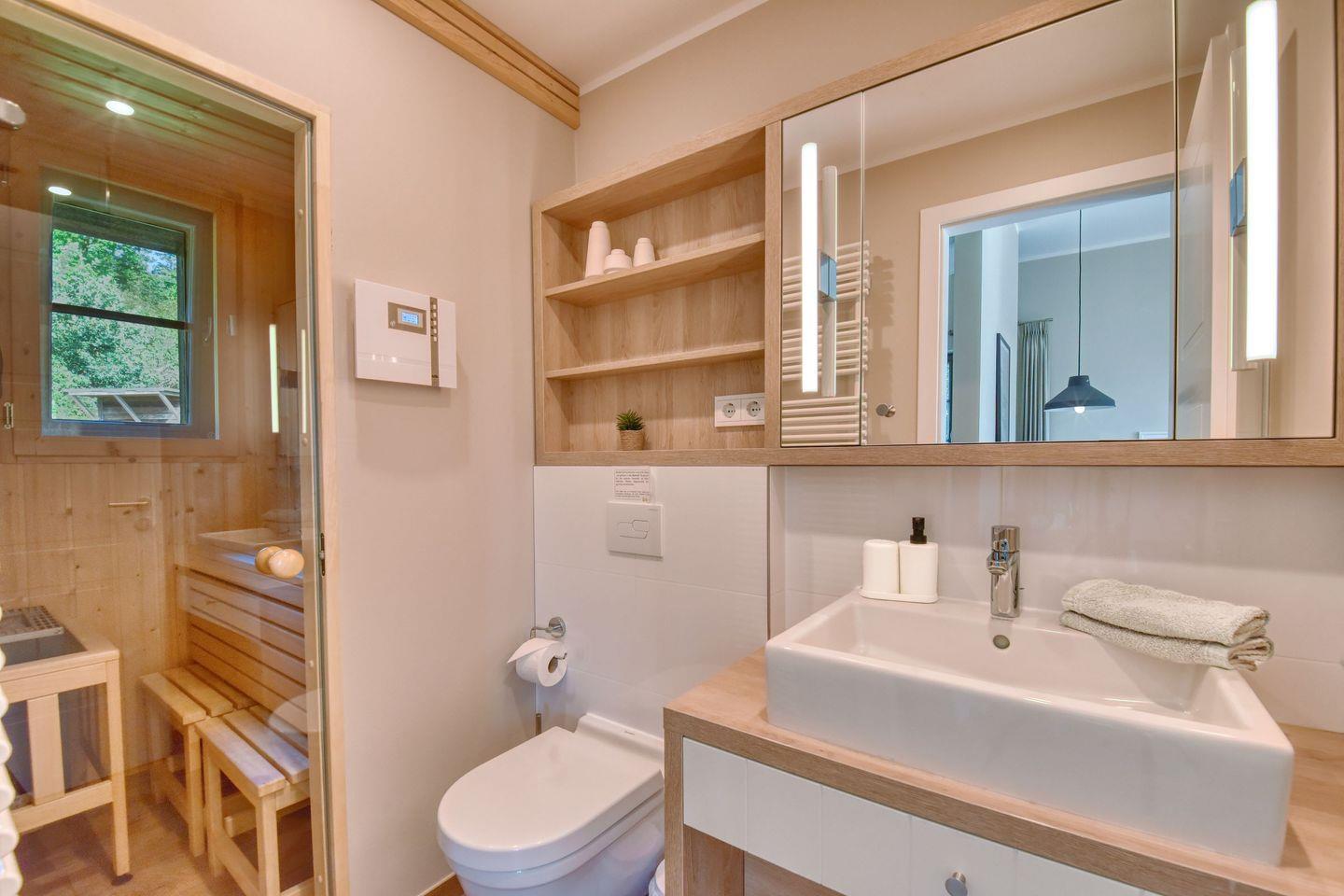 Zubereiten können Sie sie in der offenen und modernen Küche. Alle Geräte sind hochwertig. Ein komplettes Geschirr-Service befindet sich in den Schränken. Abwaschen muss hier zum Glück niemand. Es gibt einen Geschirrspüler. Weiter geht’s mit einem komfortablen Schlafzimmer. Ein bequemes Boxspringdoppelbett (180 x 200) verspricht erholsame Träume. Das Zimmer verfügt über einen Kleiderschrank und einen Flat-TV. Ein Bad mit Dusche und WC sorgt für genügend Raum zum Frischmachen. Das Bad ist zudem mit einer Finnischen Sauna ausgestattet. Bei Anreise liegen Handtücher für Sie bereit und die Betten sind bezogen.
