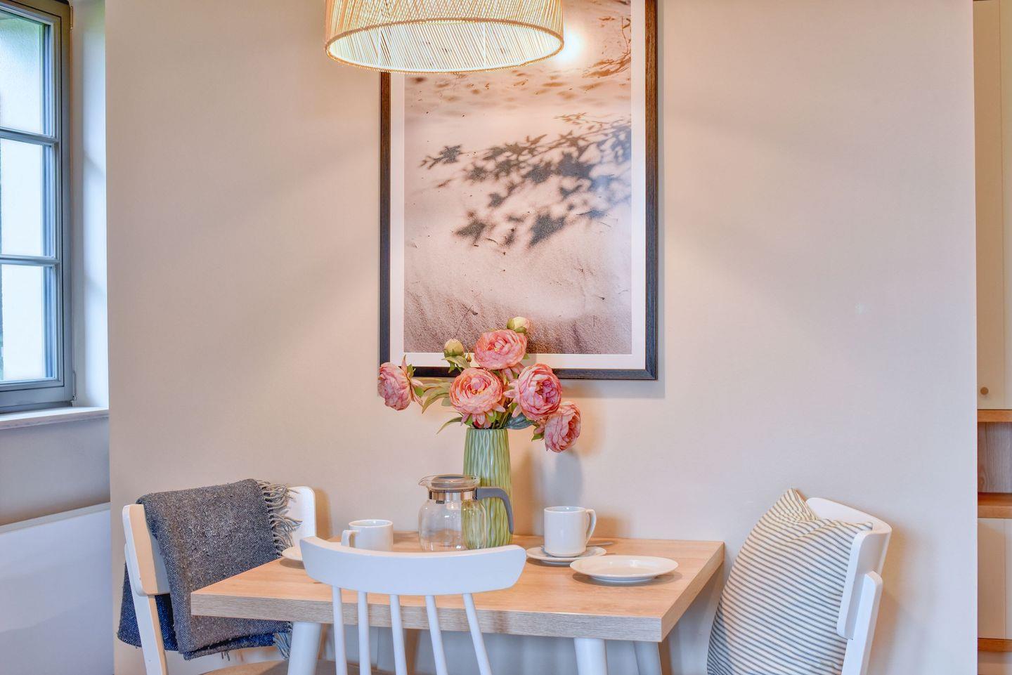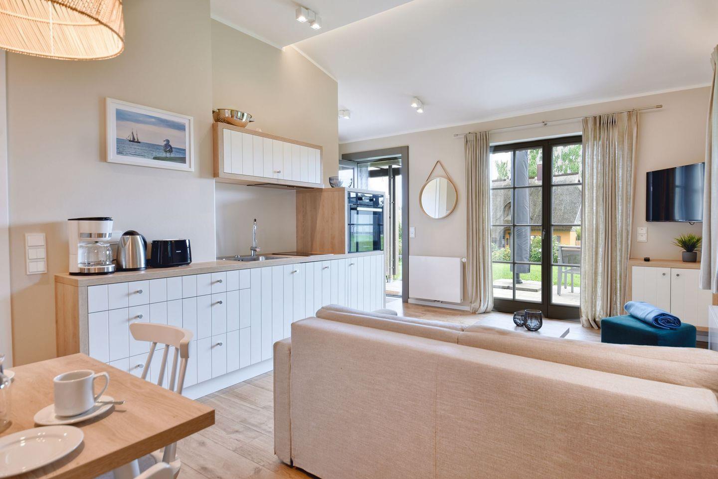 Im Feriendorf Klein Stresow werden Sie auf 41 Quadratmeter in Ihrer eigenen, stylischen Ferienhaushälfte mit Gründach sowie mit Garten und Weitblick begrüßt . Hier beginnt der Urlaub für bis zu 3 Personen schon beim Eintreten. Wenn Sie es genau nehmen, schon beim Ankommen. Das Auto auf dem für Sie reservierten Stellplatz abgestellt, können Sie bei so viel sonniger Leichtigkeit erst einmal richtig durchatmen. Öffnen Sie die bodentiefen Fenster zu Ihrer Süd-Westterrasse und genießen Sie die frische Ostseebrise. Hier lässt es sich ausgezeichnet frühstücken. Das Innere Ihrer Ferienhaushälfte ist bis ins Detail aufs Feinste eingerichtet. Lampen, Möbel und Bilder sind nordisch nobel. Ein Sofa lädt zum Relaxen ein. Zur Ausstattung des Wohn-Esszimmers gehört ein Flat-TV. Das WLAN können Sie kostenfrei nutzen. Ein schöner Esstisch mit zwei Stühlen eignet sich bestens für die Mahlzeiten.