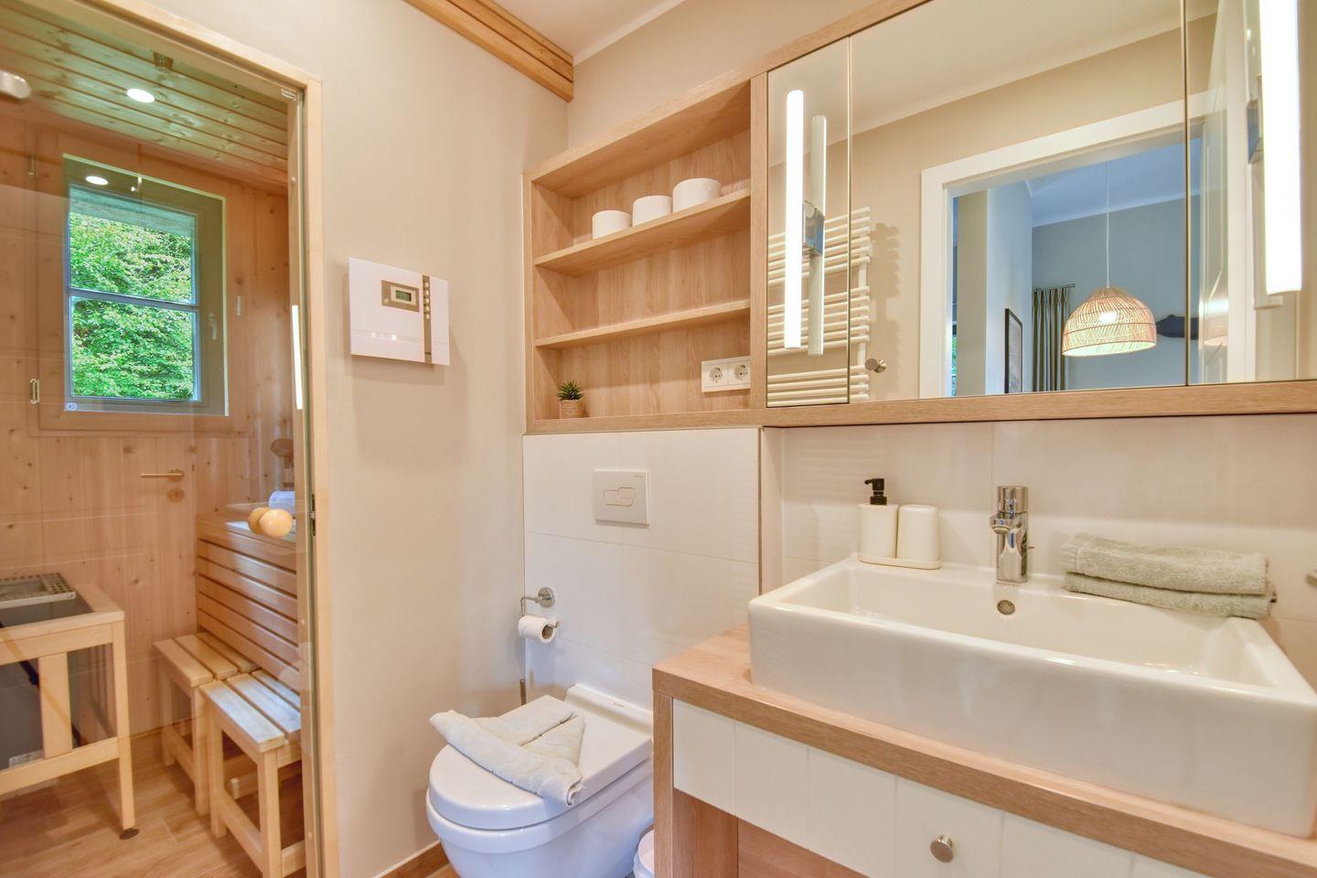 Zubereiten können Sie sie in der offenen und modernen Küche. Alle Geräte sind hochwertig. Ein komplettes Geschirr-Service befindet sich in den Schränken. Abwaschen muss hier zum Glück niemand. Es gibt einen Geschirrspüler. Weiter geht’s mit einem komfortablen Schlafzimmer. Ein bequemes Boxspringdoppelbett (180 x 200) verspricht erholsame erholsame Träume. Das Zimmer verfügt über einen Kleiderschrank und ebenfalls einen Flat-TV. Ein Bad mit Dusche und WC sorgen für genügend Raum zum Frischmachen. Das Bad ist zudem mit einer Finnischen Sauna ausgestattet. Bei Anreise liegen Handtücher für Sie bereit und die Betten sind bezogen.