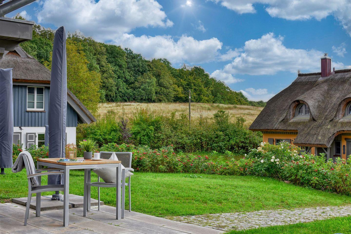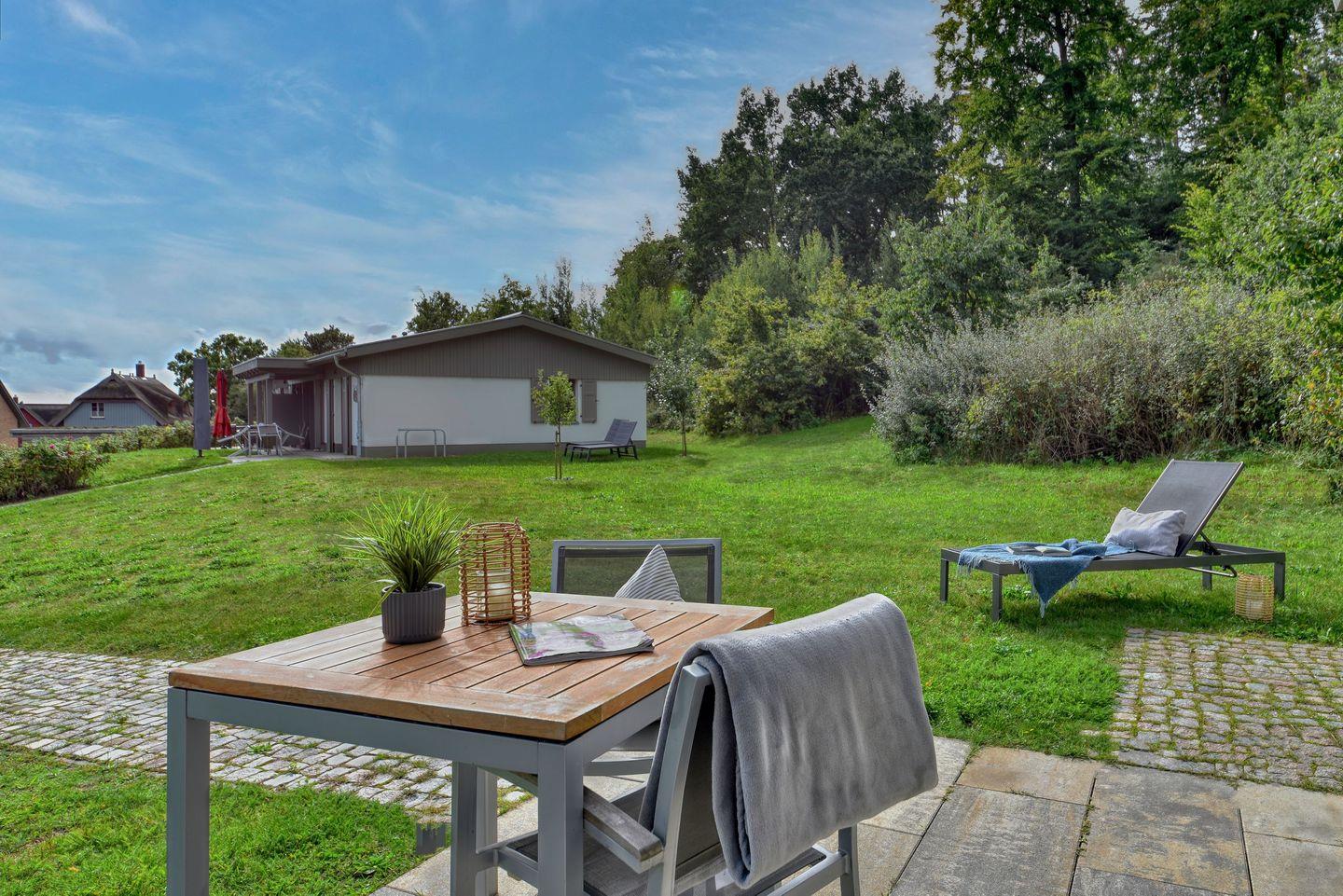 Moderne Ferienhaushälfte mit Sauna, Garten und Ostseeblick im Feriendorf Klein Stresow, ideal für naturnahe Erholung.