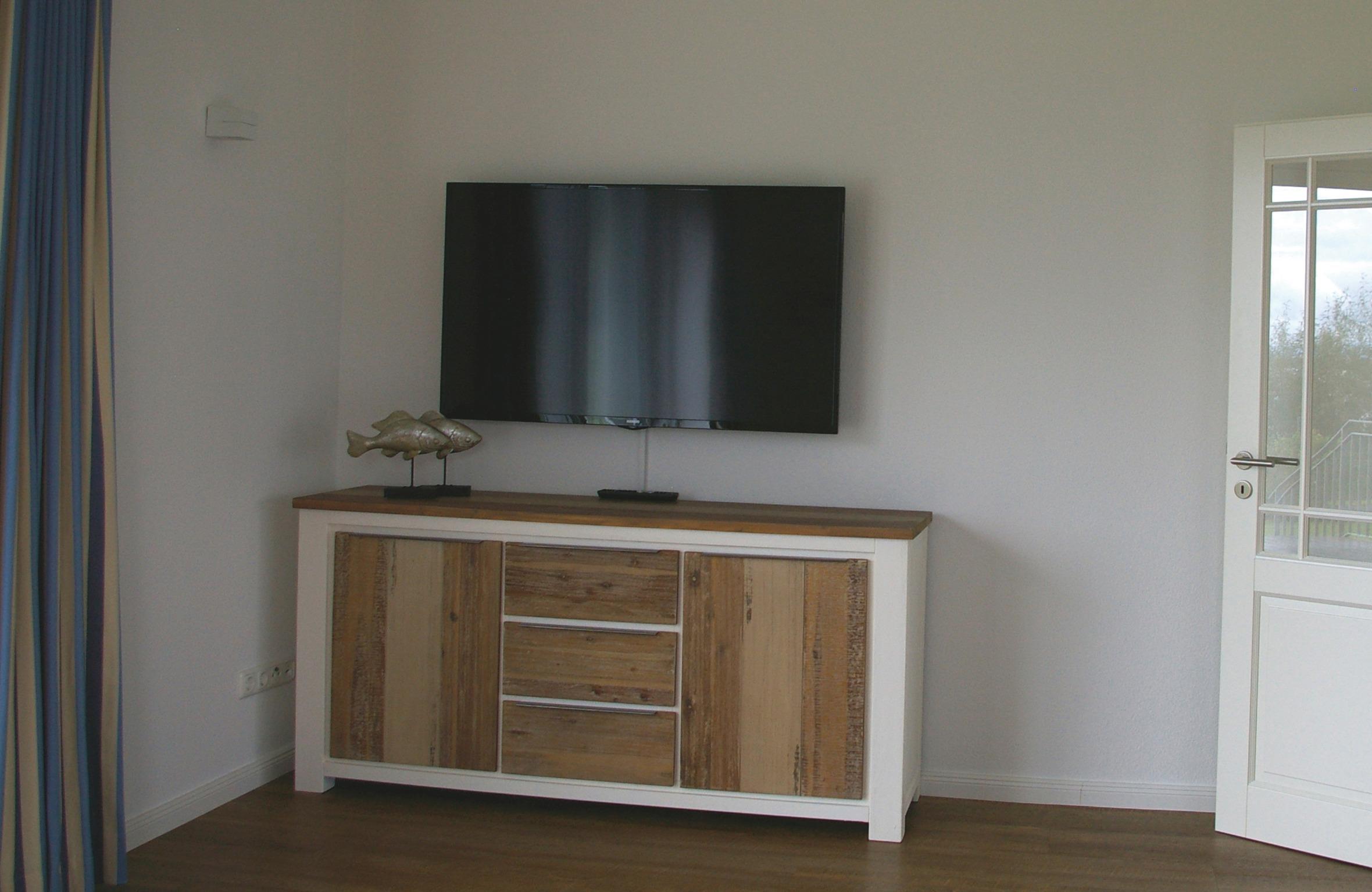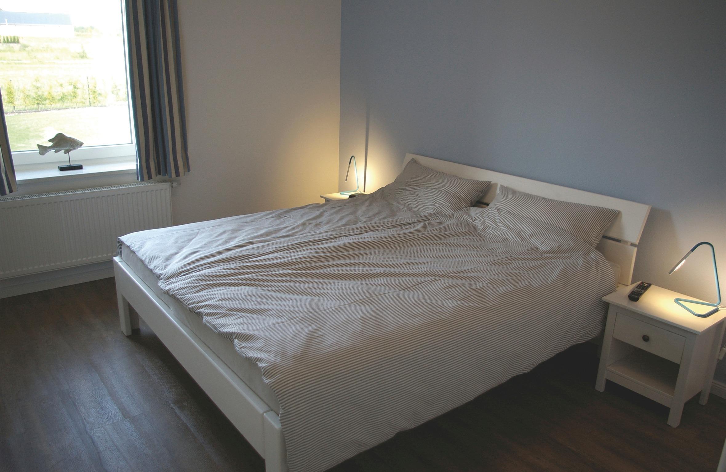 Auch das Schlafzimmer ist mit hellen Möbeln und Wänden sehr freundlich gestaltet. Doppelbett (1,80m x 2,00m) mit Nachttischen, einem großen Schrank und einem 42-Zoll LCD-Fernseher.