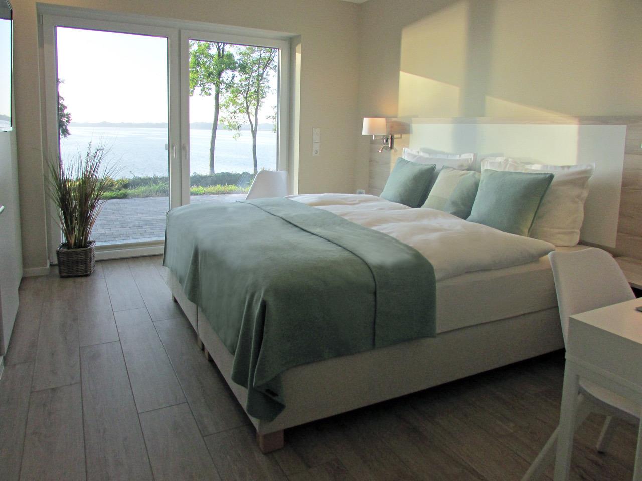 Schauen Sie aus den hochwertigen Boxspring-Betten, 180 x200 cm, über den freien Wittensee oder bestaunen Sie die unterschiedlichen Farbspiele der winterlichen Sonnenaufgänge.