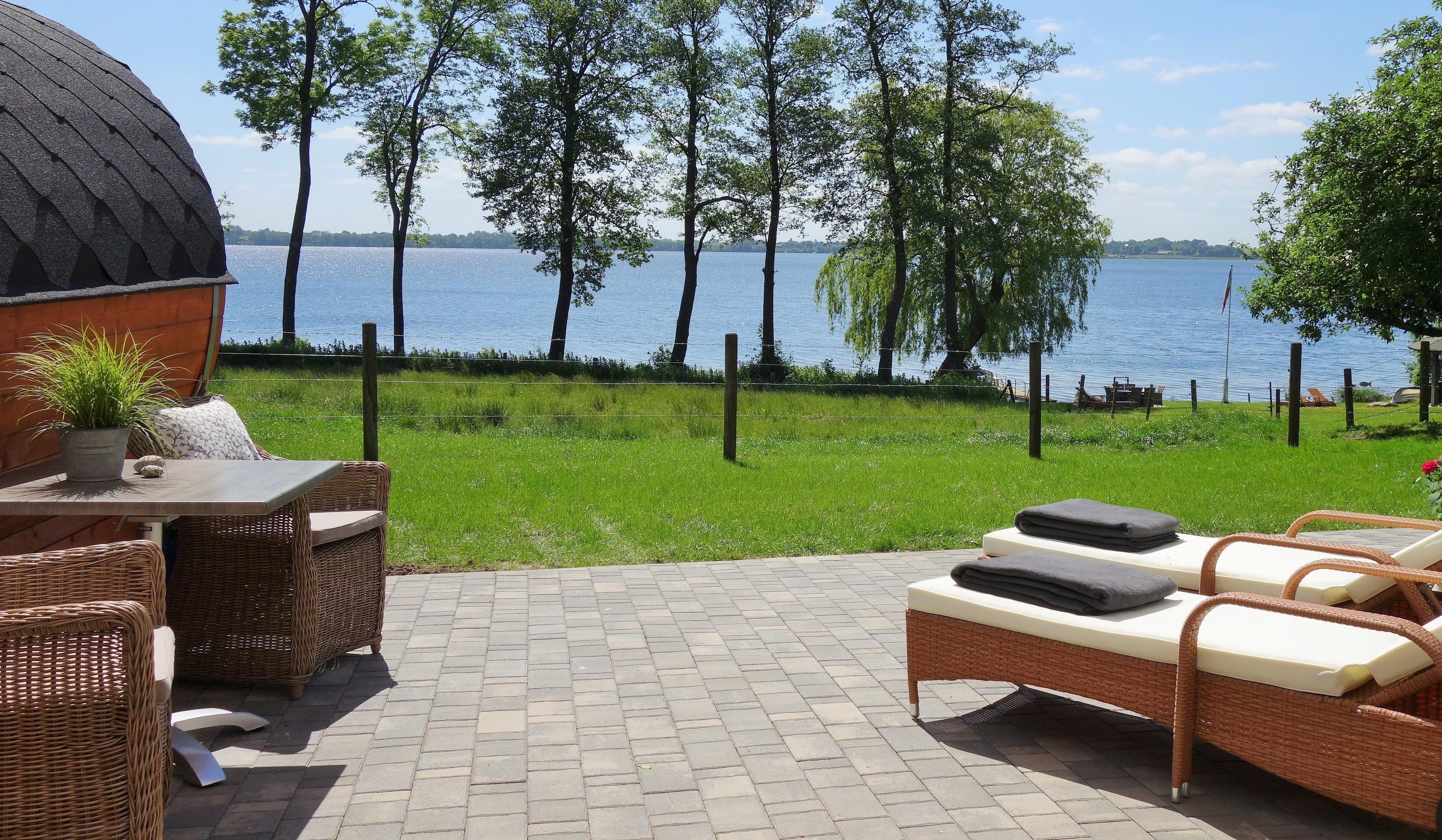 Der große Wohngarten, mit vielen Sitzgruppen, lädt zum Verweilen ein und bietet Ihnen einen unvergleichlich freien Blick über den See.