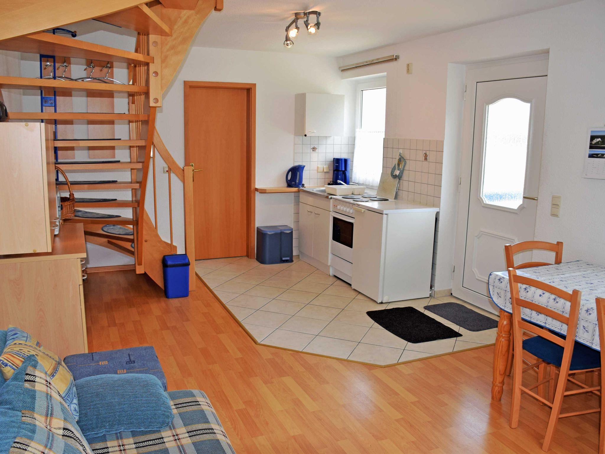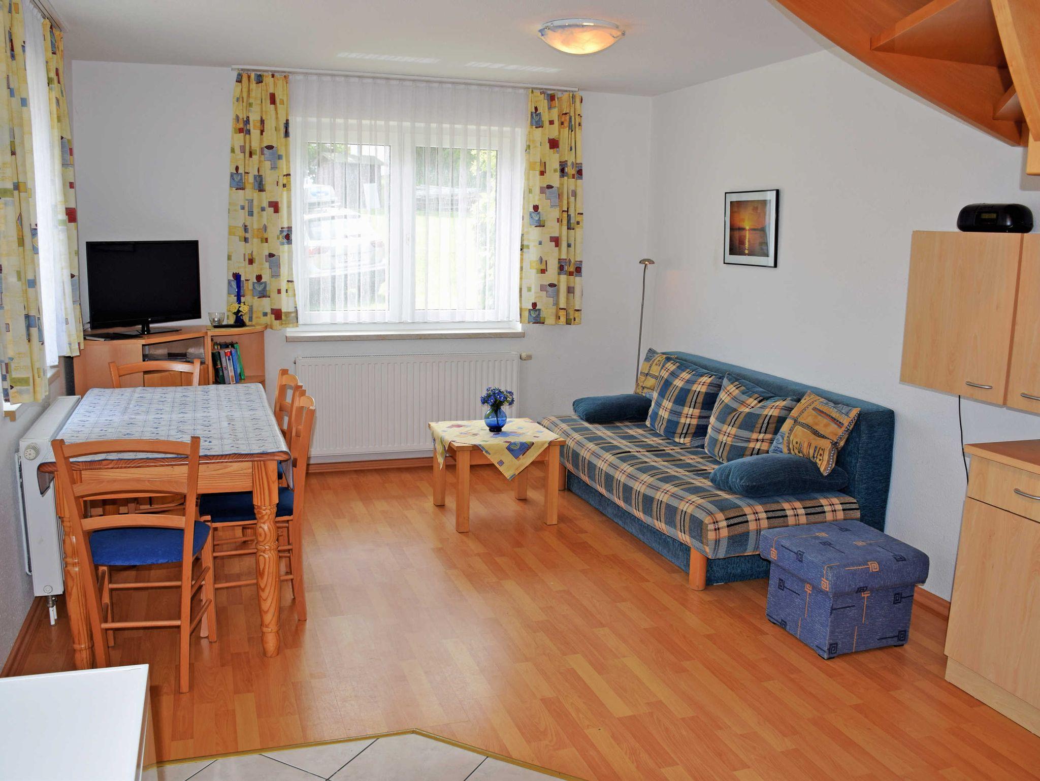 Im Wohnraum befinden sich eine bequeme Sitzcouch mit Tisch und ein TV-Gerät. Die kleine Küchenzeile ist mit einem Herd, Wasserkocher, Kaffeemaschine, Toaster und Kühlschrank komplett ausgestattet.