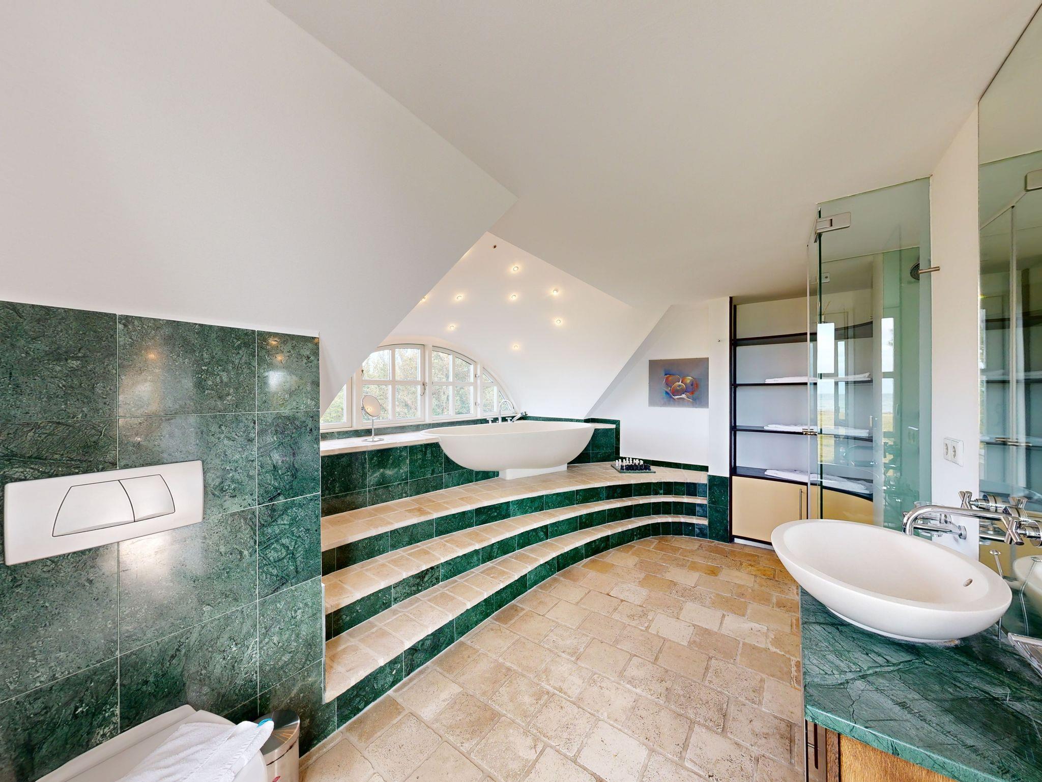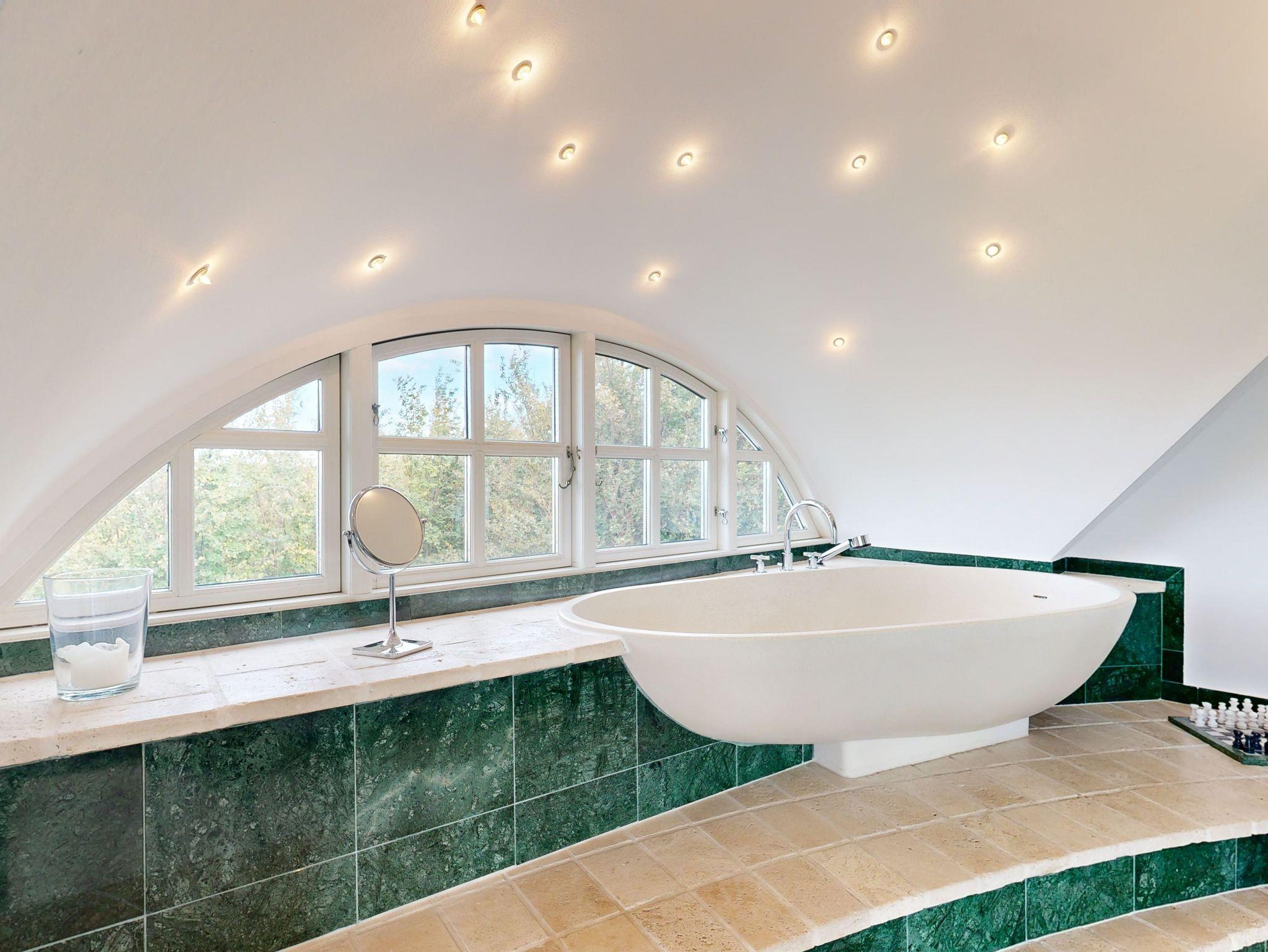 * 1 Badezimmer mit Blick auf die Ostsee, Badewanne, gläserne Dusche, WC und Föhn