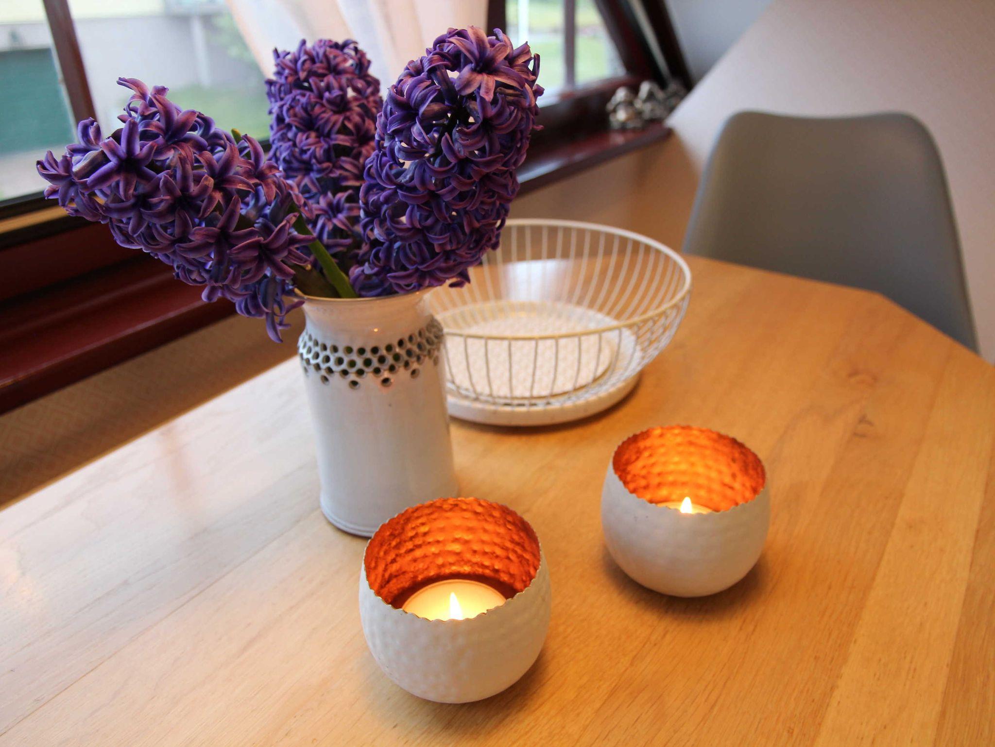 Der Essbereich befindet sich direkt an der großen Dach-Gaupe, mit Blick auf den blühenden Vorgarten.