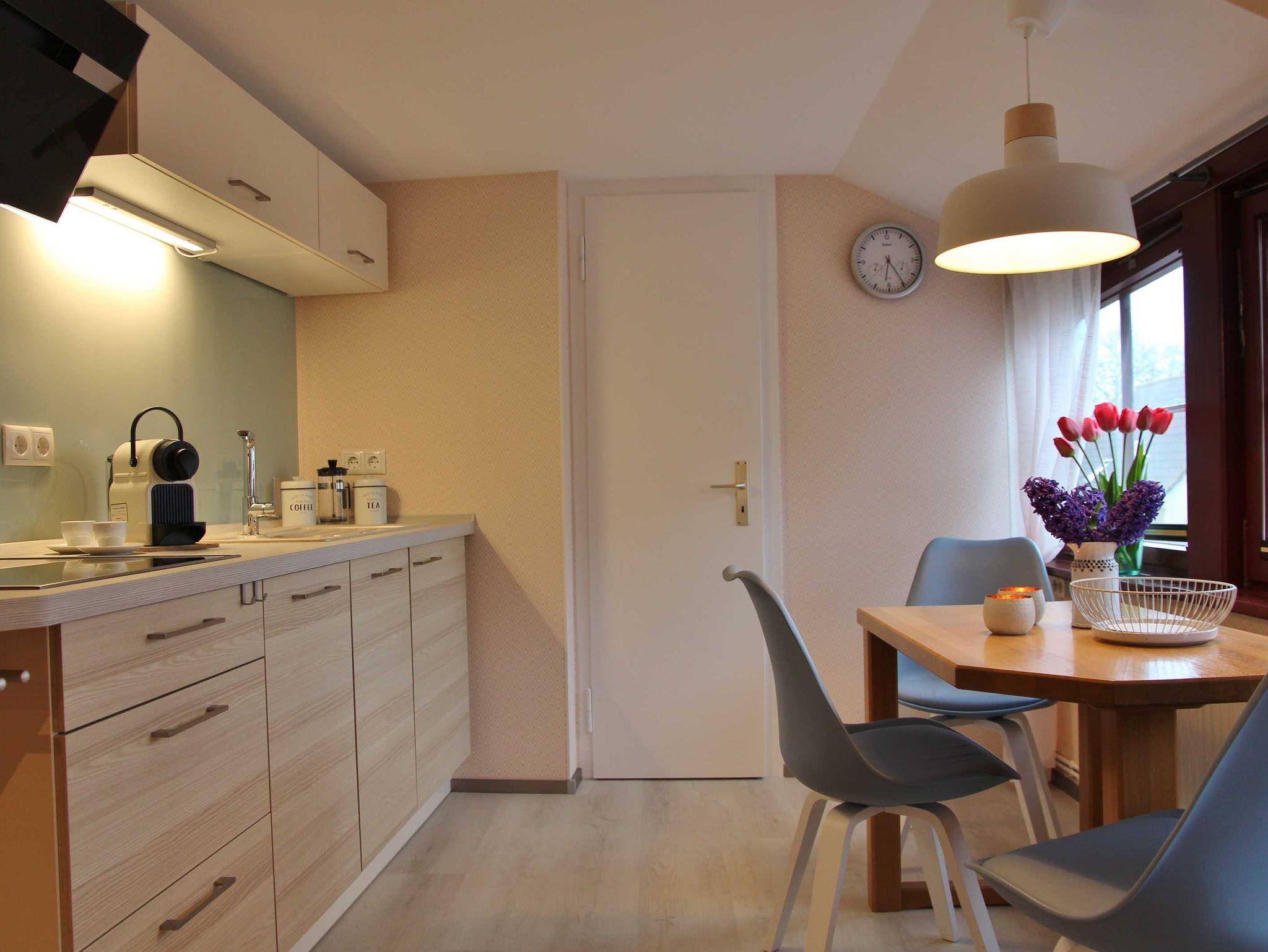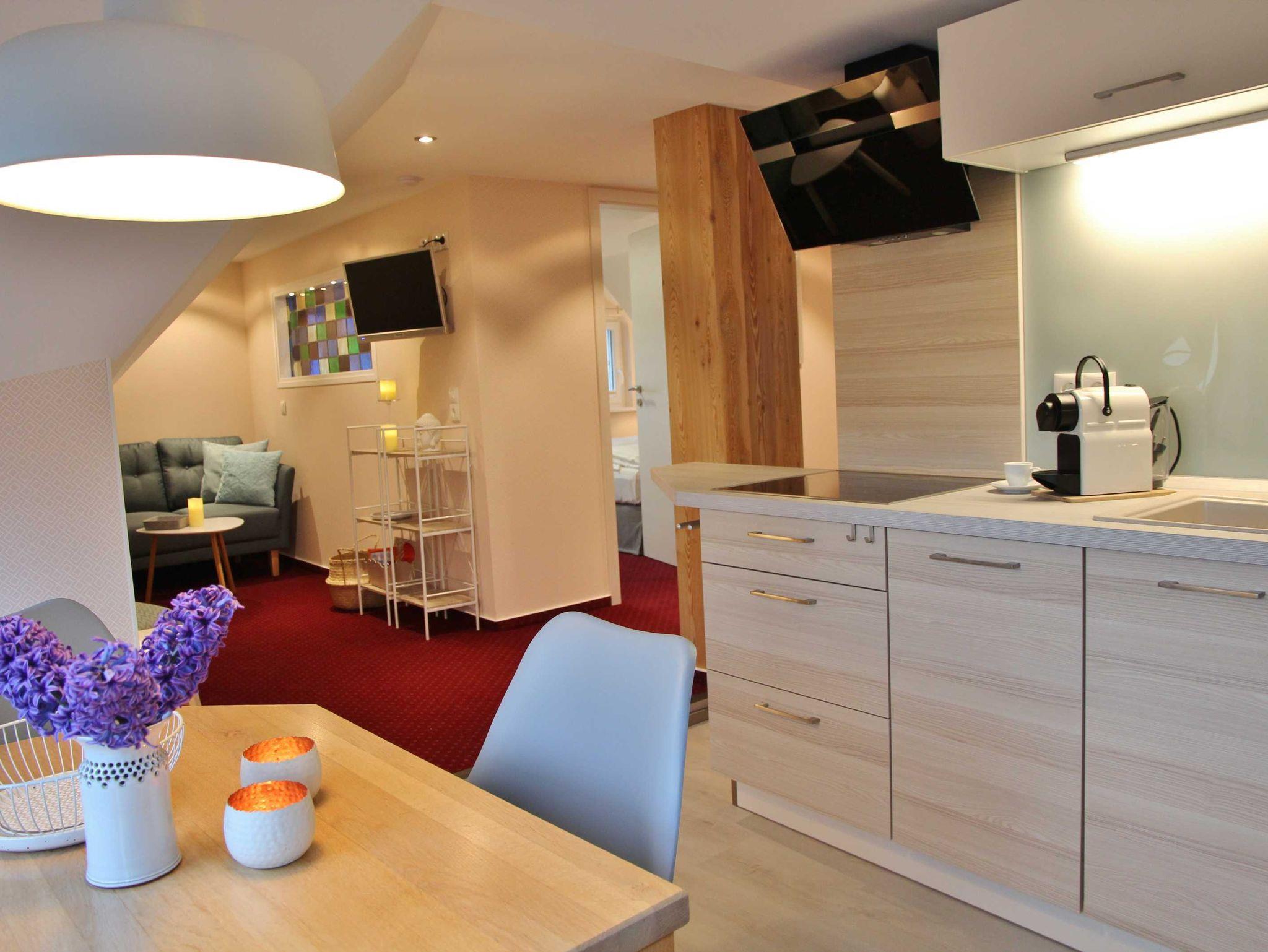 Unsere 2 Raum-WestStube (Himmelsrichtung, 45 qm) befindet sich im Dachgeschoss, ideal für den nächsten Familienurlaub. Platz für 3 Personen, getrennter Wohn-und Schlafbereich in hellen und gemütlichen Farben, Einbauküche mit Geschirrspüler und ein kleines Bad mit DU/WC.
