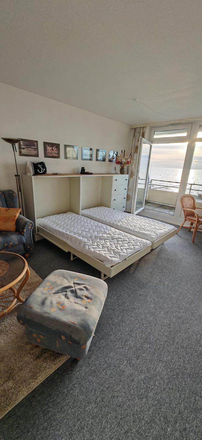 Weiter den Flur entlang erreichen Sie einen großen Wohn- und Schlafbereich mit 2 freundlichen, schmalen Wohnwänden in denen sich auch ein stabiles Doppelbett als Klappbett befindet. Hier mit Blick auf die offene See lässt es sich sicher gut erholen. Der Wohnbereich ist weiterhin mit einer Sitzgruppe mit einem Couchtisch ausgestattet. Der Esstisch steht direkt vor der Großen Fensterfläche, um auch beim Essen diesen tollen Blick zu genießen. Vor dem dann neuen Fensterelement lädt der geräumige Balkon zum jederzeitigen Verweilen ein.