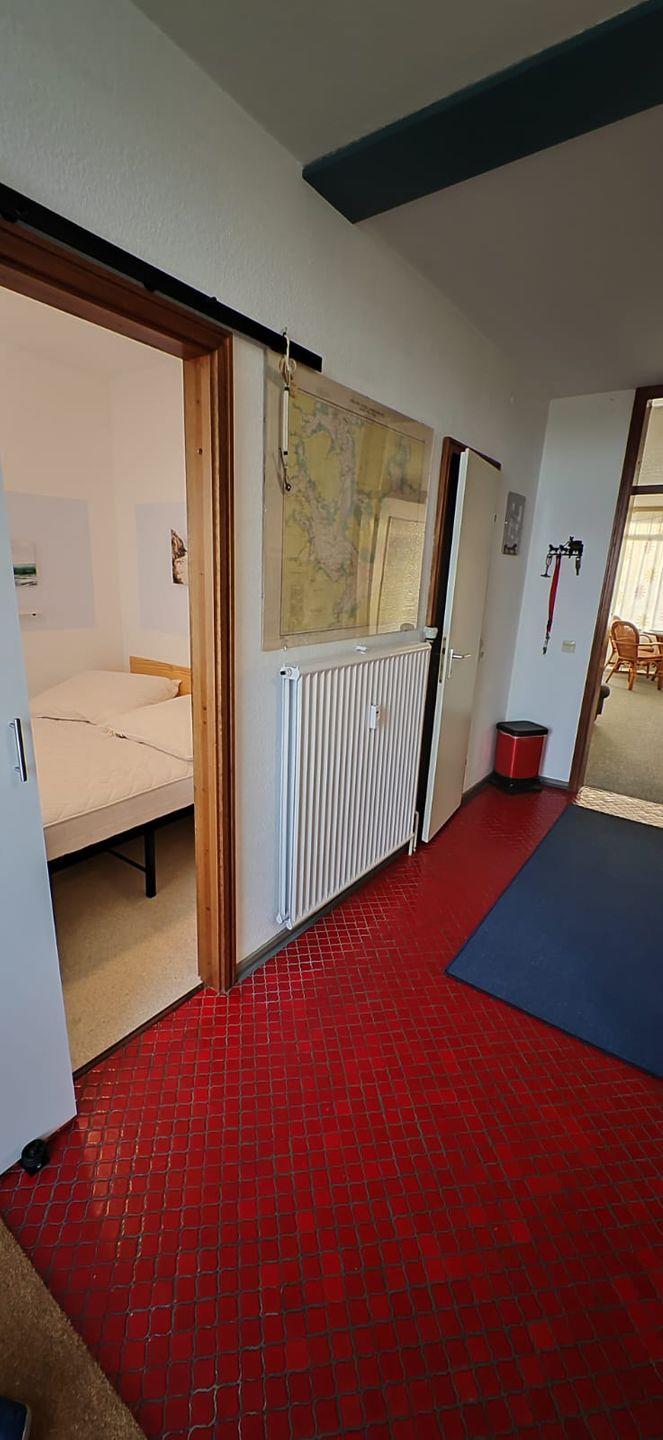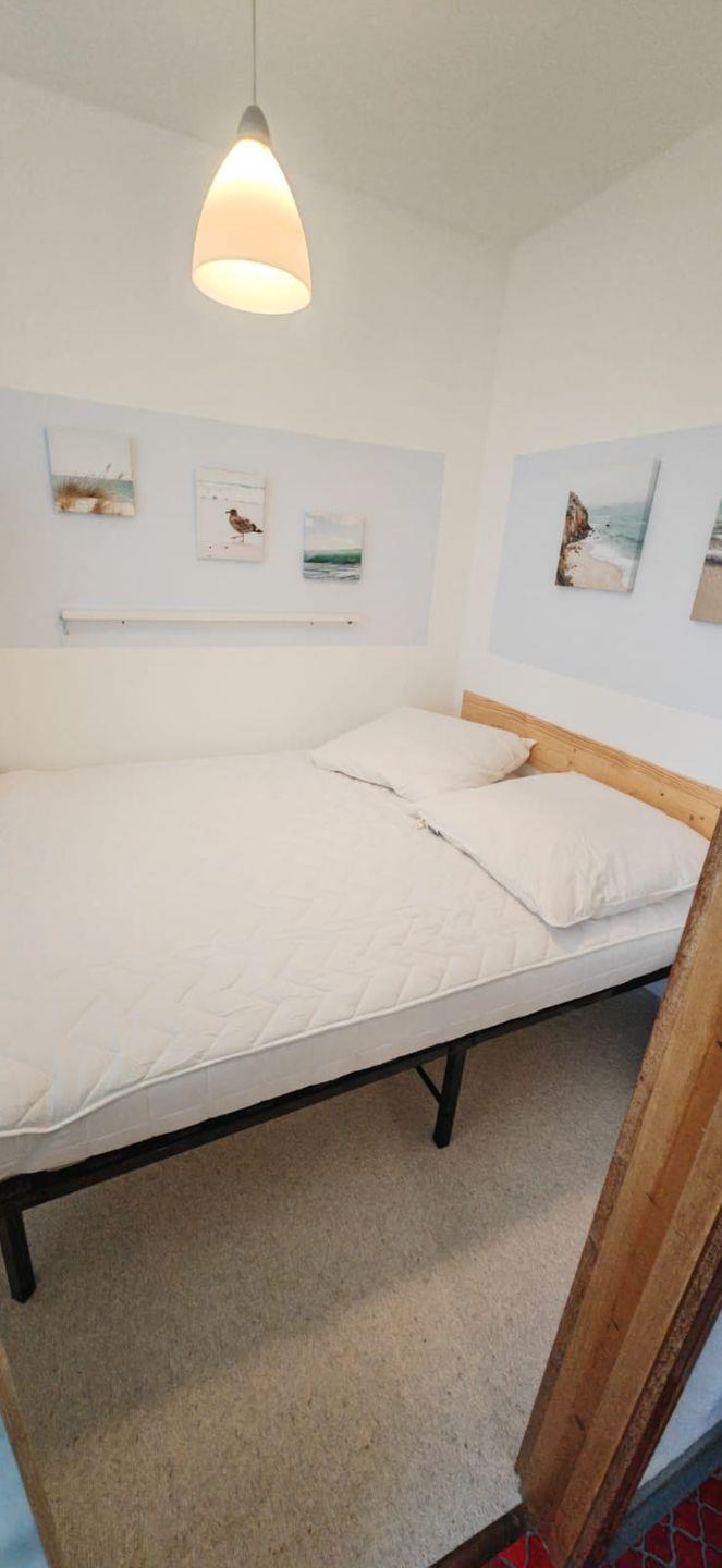 Gleich linksseitig finden Sie mit Fenster zum Laubengang das kleine Schlafzimmer mit einem Doppelbett für 2 Personen. Direkt daneben das Duschbad mit Dusche, Waschbecken, Toilette, etc.