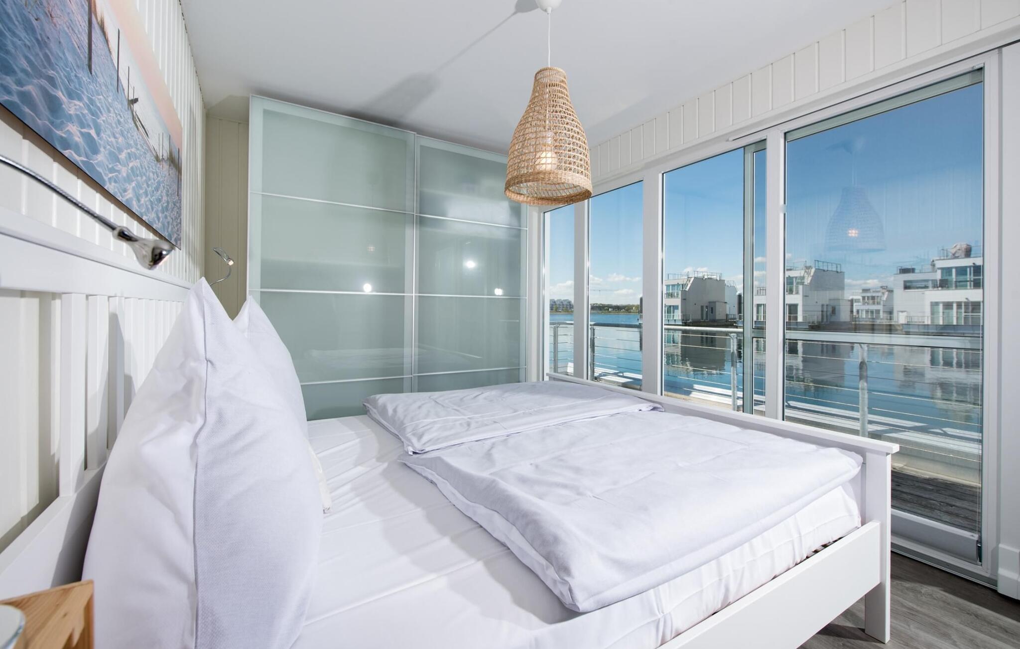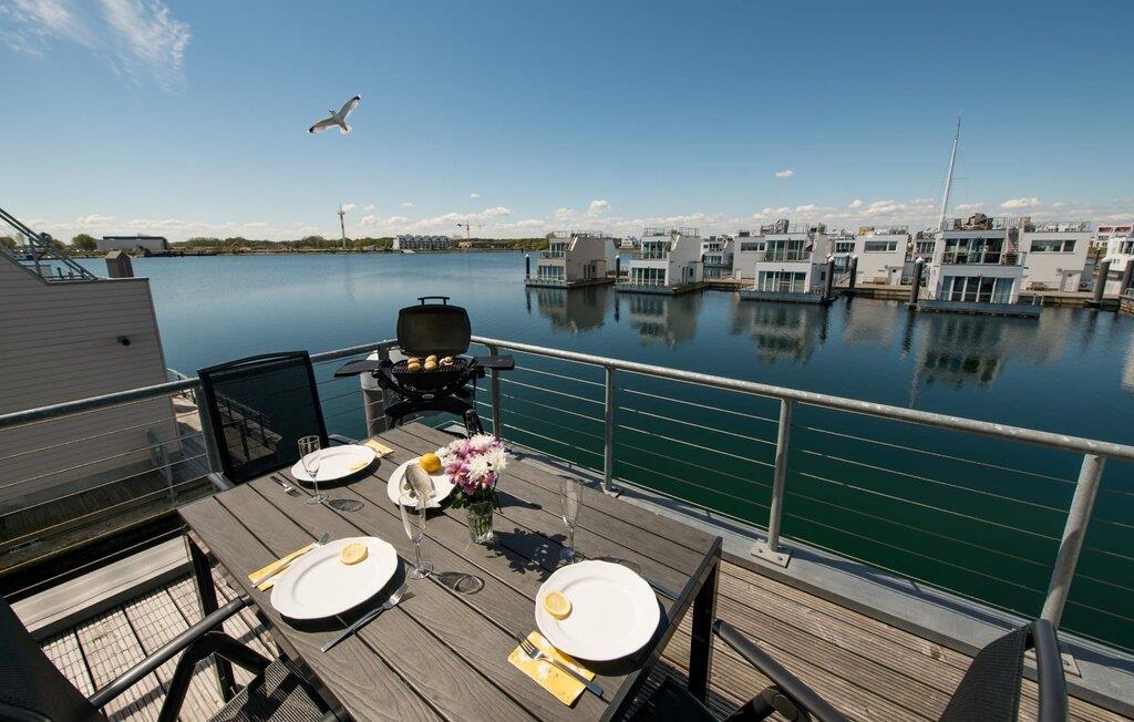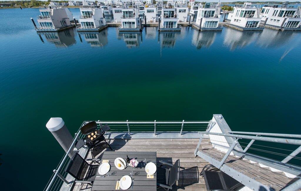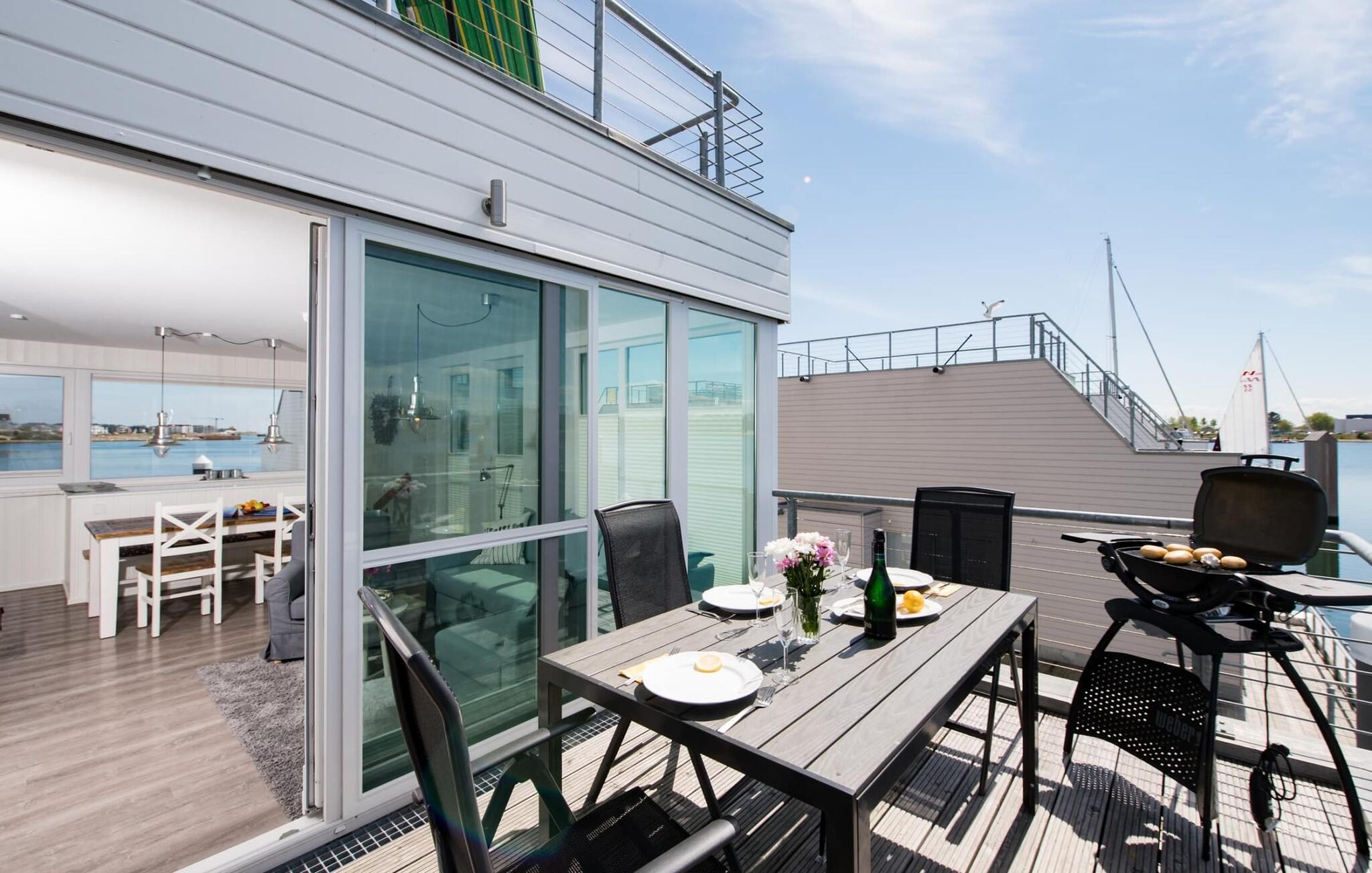 Dieses schwimmende Haus erstreckt sich über drei Ebenen und bietet sechs Personen Platz. Im Obergeschoss befindet sich der offen gestaltete Wohn- und Essbereich mit Rundum-Wasserblick, voll ausgestatteter Wohnküche und angrenzender Terrasse. Von hier aus gelangt man auf die spektakuläre Dachterrasse mit Blick über den Segel- und Sportboothafen, die Schlei und deren Mündung in die Ostsee. Ausgestattet mit hochwertigen Gartenmöbeln und Weber Elektrogrill bieten die Terrassen pures Urlaubsfeeling und atemberaubende Sonnenuntergänge.