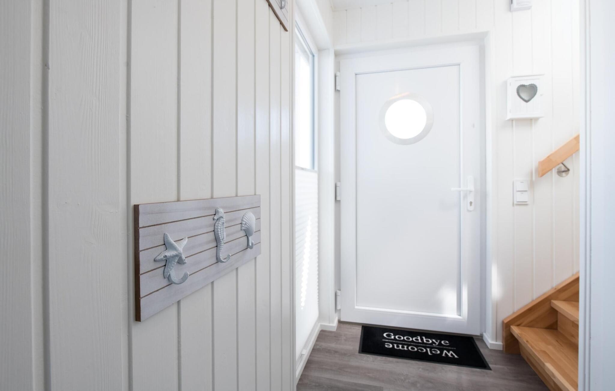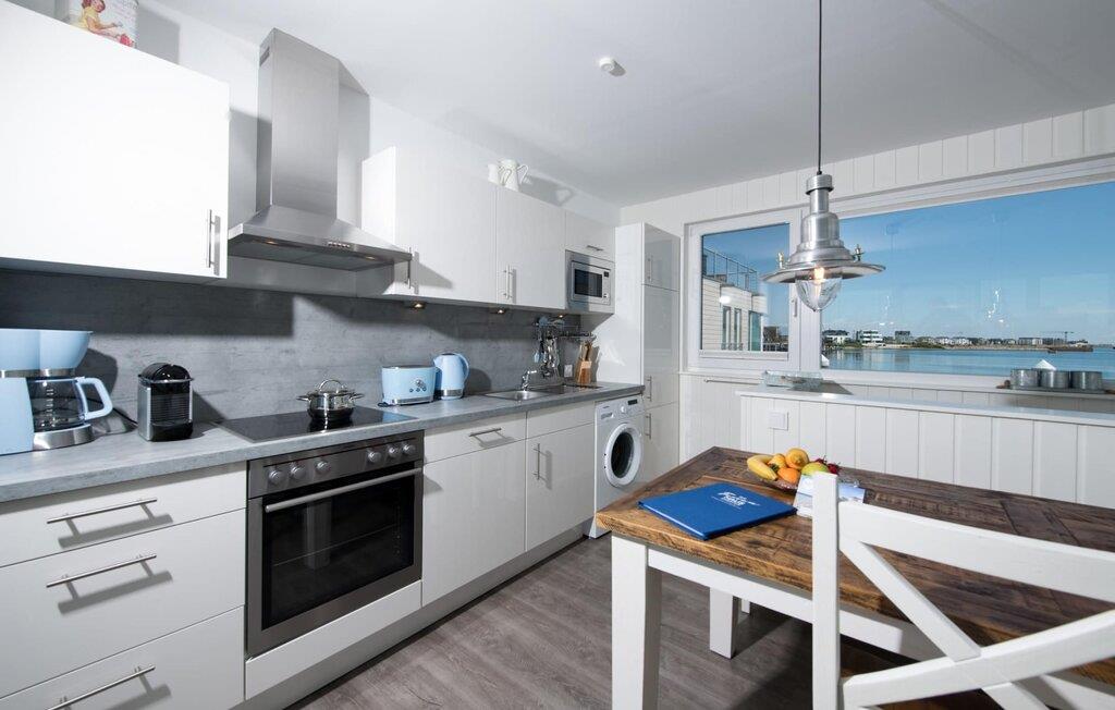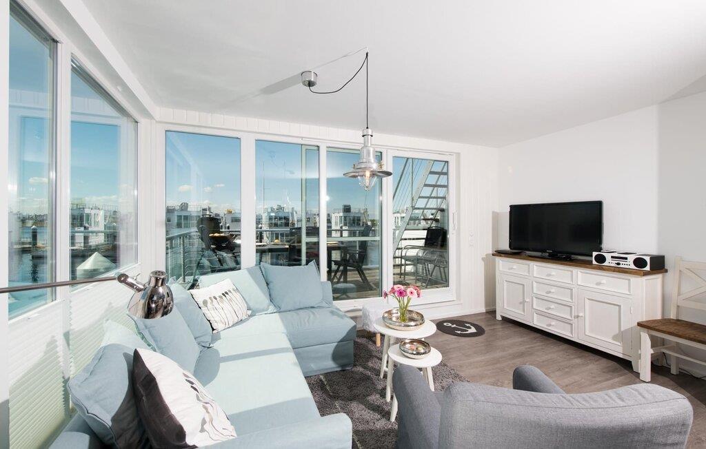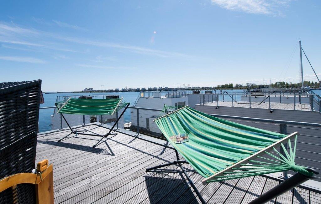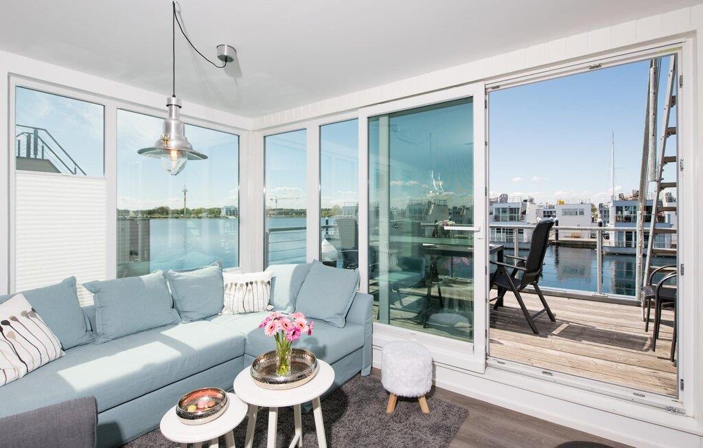 Dieses schwimmende Haus erstreckt sich über drei Ebenen und bietet sechs Personen Platz. Im Obergeschoss befindet sich der offen gestaltete Wohn- und Essbereich mit Rundum-Wasserblick, voll ausgestatteter Wohnküche und angrenzender Terrasse. Von hier aus gelangt man auf die spektakuläre Dachterrasse mit Blick über den Segel- und Sportboothafen, die Schlei und deren Mündung in die Ostsee. Ausgestattet mit hochwertigen Gartenmöbeln und Weber Elektrogrill bieten die Terrassen pures Urlaubsfeeling und atemberaubende Sonnenuntergänge.