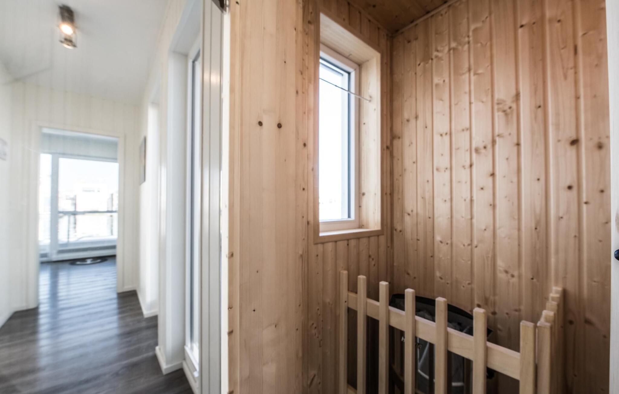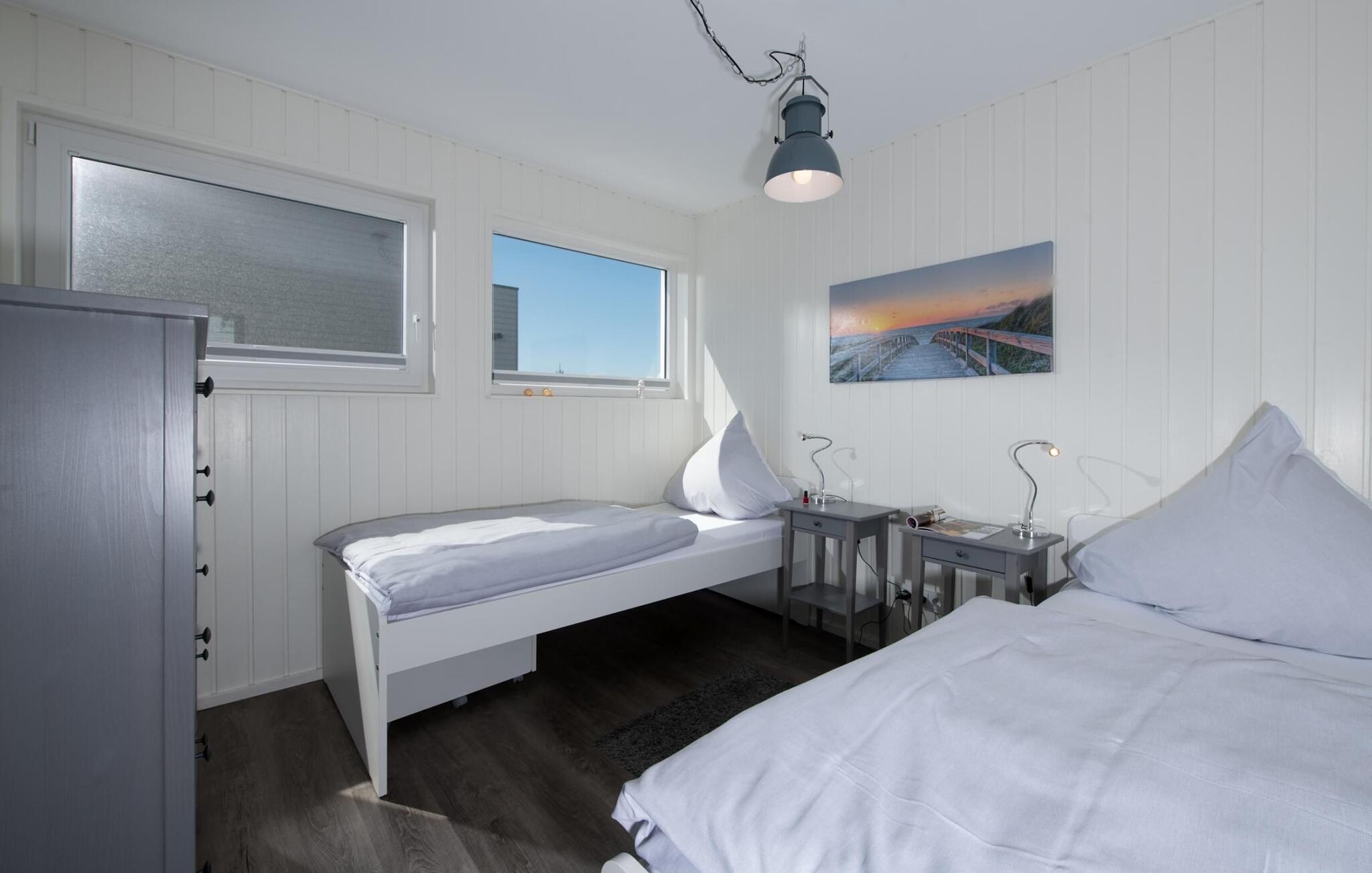 Der Ruhebereich des Hauses befindet sich im Erdgeschoss mit zwei Schlafzimmern, Badezimmer und Sauna. Das Hauptschlafzimmer punktet mit einer bodentiefen Panorama Fensterfront, durch welche sich die atemberaubende Wasserkulisse genießen lässt. Das Hauptschlafzimmer ist mit einem Doppelbett ausgestattet (180 x 200 cm), das zweite Schlafzimmer mit zwei Einzelbetten. Zwei weitere Schlafplätze befinden sich auf der komfortablen Schlafcouch im Wohnbereich.