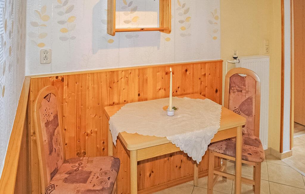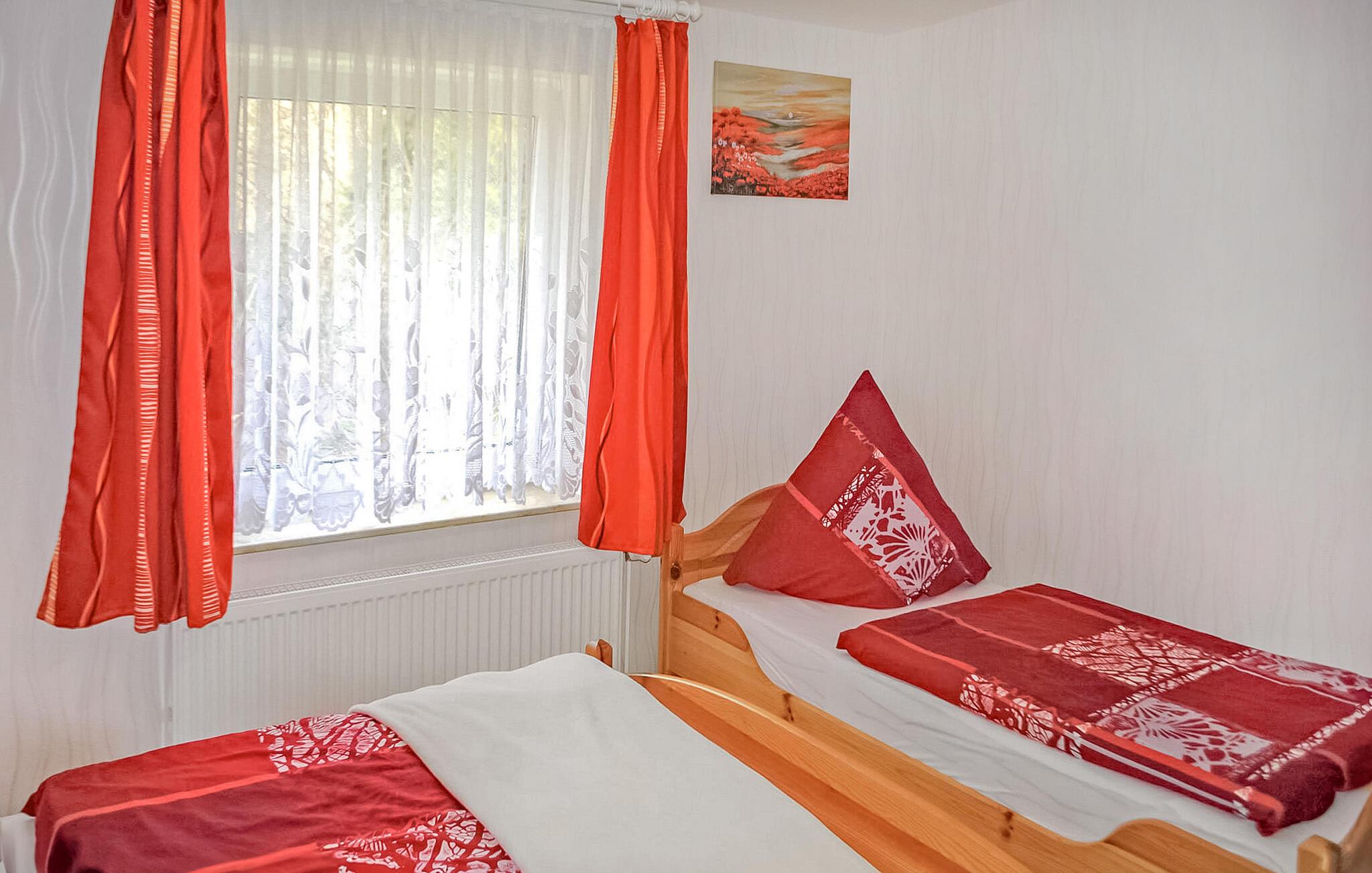 Diese Ferienwohnung mit separatem Eingang befindet sich im Erdgeschoss. Sie ist ausgestattet mit einem Wohnraum (Polstermöbel mit Schlaffunktion, TV, Radio/CD), einer Küche (E-Kochfeld, Minibackofen, Kühlschrank mit Tiefkühlfach, div. Küchengeräte), einem Schlafraum (Doppelbett, Einzelbetten), sowie einem Bad mit DU/WC und Waschmaschine (pro Waschgang 5 EUR). Die Wohnung ist zentral beheizbar.