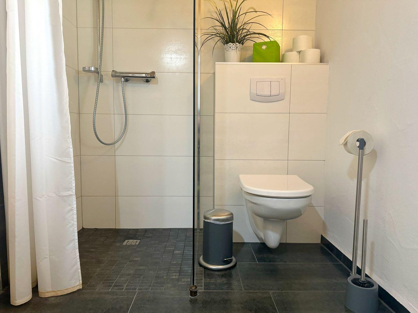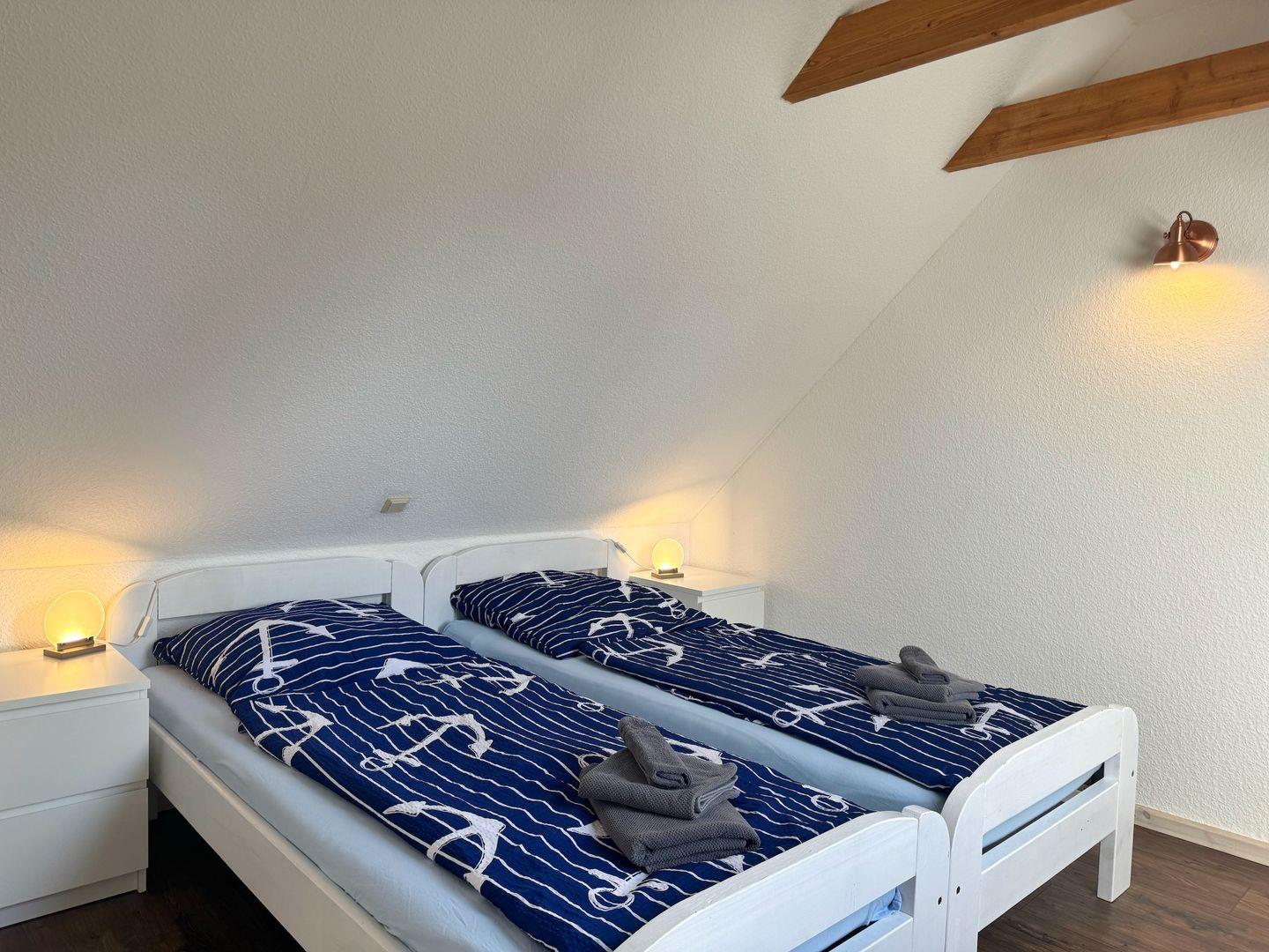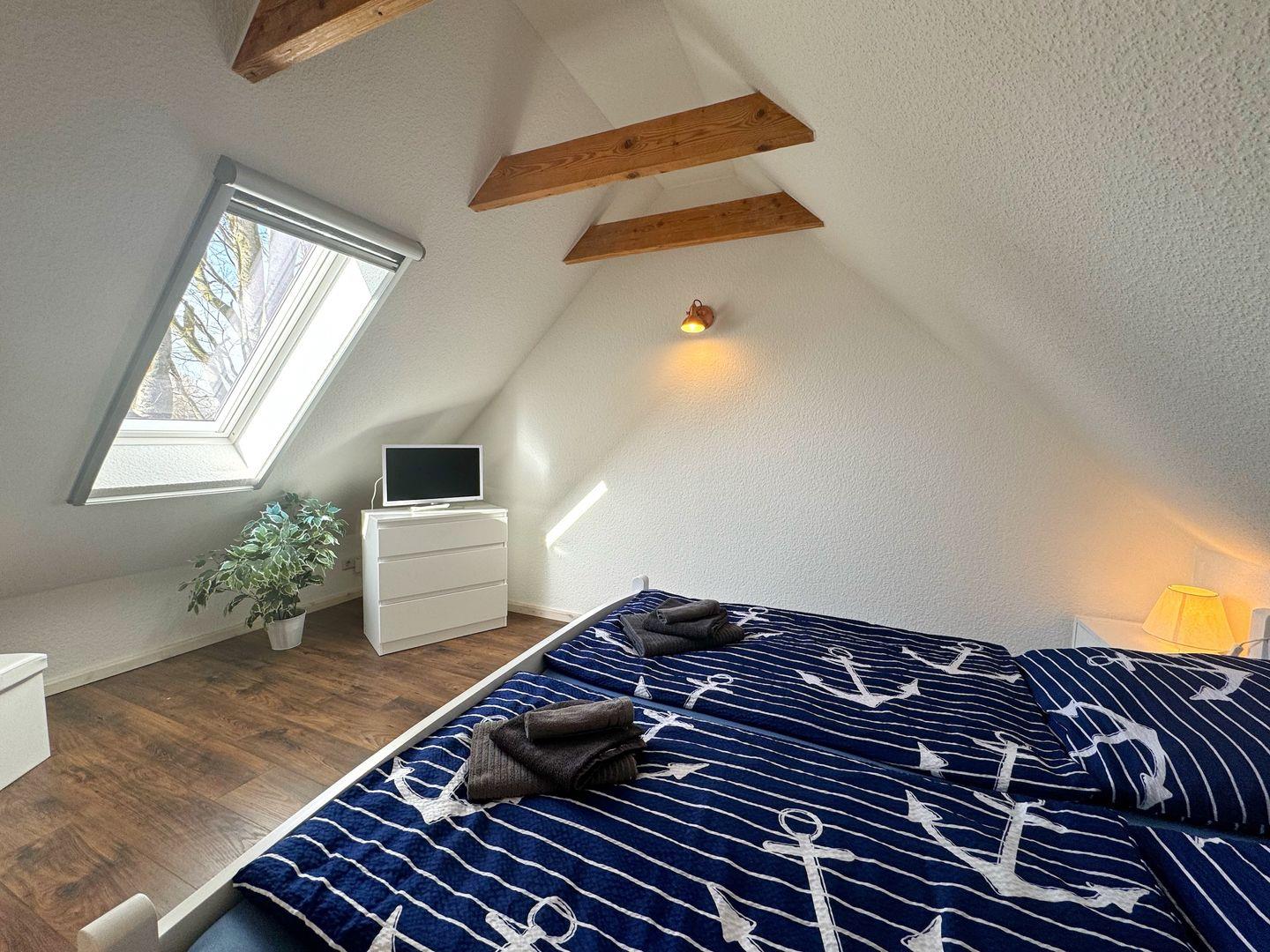 Das Erdgeschoss des charmanten Hauses gliedert sich in einem kleinen Eingangsbereich, ein Badezimmer mit Fenster, Waschbecken, WC und bodengleicher Dusche sowie einen gemütlichen Wohnbereich mit Sofa-Ecke, TV, Kaminofen und offener Küche. Die Küche ist mit einem Ceran-Herd, Backofen, Kühlschrank mit Gefriermöglichkeit, Spülmaschine sowie mit Kaffeemaschine, Wasserkocher und Toaster ausgestattet. Über den Wohnbereich gelangen Sie auf die nach Osten ausgerichtete teilweise überdachte Terrasse, die zum Verweilen einlädt. Im Obergeschoss des Ferienhauses gibt 2 helle Schlafzimmer, eines mit einem Doppelbett und das andere mit 2 Einzelbetten. j
