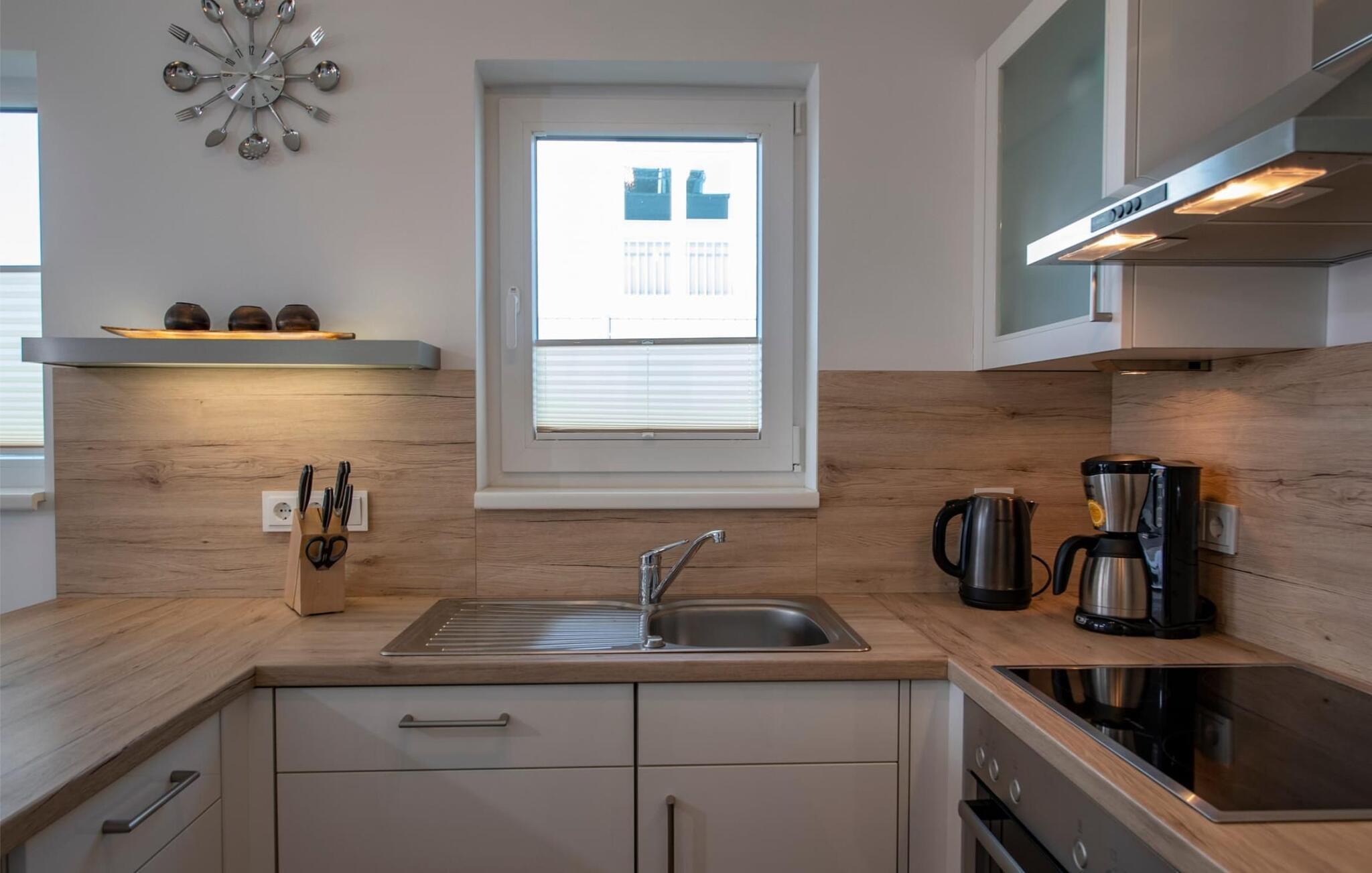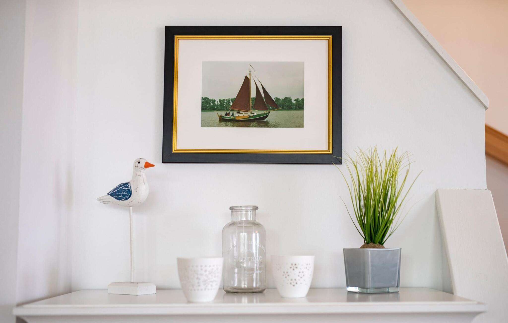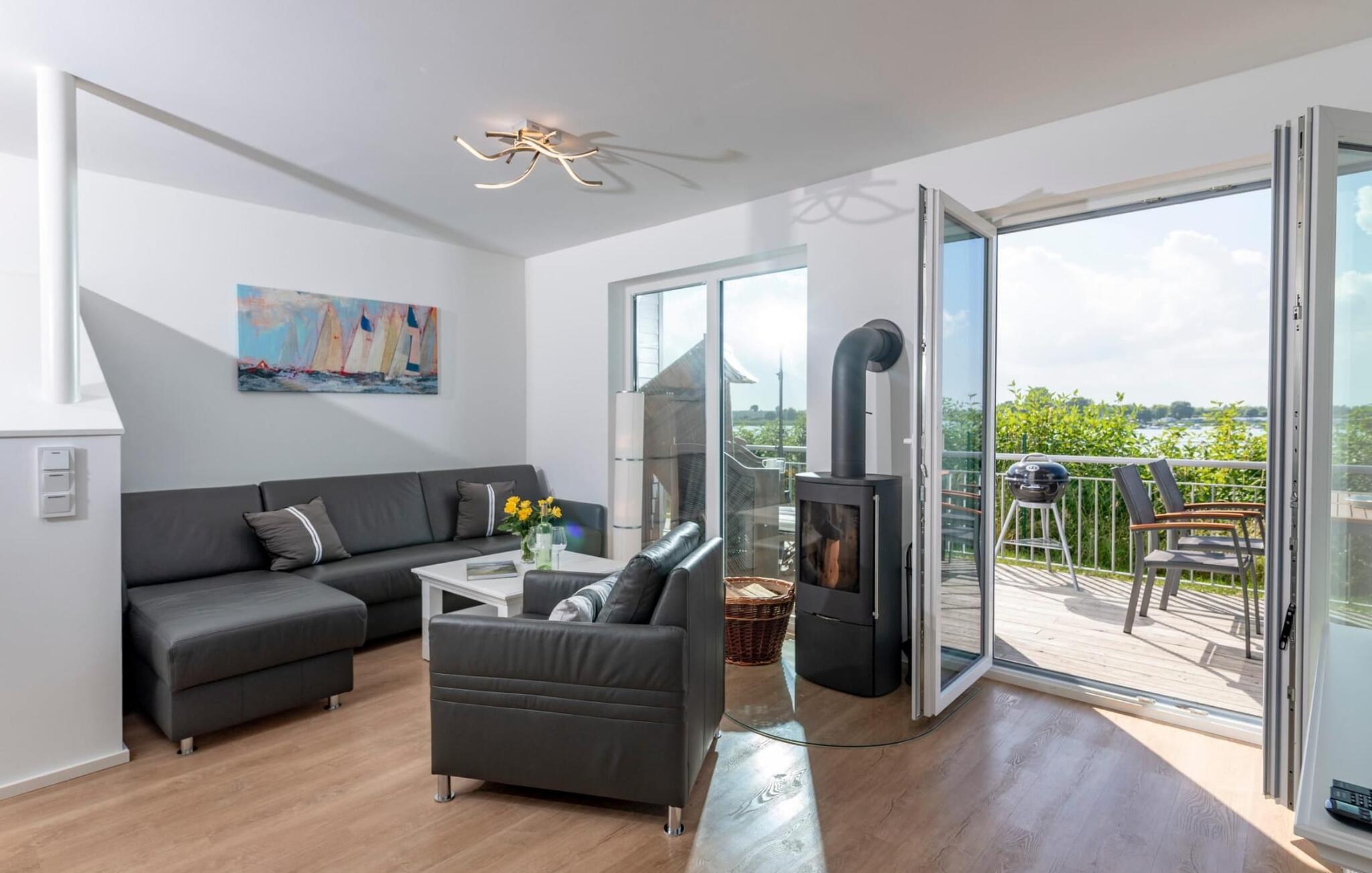 Der offene Wohn- /Essbereich im Erdgeschoss des Ferienhauses Kluntje überzeugt mit bodentiefen Fenstern, durch welche sich direkt auf die Terrasse und die dahinter liegende Schlei blicken lässt. Eine gemütliche Sitzlandschaft, Kaminofen und der Esstisch für sechs Personen laden hier zum Beisammensein vorm Kaminofen ein, während sich in der offenen Küche Urlaubsmahlzeiten zaubern lassen. Die Ausstattung lässt hierbei keine Wünsche offen. Durch die Fensterfront des Wohnzimmers lassen sich Segelschiffe beobachten, während die Terrasse mit Strandkorb traumhafte Sonnenuntergänge bietet.