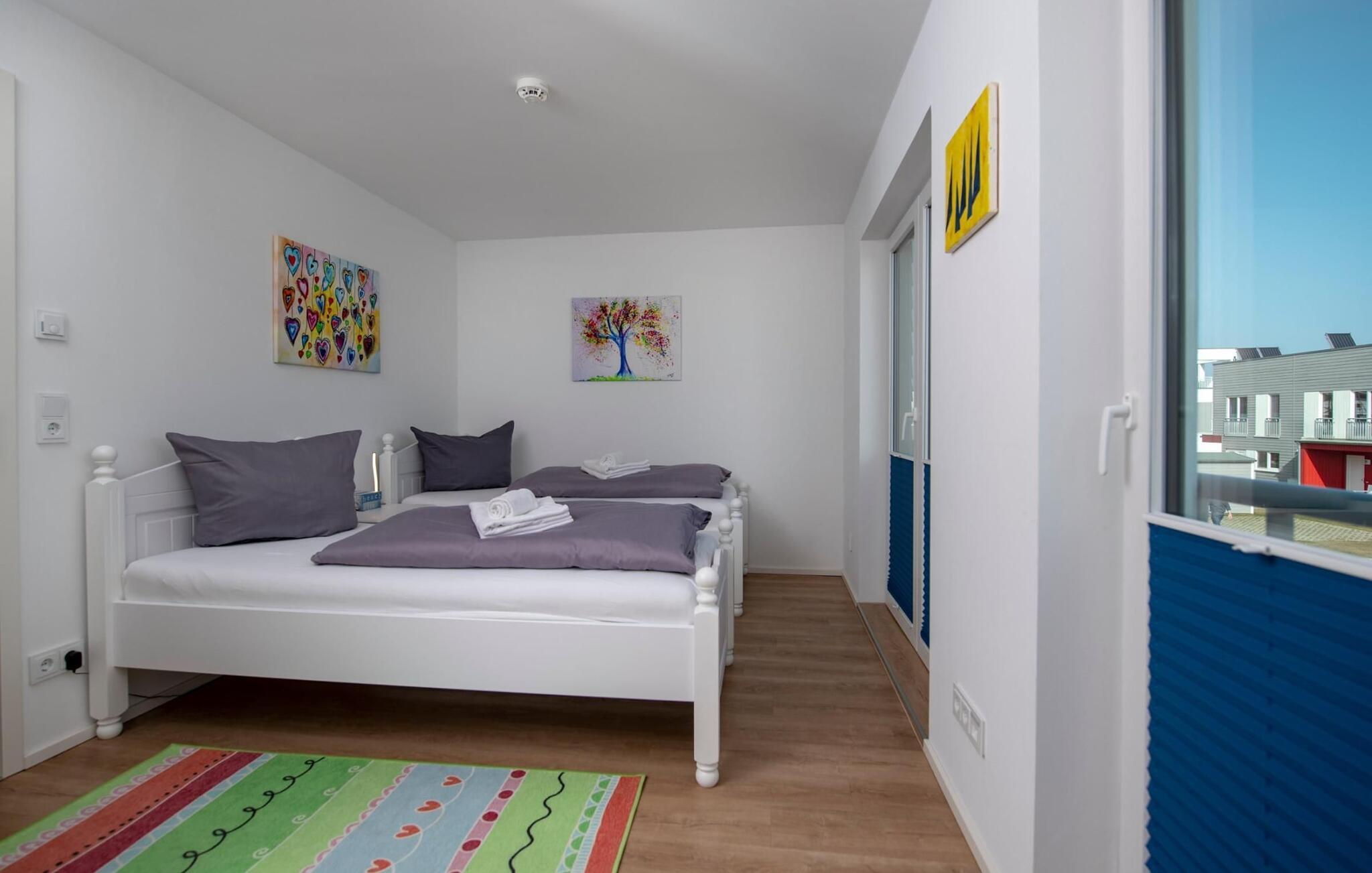 Zwei Schlafzimmer im ersten Obergeschoss bieten Platz für vier Erwachsene. Das Hauptschlafzimmer verfügt hierbei neben einem traumhaften Wasserblick auch über eine Terrasse zur Schleiseite, von der eine Außentreppe auf die große Dachterrasse führt. Das zweite Schlafzimmer ist nach Osten hin ausgerichtet erlaubt einen Blick über den Segel- und Sportboothafen des Ostseeresorts. Zwei weitere Schlafplätze stehen im Wohnzimmer auf einem komfortablen Schlafsofa zur Verfügung.