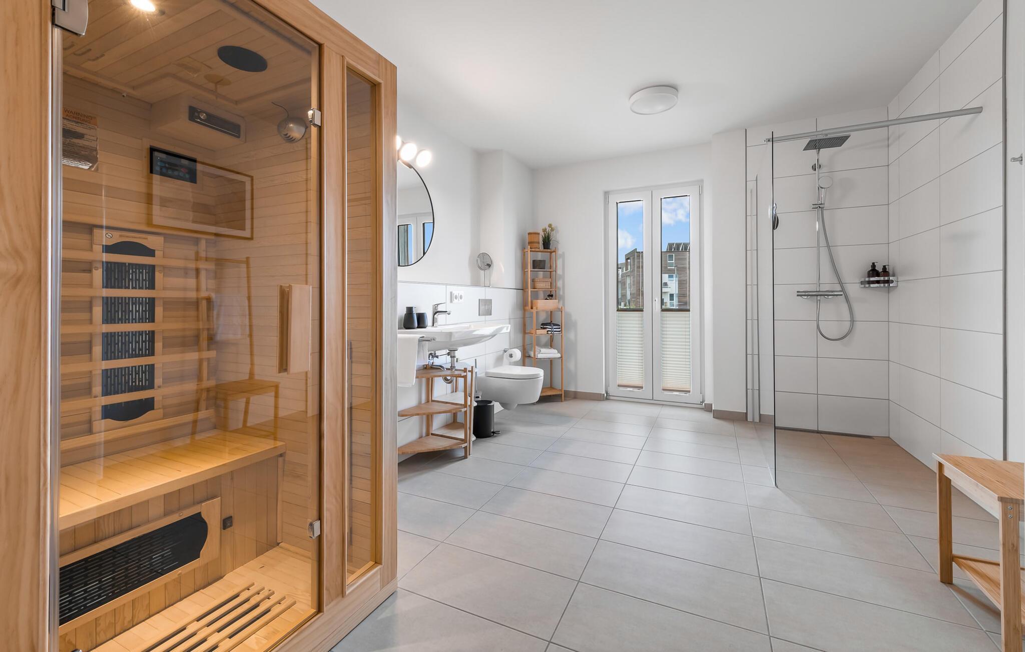 Ein weiteres Highlight ist das Duschbad. Neben allem Nützlichen warten hier eine bodengleiche Dusche und eine Infrarotkabine darauf, die Gäste zu verwöhnen. Sei es nach einem Tag auf stürmischer See oder nach einem ausgiebigen Strandtag. Hier findet ihr ebenfalls eine Waschmaschine.