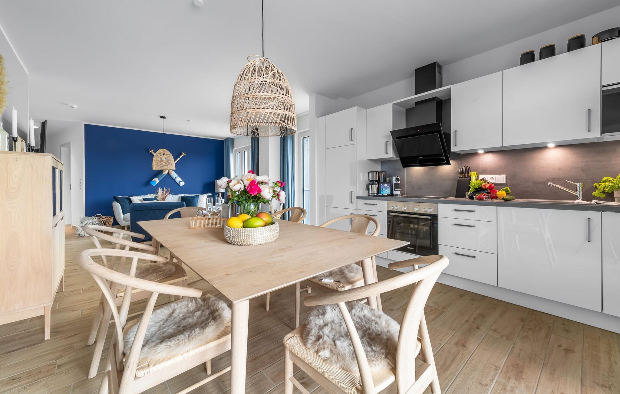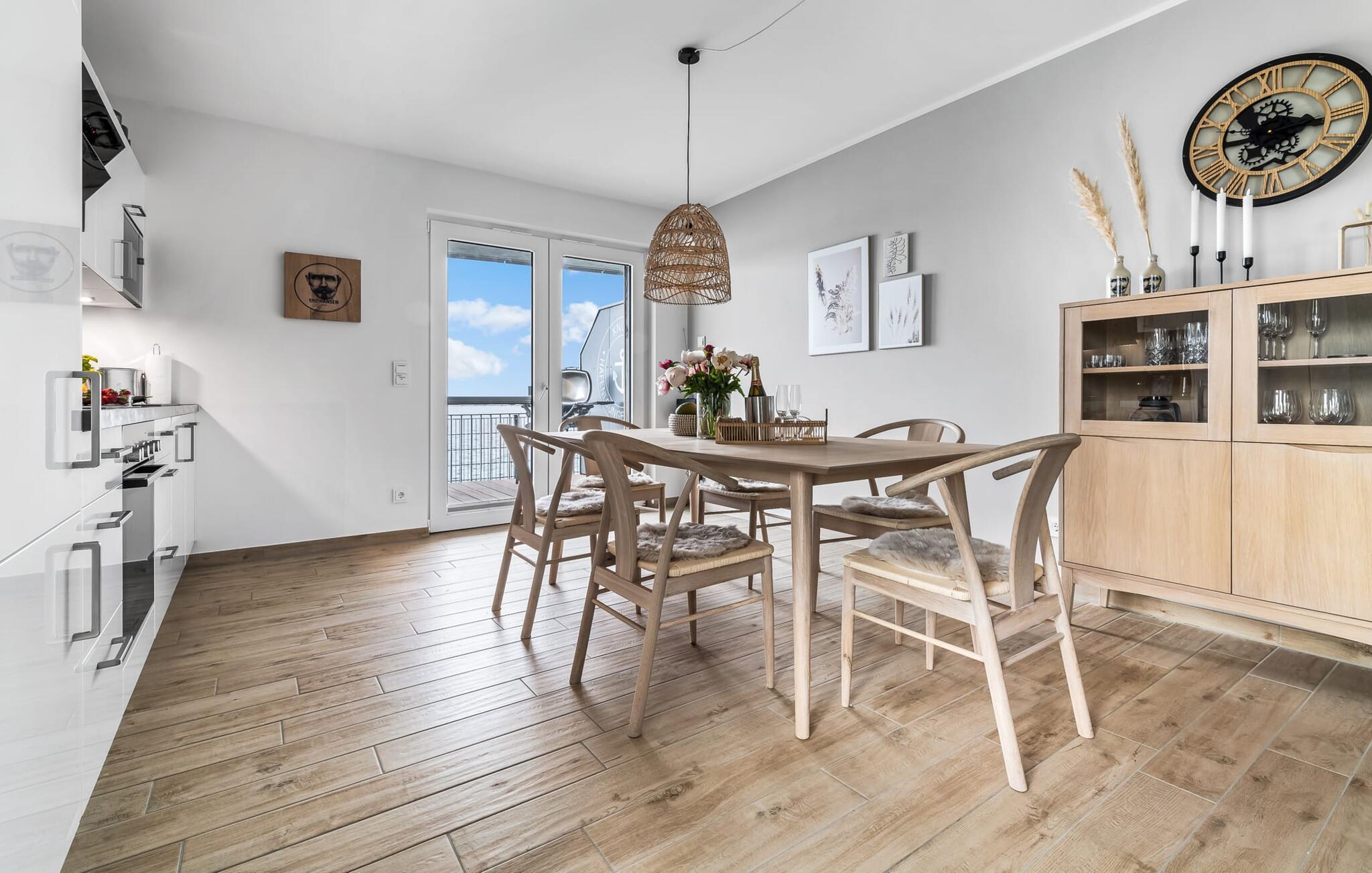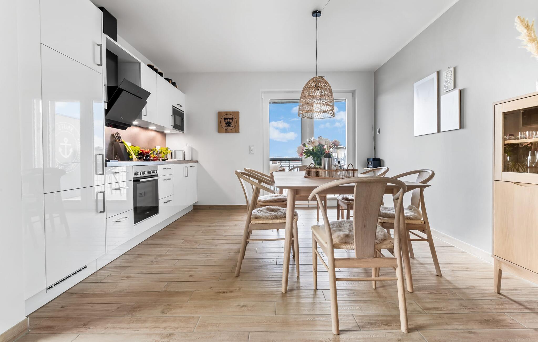 Die voll ausgestattete Küchenzeile lässt keine Wünsche offen und weckt die Lust, gemeinsam Leckereien zuzubereiten, um sie dann gemeinsam am Esstisch oder auf der Terrasse zu genießen. Und der Hafenblick ist immer begleitend dabei.