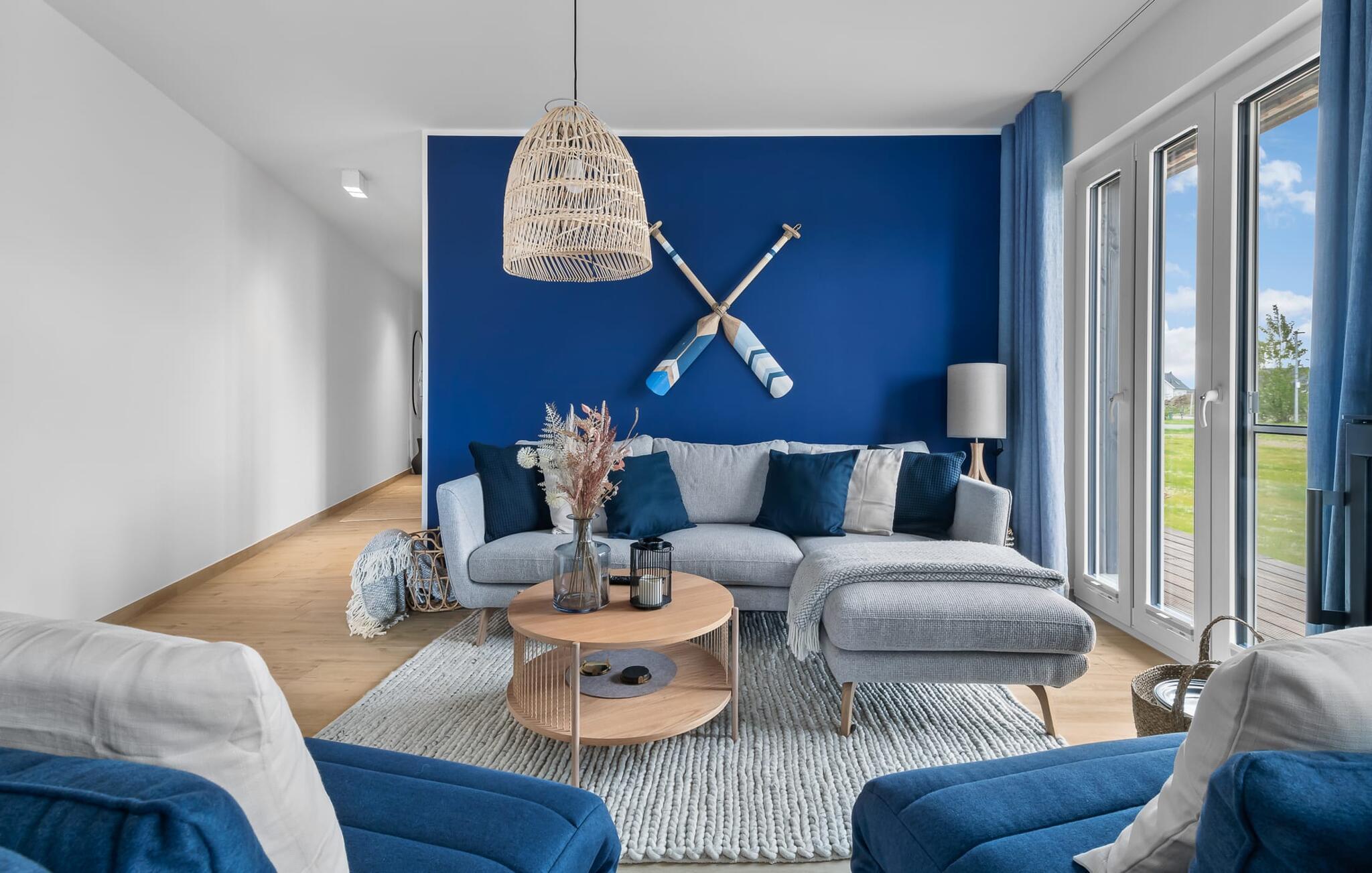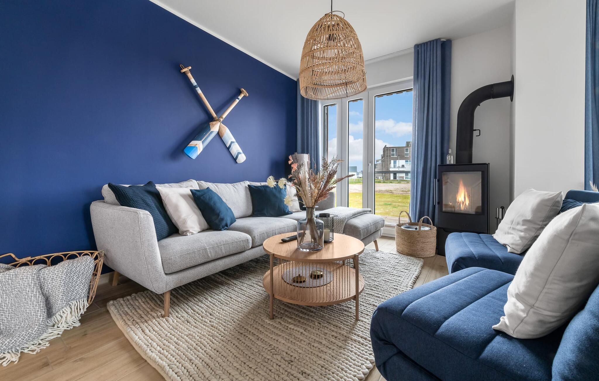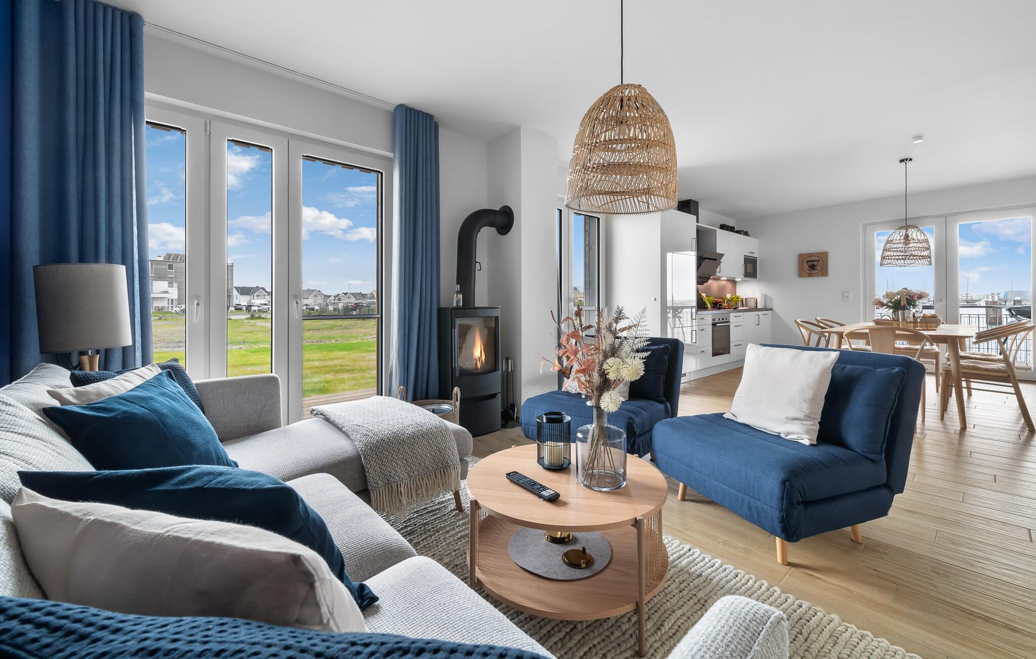 Im nordisch-maritinem Wohnbereich dominiert die bequeme Wohnlandschaft mit Fernseher und Kaminofen, dem es gelingt, selbst bei klassisch norddeutschem Wetter für Kuschelstimmung zu sorgen. Der gehobene skandinavische Einrichtungsstil mit Boho-Akzenten ist genau das Richtige für echte Fans des hohen Nordens. Und für Fans des Sports steht ein Indoor-Wasser-Rudergerät zur Verfügung.