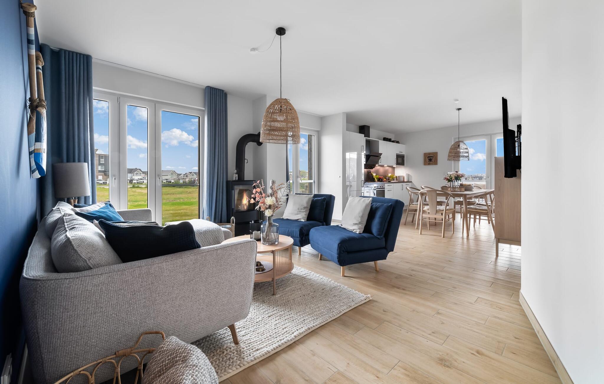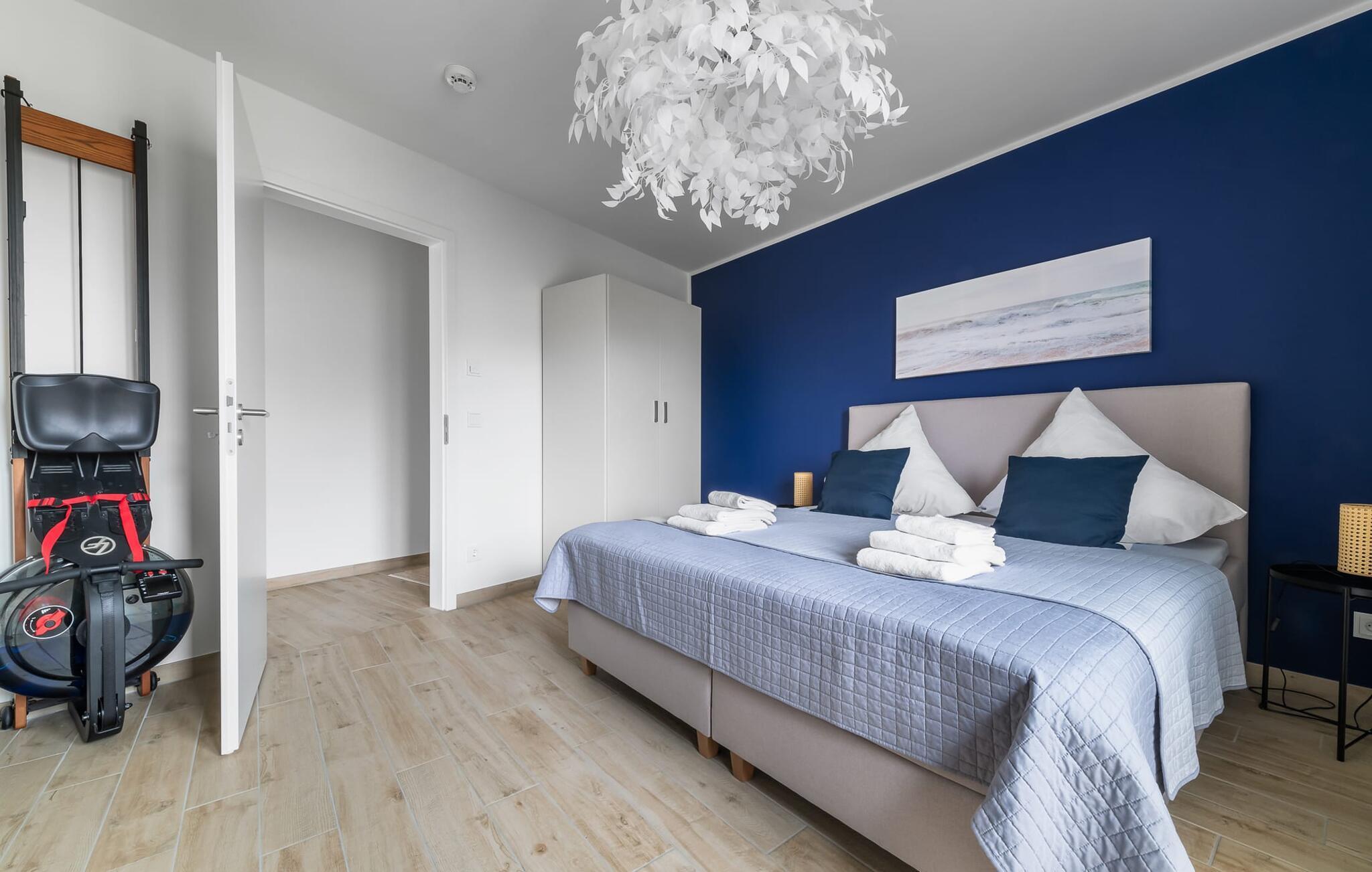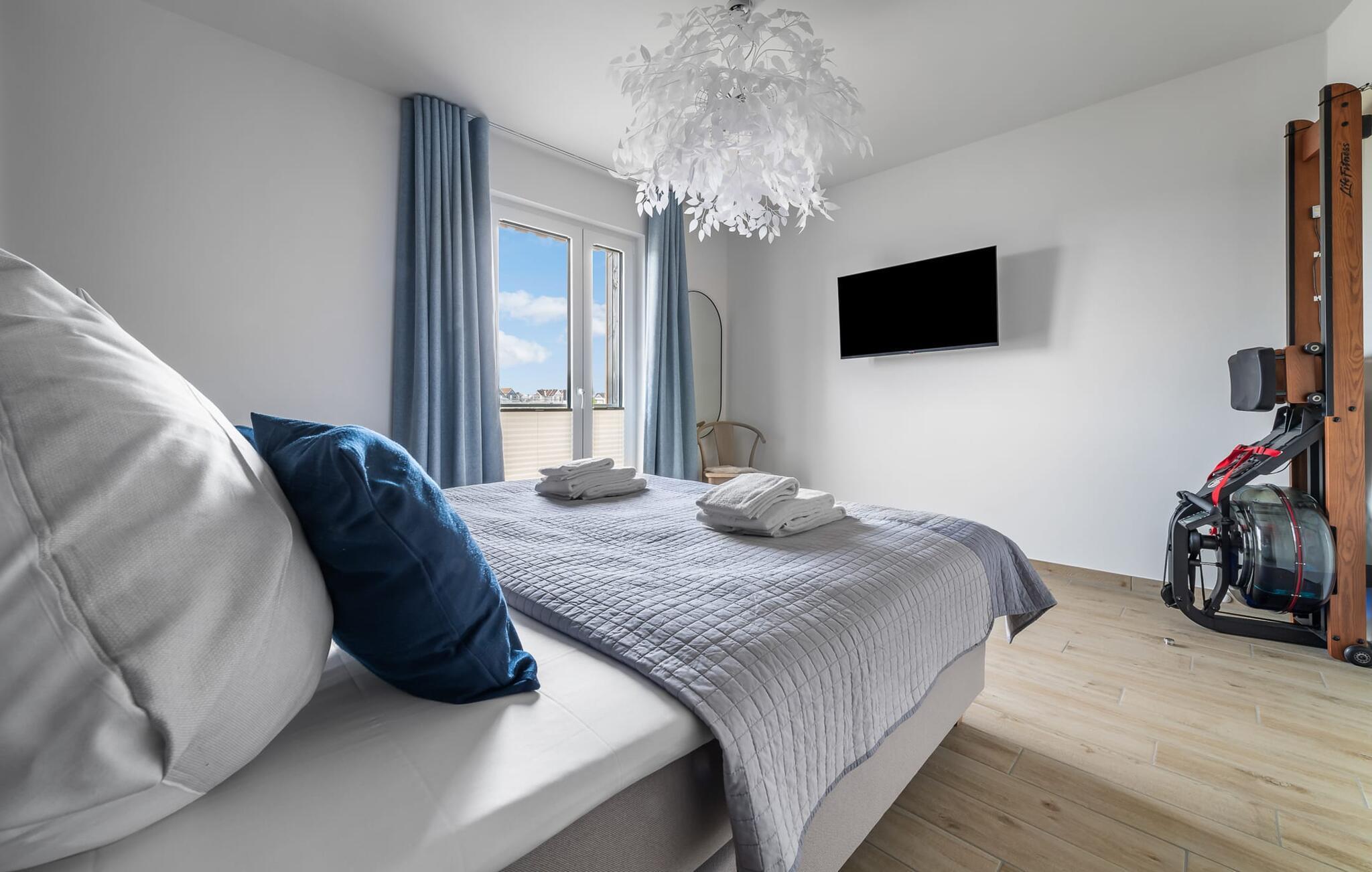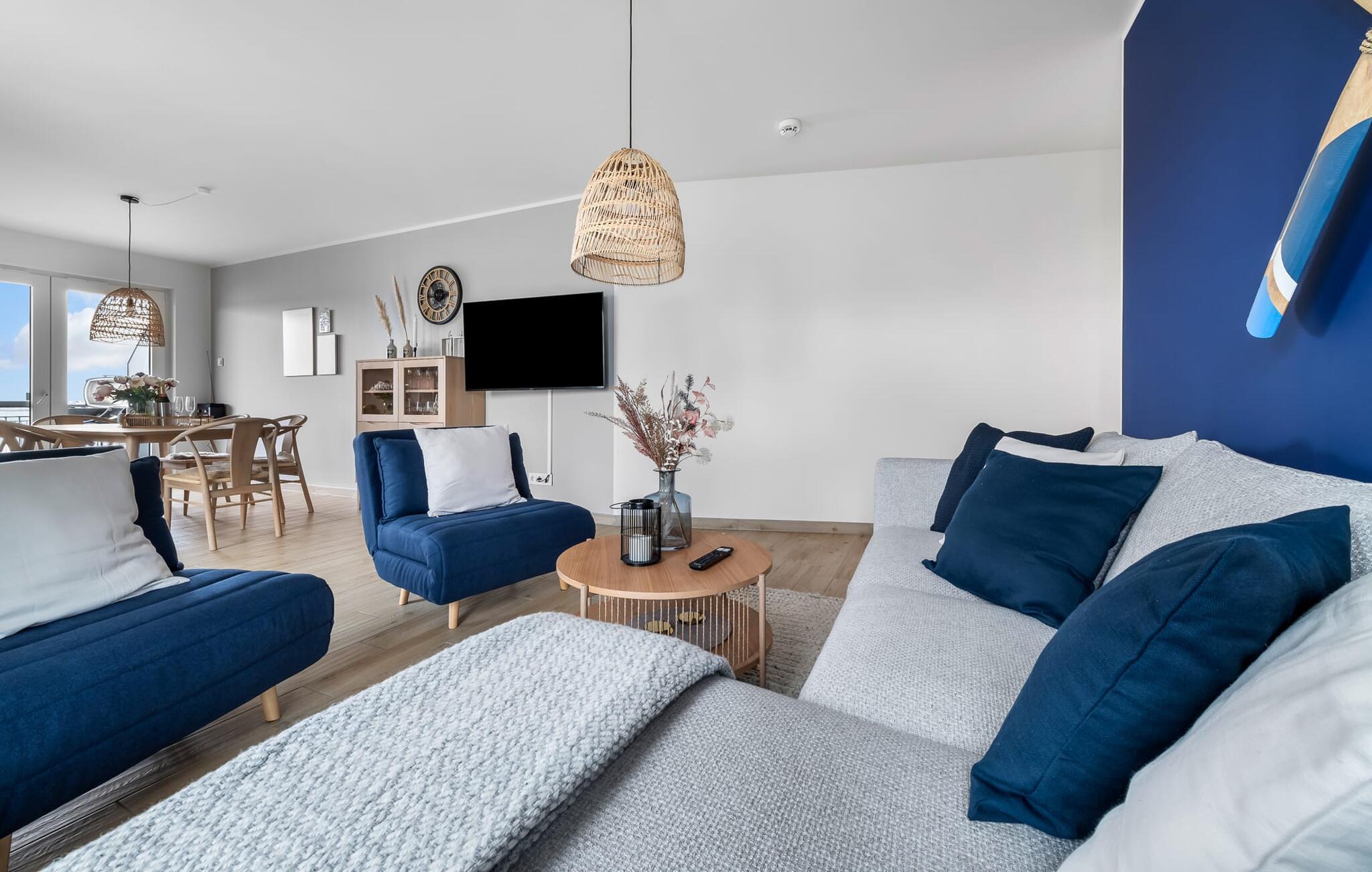 Im nordisch-maritinem Wohnbereich dominiert die bequeme Wohnlandschaft mit Fernseher und Kaminofen, dem es gelingt, selbst bei klassisch norddeutschem Wetter für Kuschelstimmung zu sorgen. Der gehobene skandinavische Einrichtungsstil mit Boho-Akzenten ist genau das Richtige für echte Fans des hohen Nordens. Und für Fans des Sports steht ein Indoor-Wasser-Rudergerät zur Verfügung.